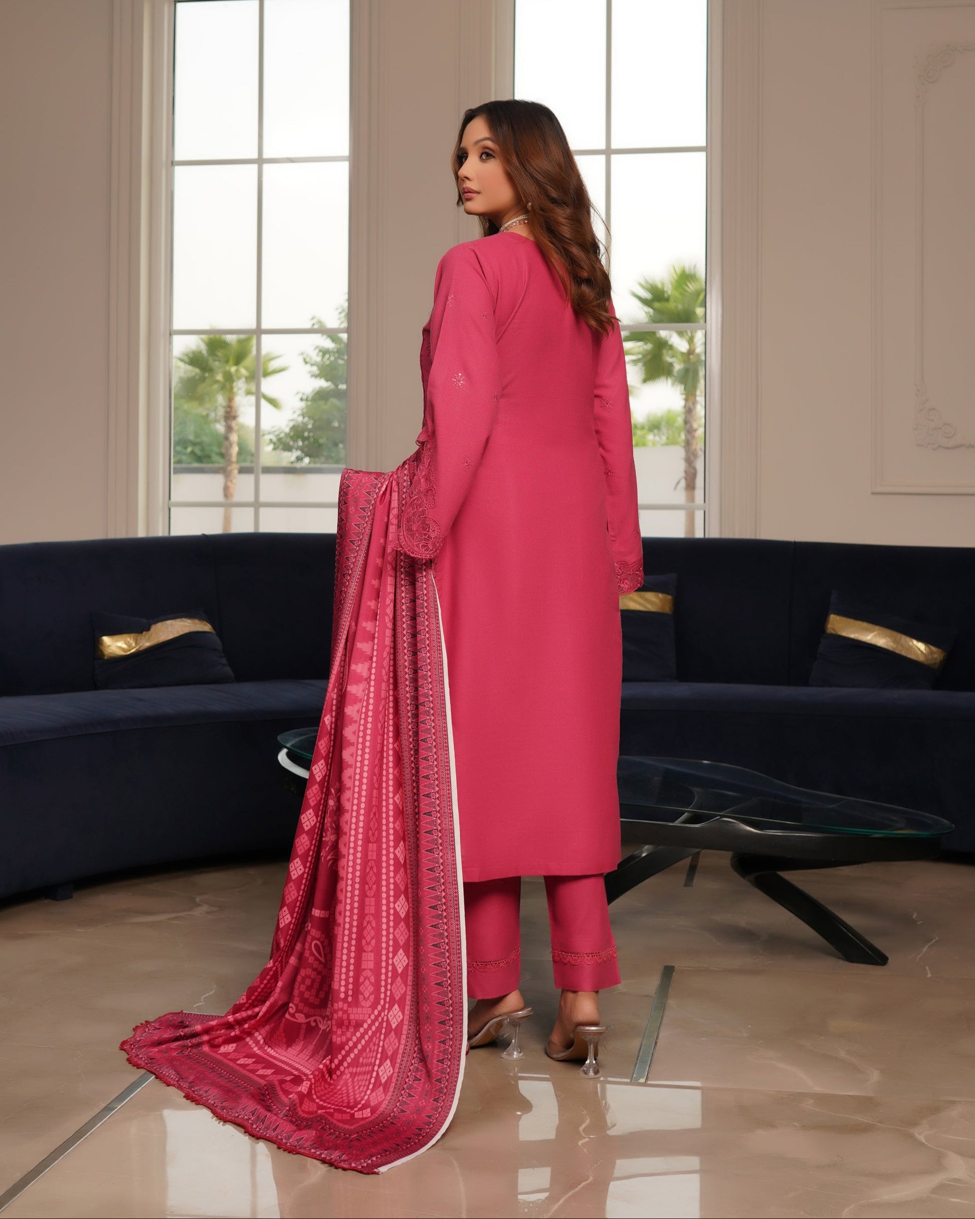 A beautifully crafted Dhanak outfit featuring elegant patch and border work on the neckline and sleeves, giving it a timeless winter charm. Paired with a matching Dhanak trouser for a complete, cozy look. The printed wool shawl adds warmth and style, making it perfect for chilly festive days.