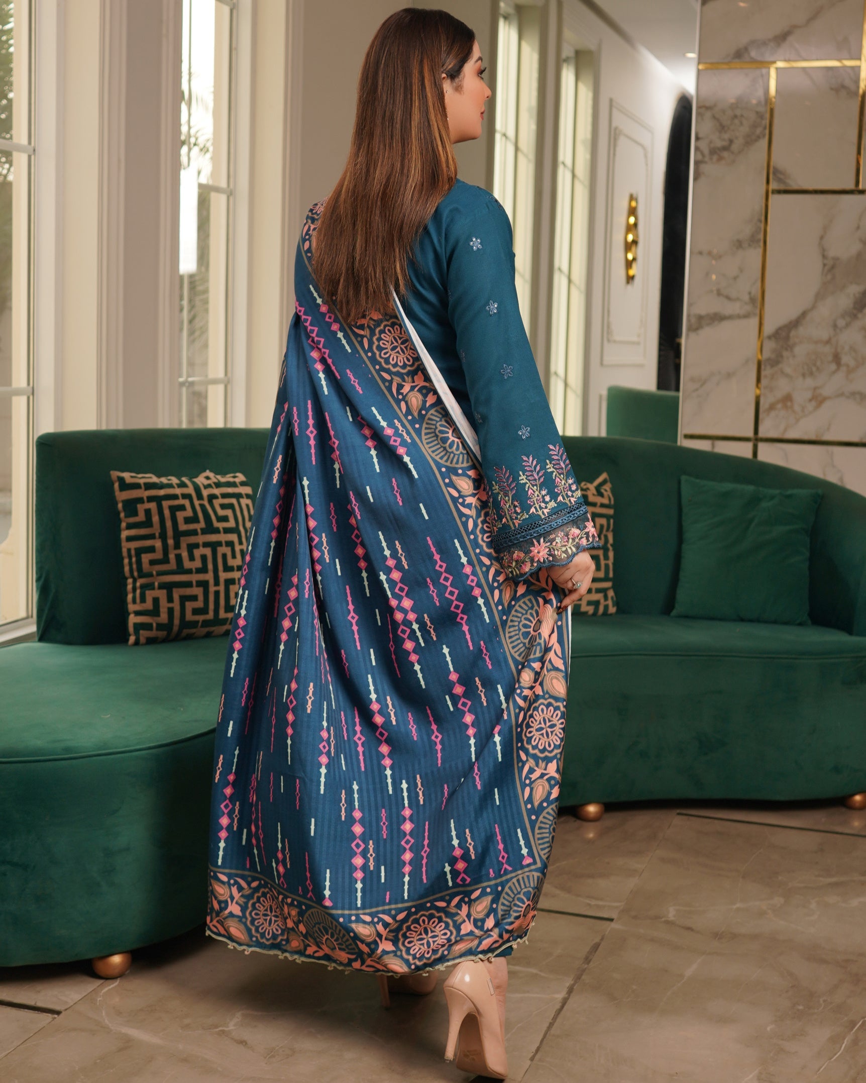 A beautifully crafted Dhanak outfit featuring elegant patch and border work on the neckline and sleeves, giving it a timeless winter charm. Paired with a matching Dhanak trouser for a complete, cozy look. The printed wool shawl adds warmth and style, making it perfect for chilly festive days.