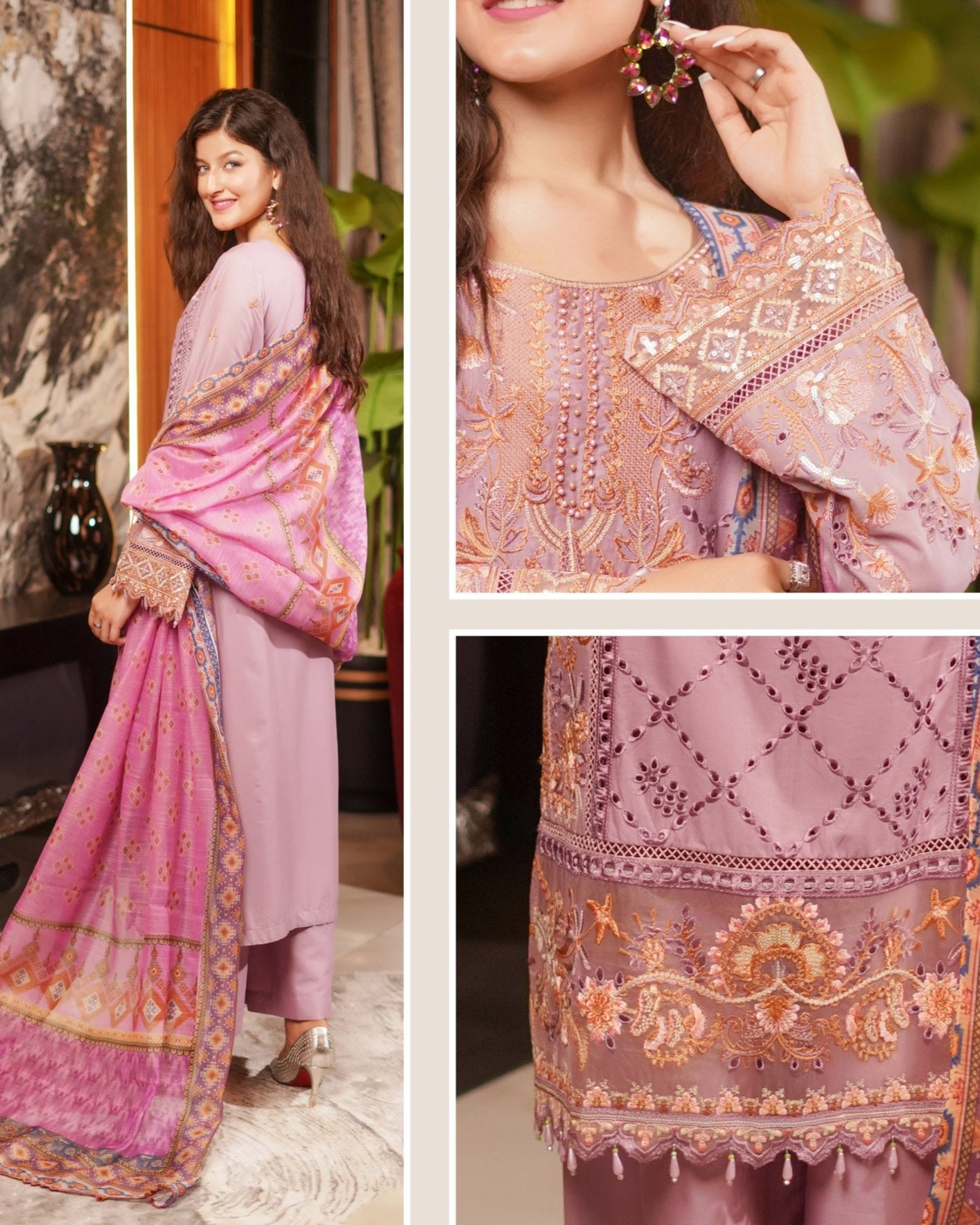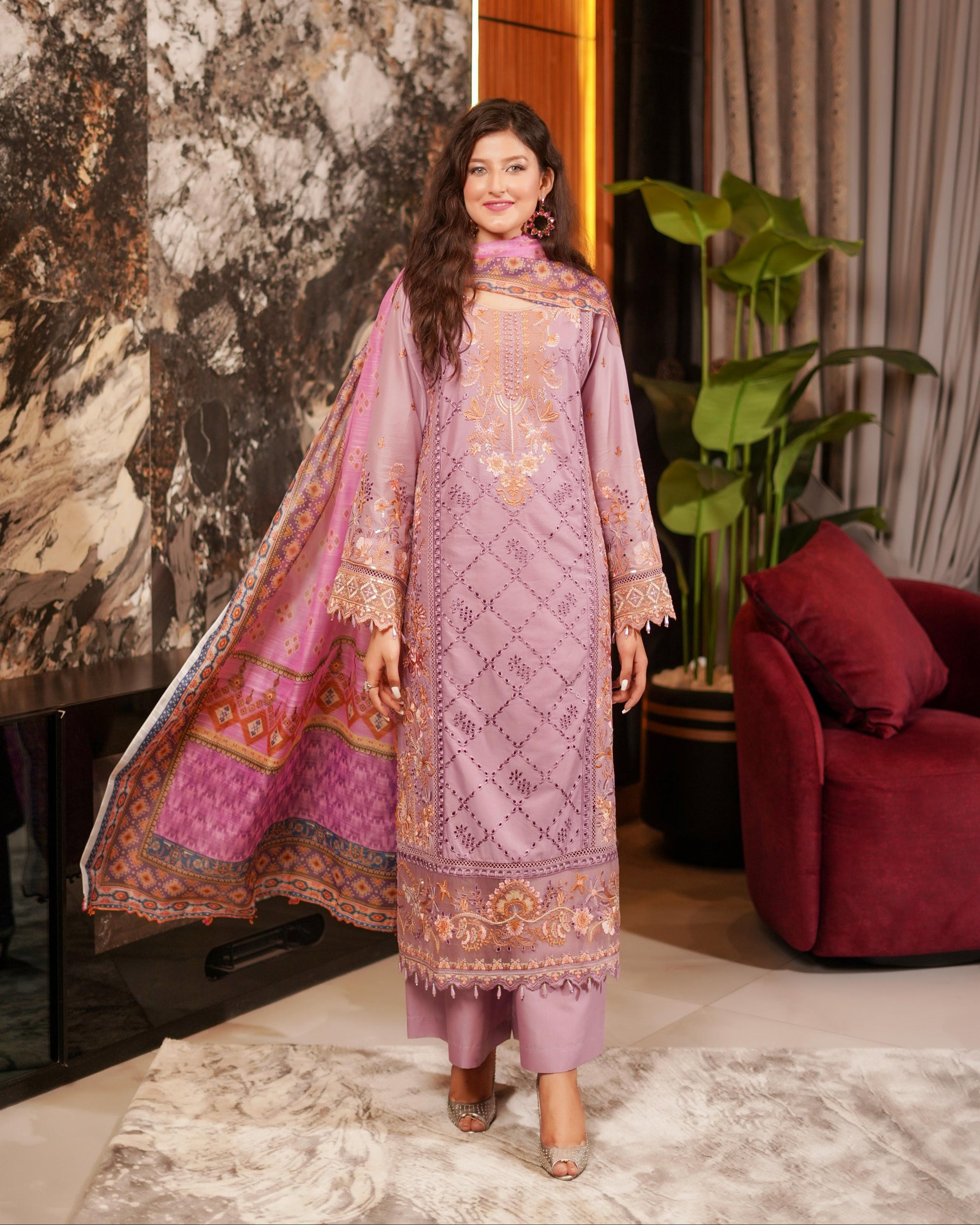 Discover the perfect look. Its intriguing details make it a must-have for any wardrobe. Designed for comfort and style, you'll feel confident and fashionable every time you wear it. Upgrade your look today with this outfit. This elegant 3PC set features a cotton shirt adorned with heavy embroidery, boring, and sequin work, paired with a munaar dupatta and cotton flapper trousers — offering a blend of tradition and glamour that’s perfect for festive gatherings.