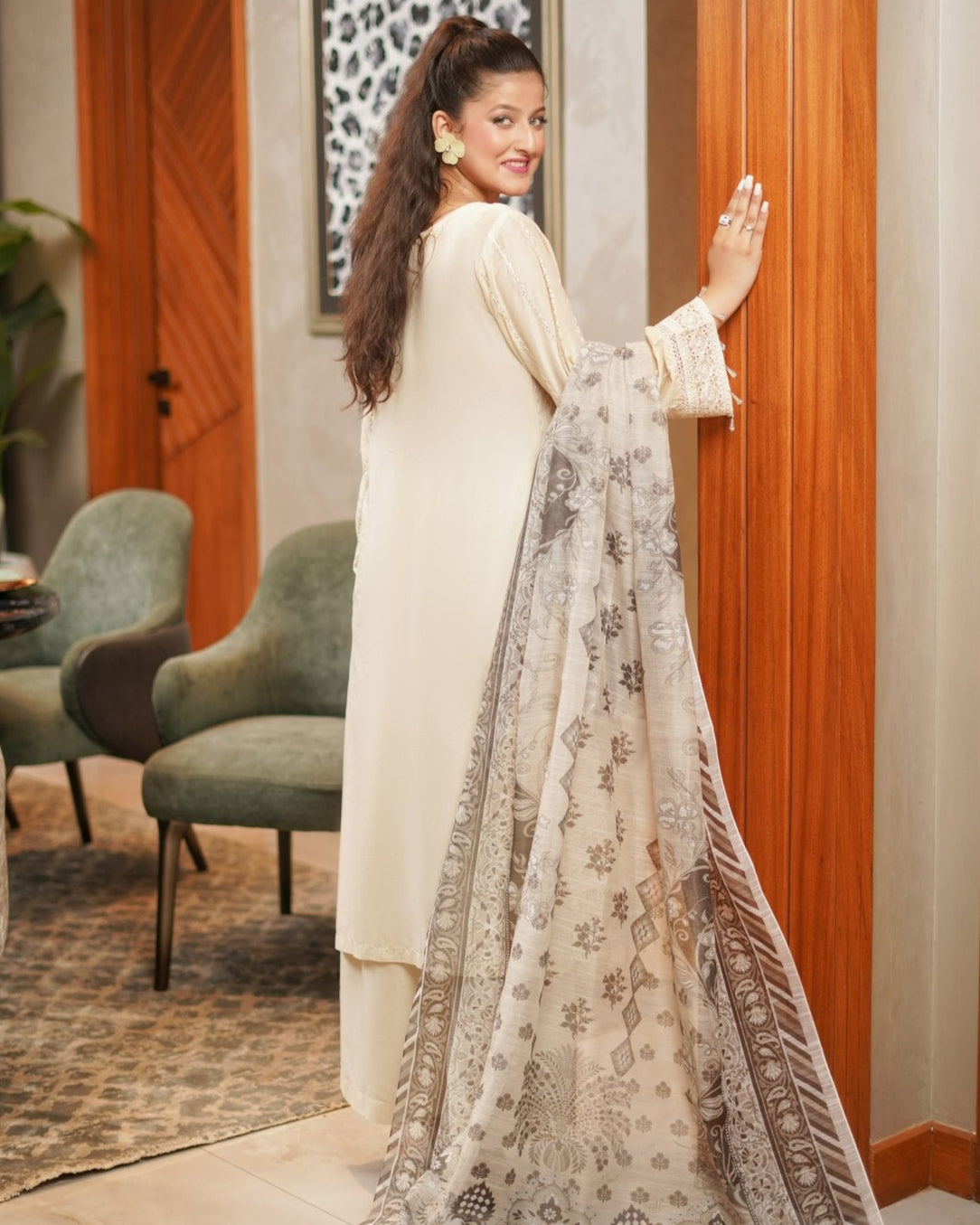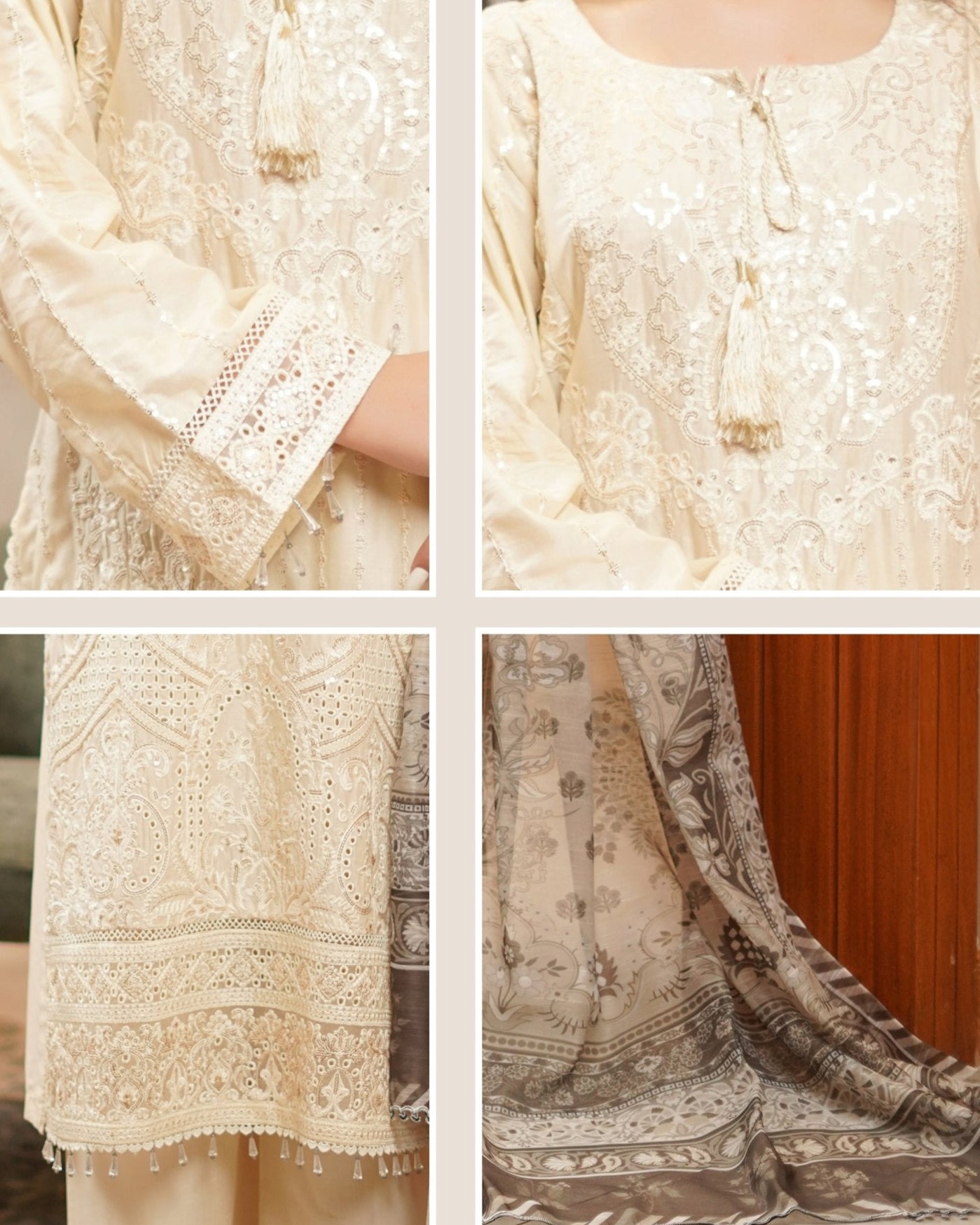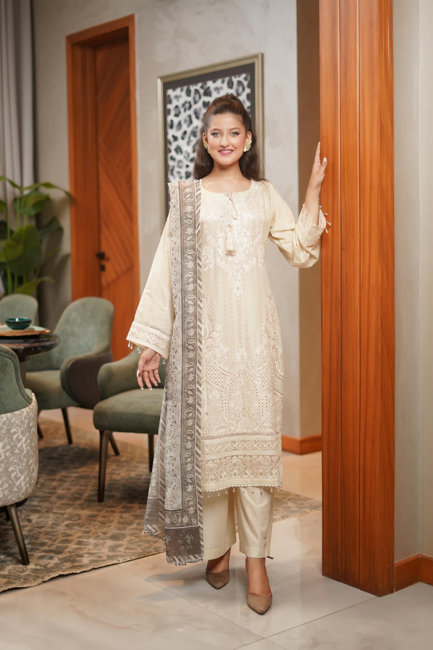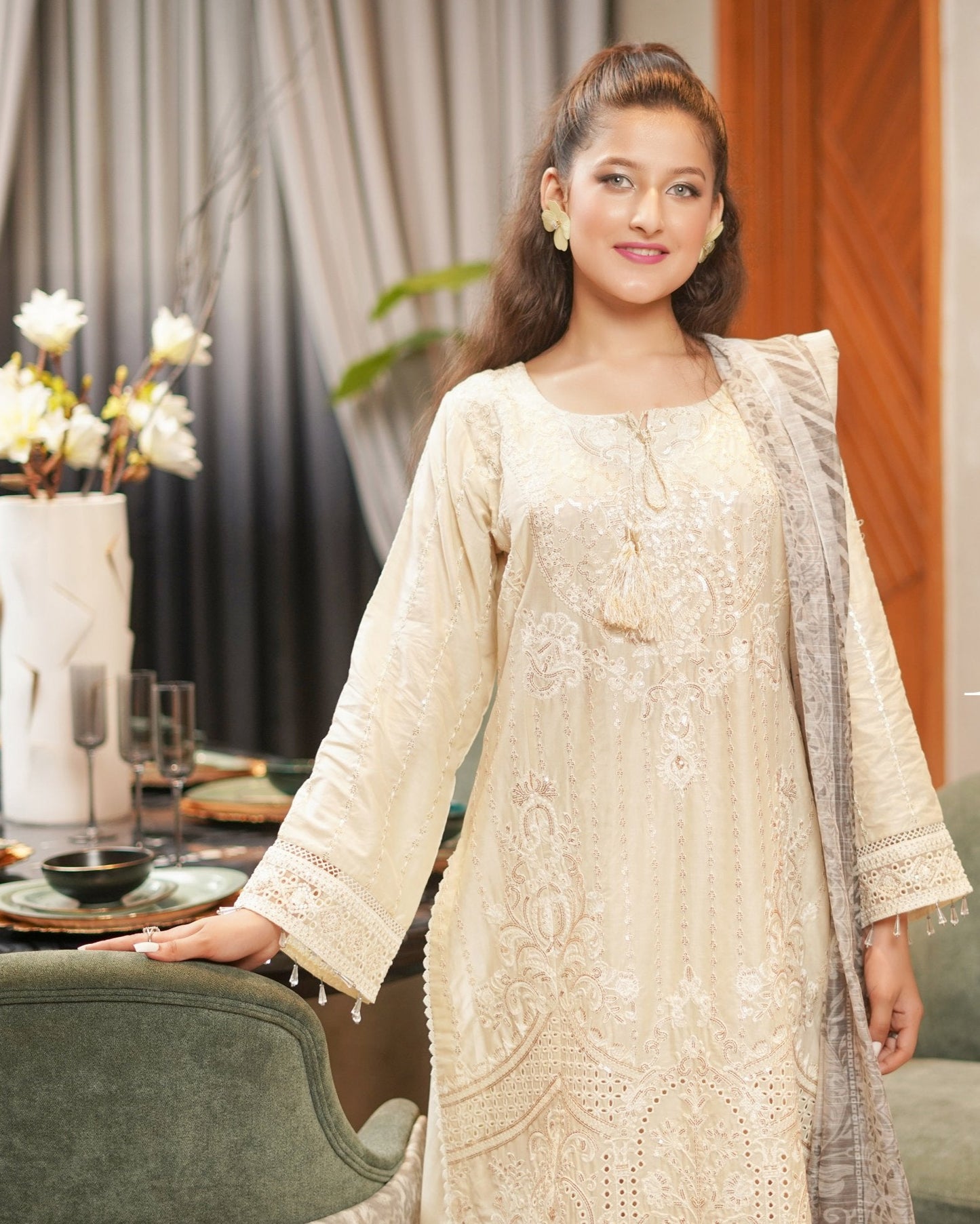Discover the perfect look. Its intriguing details make it a must-have for any wardrobe. Designed for comfort and style, you'll feel confident and fashionable every time you wear it. Upgrade your look today with this outfit. This elegant 3PC set features a cotton shirt adorned with heavy embroidery and boring sequence work, paired with a textured Munaar dupatta and matching cotton trousers. A graceful ensemble that blends festive charm with timeless comfort.