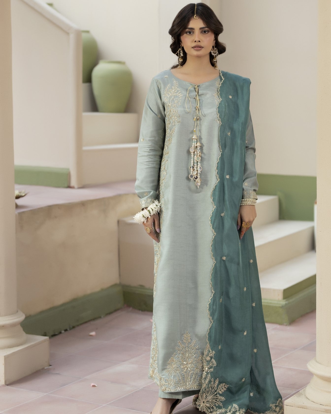 Dupatta: Coordinated raw silk dupatta completing the graceful ensemble
