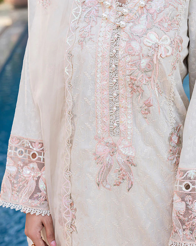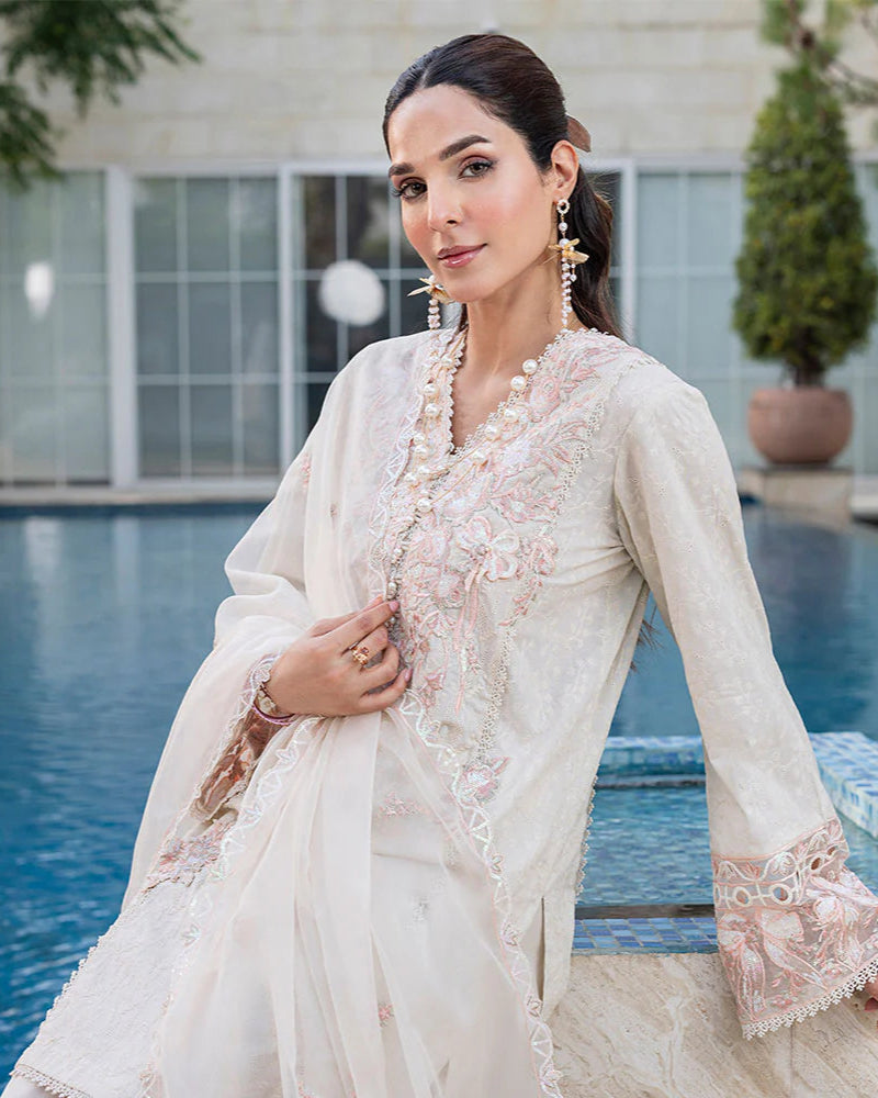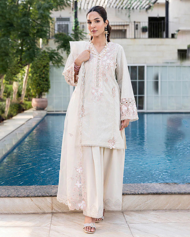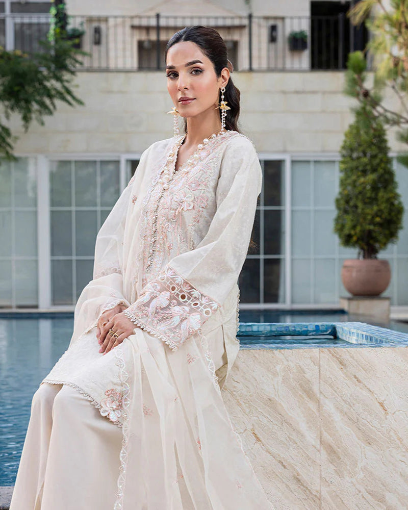 This charming outfit features a mid-length shirt in summer cotton, beautifully enhanced with schiffli and multihead embroidery, delicate lace, buttons, and 3D flowers that bloom across the front. Paired with a classic Farshi Shalwar and a dyed embroidered organza dupatta, this look blends festive grace with modern charm—perfect for Eid and elegant soirées.
