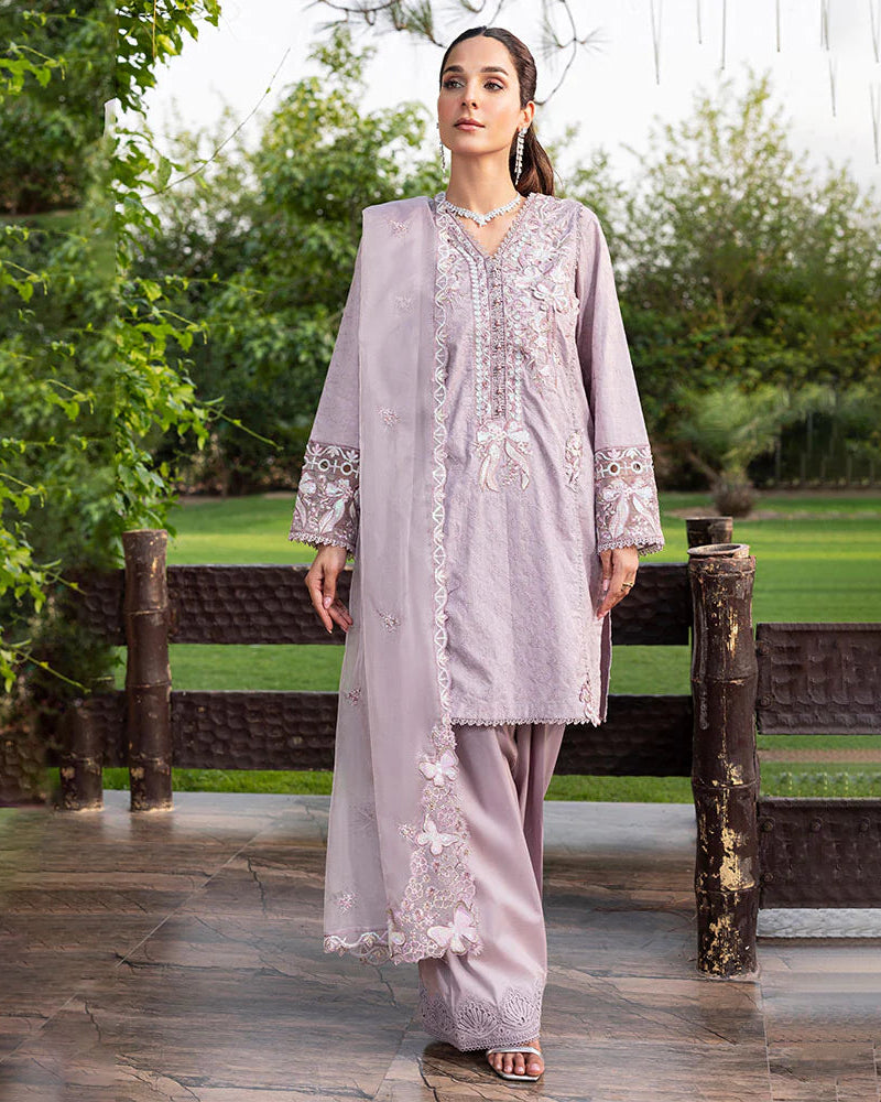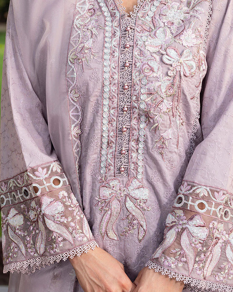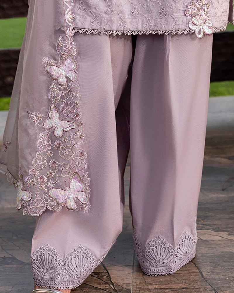 This charming outfit features a mid-length shirt in summer cotton, beautifully enhanced with schiffli and multihead embroidery, delicate lace, buttons, and 3D flowers that bloom across the front. Paired with a classic Farshi Shalwar and a dyed embroidered organza dupatta, this look blends festive grace with modern charm—perfect for Eid and elegant soirées.