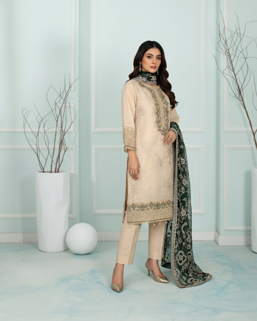 An elegant chiffon outfit designed with refined thread, sequin, and pearl work that adds a subtle touch of shimmer and sophistication. The smooth malai trouser ensures comfort with a graceful fit, while the matching chiffon dupatta completes the look with effortless charm—perfect for semi-formal gatherings or festive evenings.