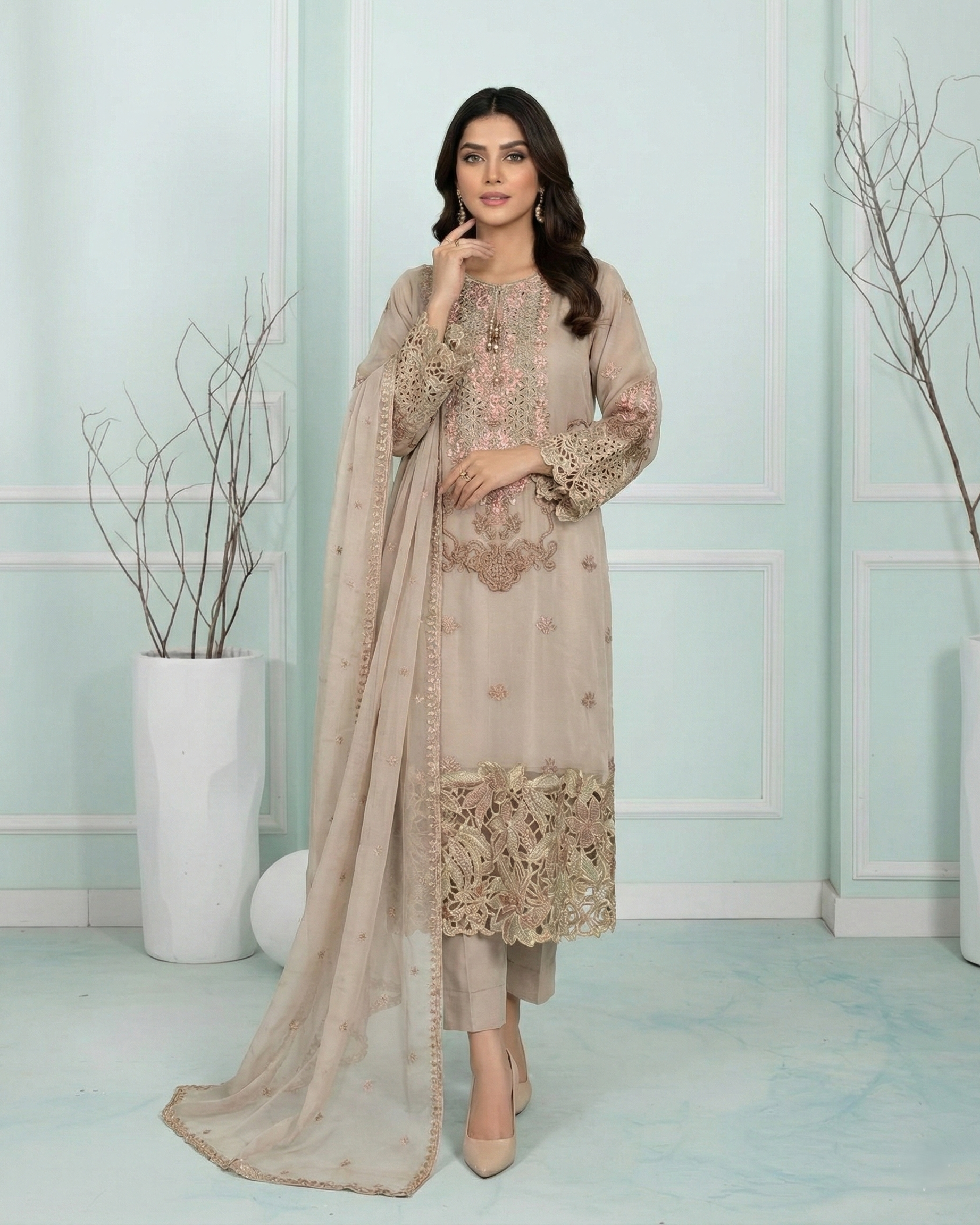 A timeless chiffon outfit designed for refined elegance. The shirt features exquisite tilla, sequin, and appliqué work beautifully enhanced with delicate pearl settings, creating a soft shimmer with every move. Paired with a graceful chiffon dupatta and smooth malai trousers, this ensemble blends luxury and comfort—perfect for festive and semi-formal occasions.