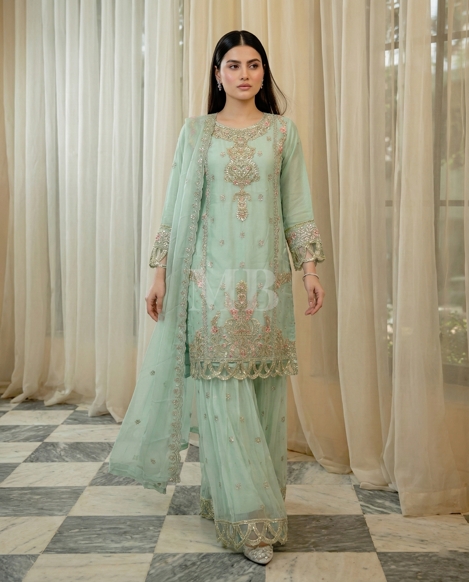 Sharara: Chiffon sharara completing the ensemble with graceful flow and timeless sophistication.