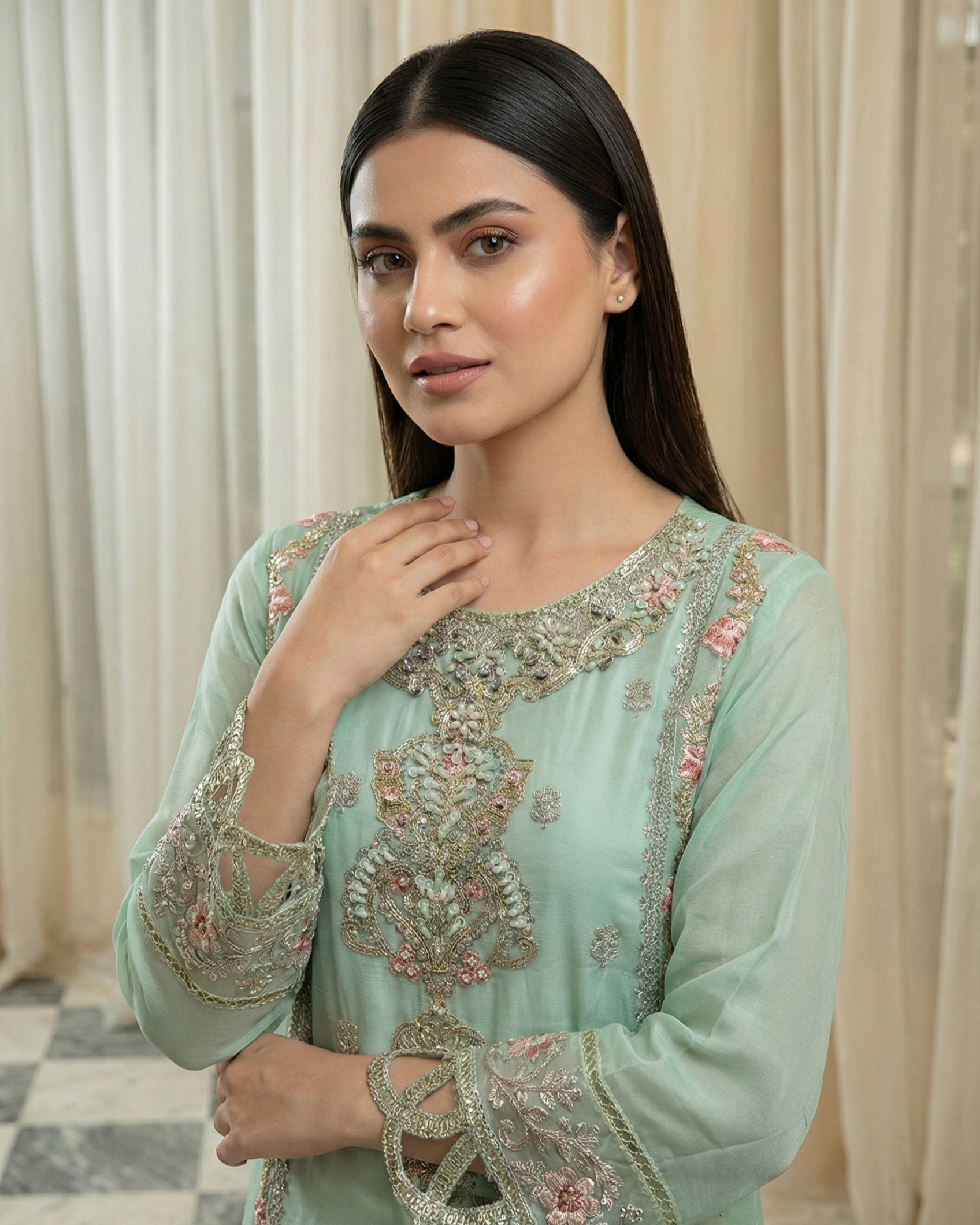 Dupatta: Chiffon dupatta designed for soft movement and refined appeal.