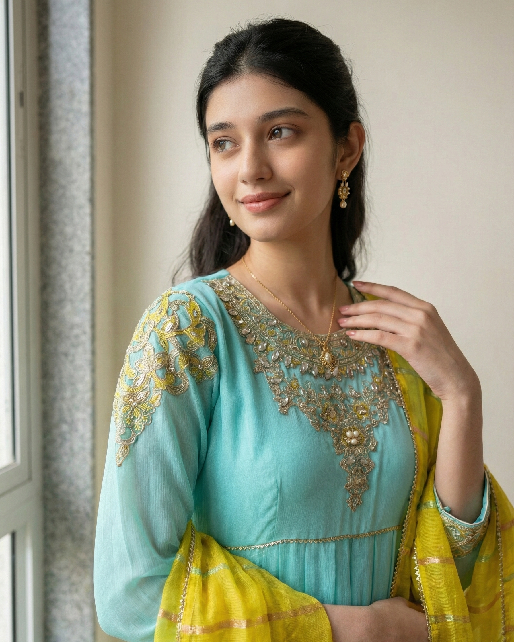 Step into graceful sophistication with this delicately styled ensemble. Soft chiffon layers and airy textures create a look that feels elegant, refined, and effortlessly luxurious. Designed to flow with charm and poise.