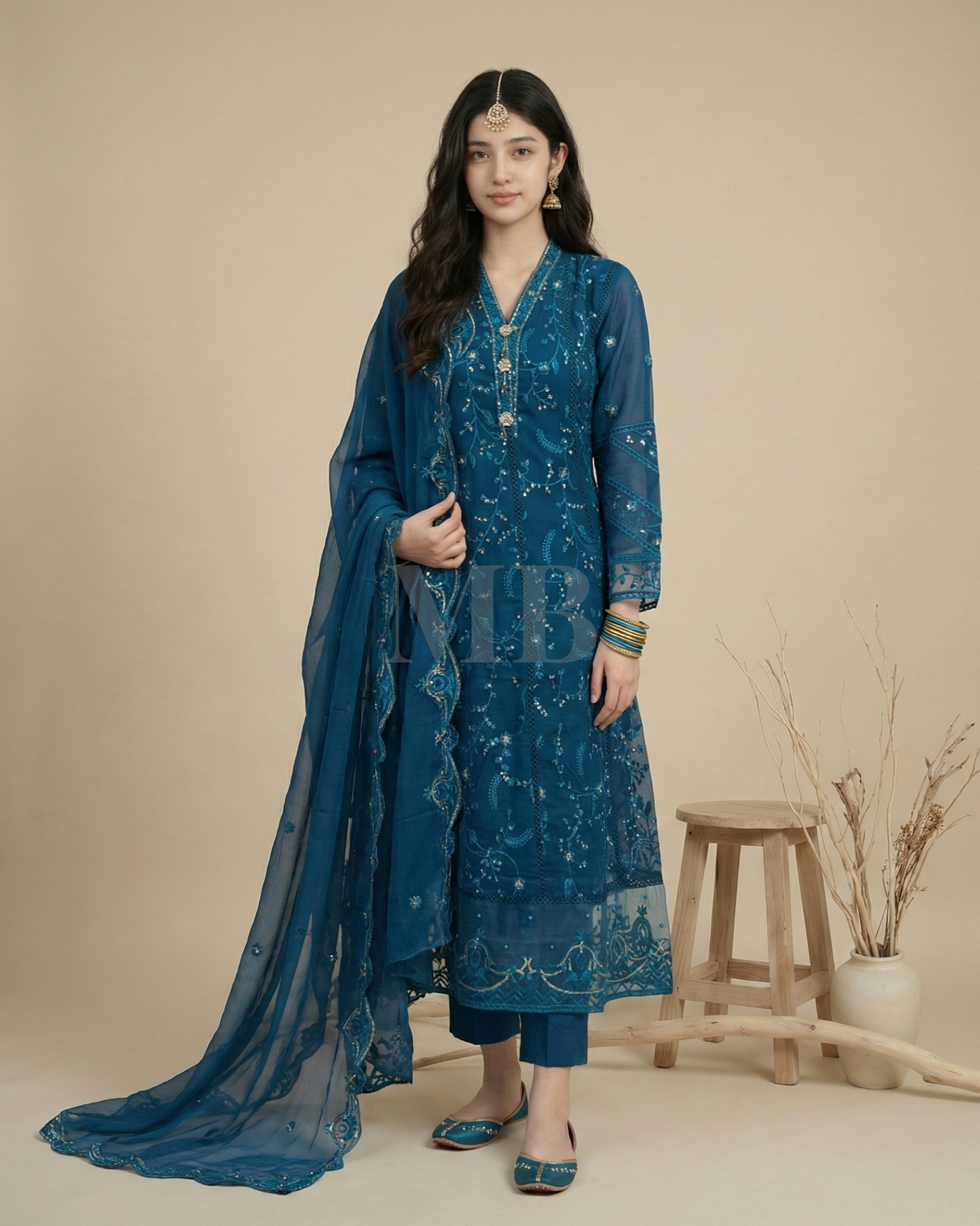 Elevate your style game with our NP NPG-32 3PC Ready to Wear set. The cutline features a frock, dupatta, and trousers, all made with high-quality materials. The frock is made with chiffon fabric, while the dupatta comes in a matching chiffon fabric. The trouser is made with grip fabric for a comfortable fit. Stand out in this elegant and original ensemble.