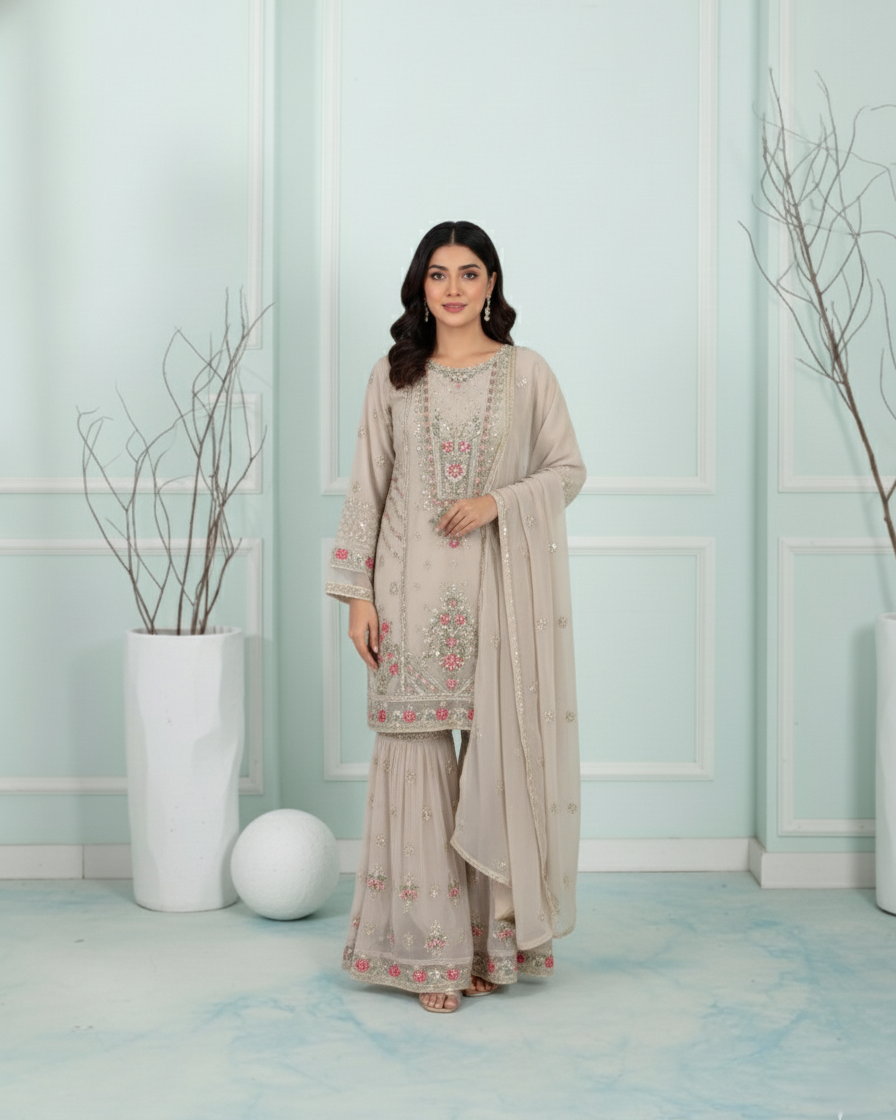 A graceful chiffon three-piece ensemble that embodies timeless elegance. The shirt is beautifully adorned with thread, tilla, sequins, and delicate pearl settings, adding a refined shimmer to its classic silhouette. Paired with a matching chiffon sharara for a flowy, festive charm and a soft chiffon dupatta that enhances the overall grace—perfect for weddings and formal occasions.