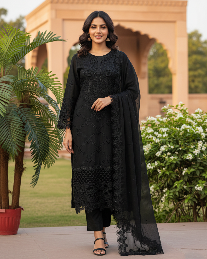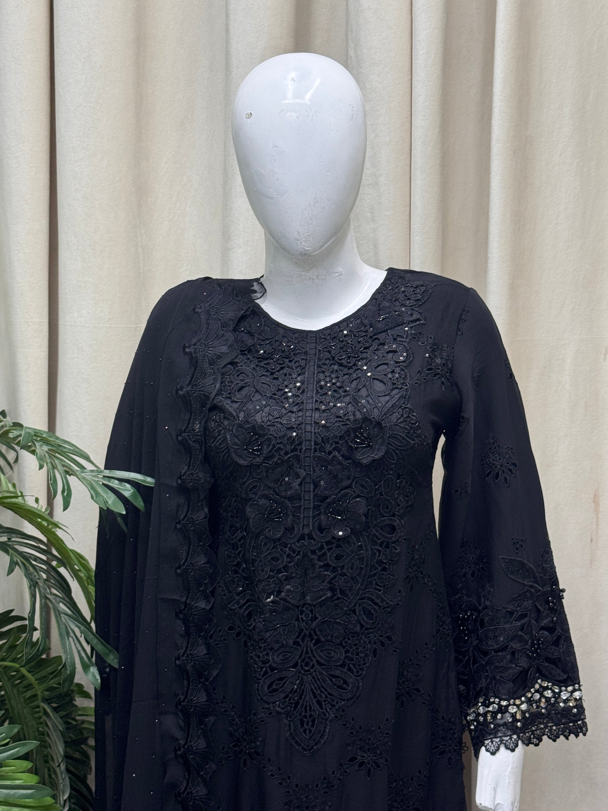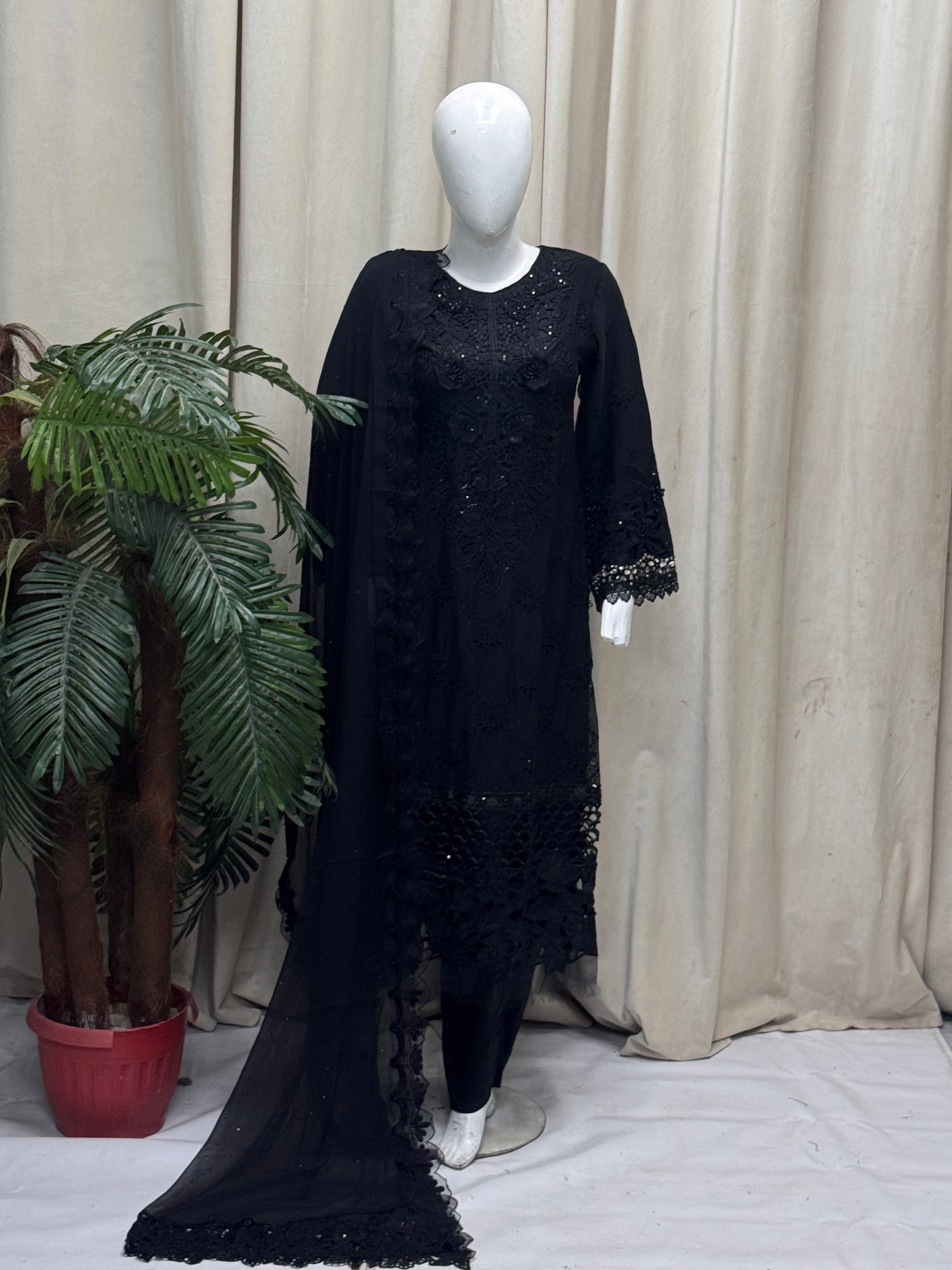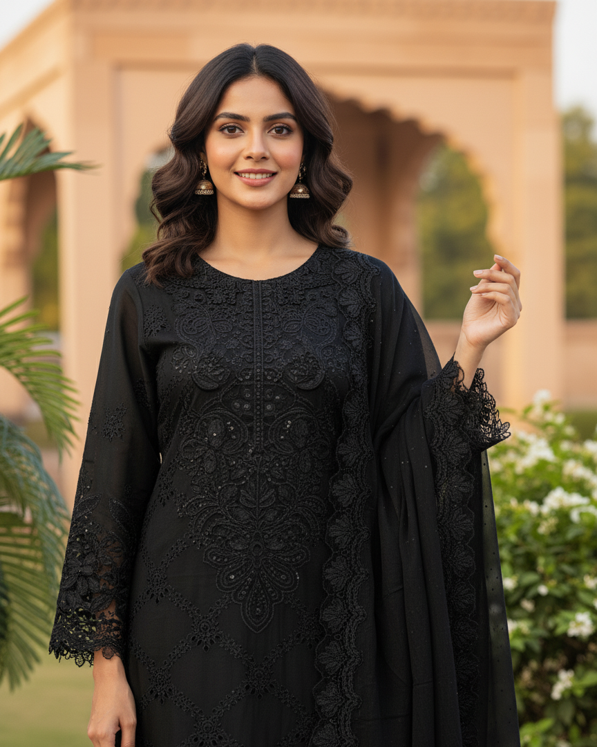 A graceful chiffon shirt tailored in a long silhouette, flowing with soft charm and sophistication. Paired with sleek grip trousers for a structured yet comfortable fit, while the chiffon dupatta adds a touch of lightness and refinement. Perfect for both festive evenings and formal gatherings.