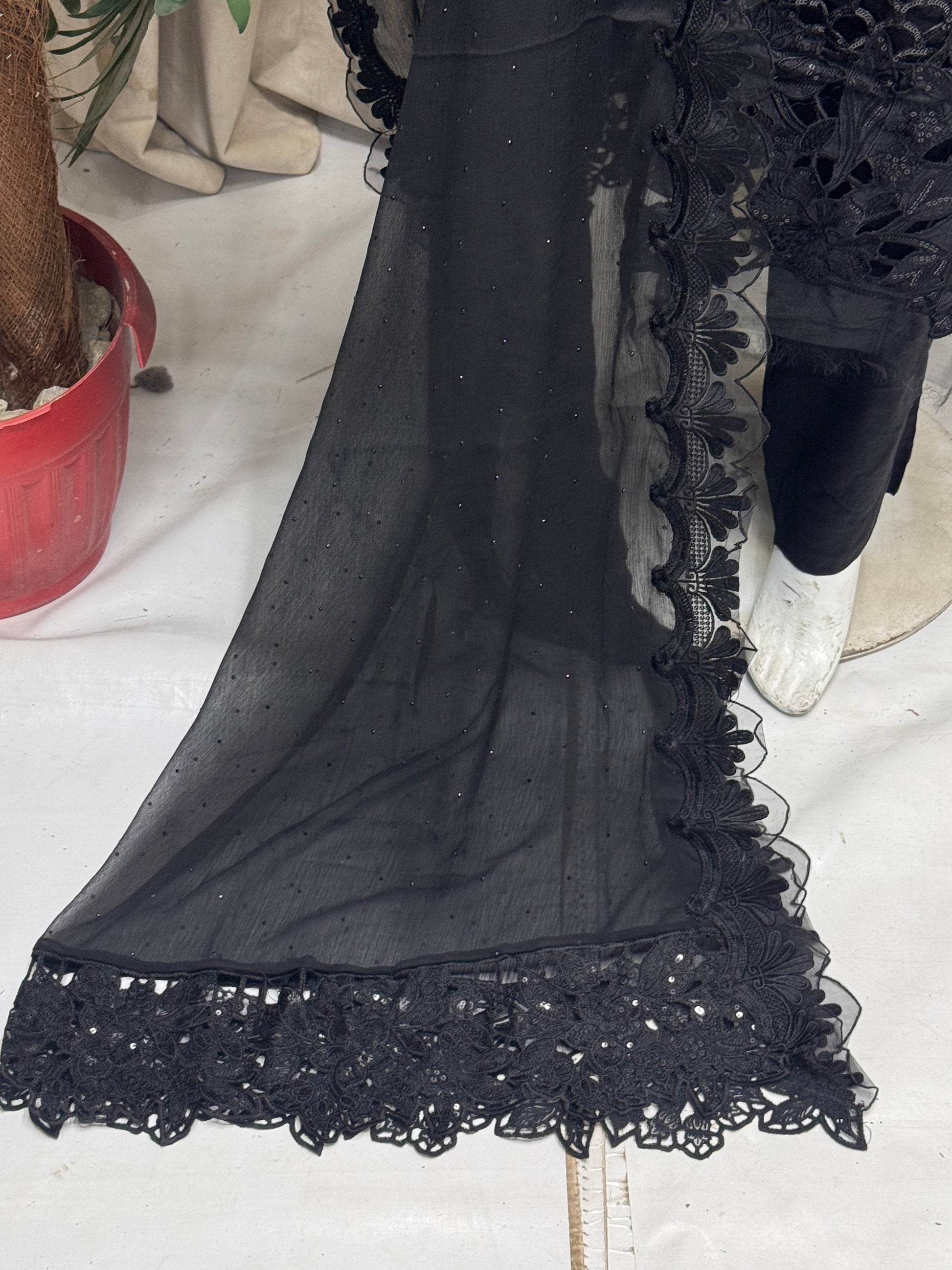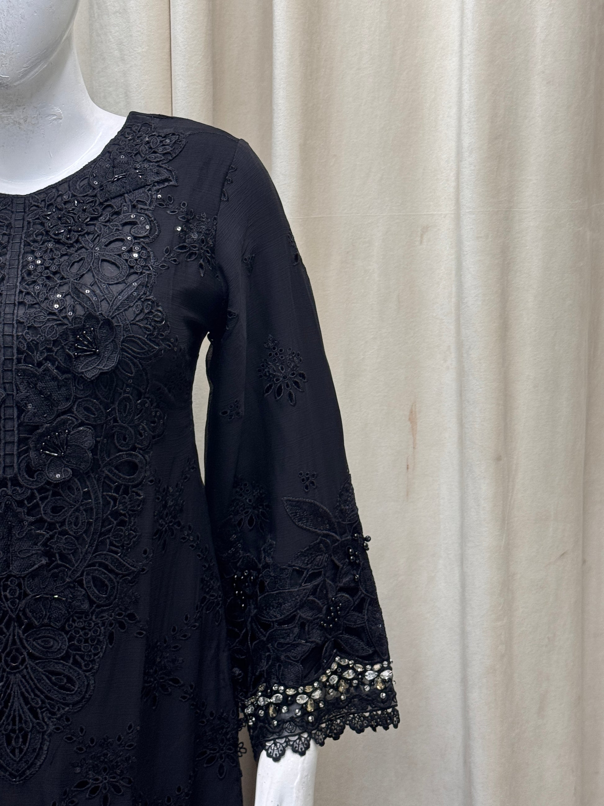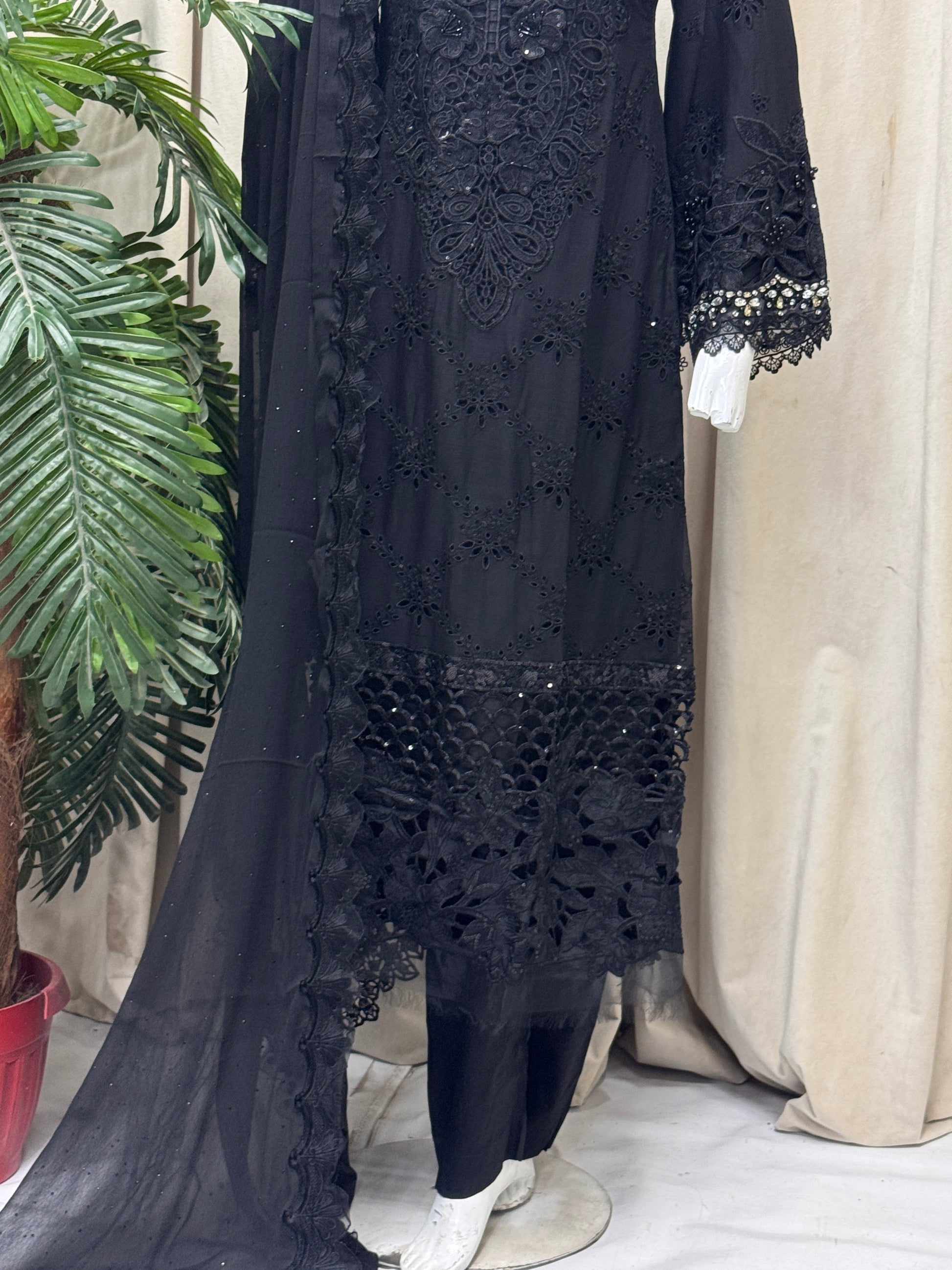 A graceful chiffon shirt tailored in a long silhouette, flowing with soft charm and sophistication. Paired with sleek grip trousers for a structured yet comfortable fit, while the chiffon dupatta adds a touch of lightness and refinement. Perfect for both festive evenings and formal gatherings.