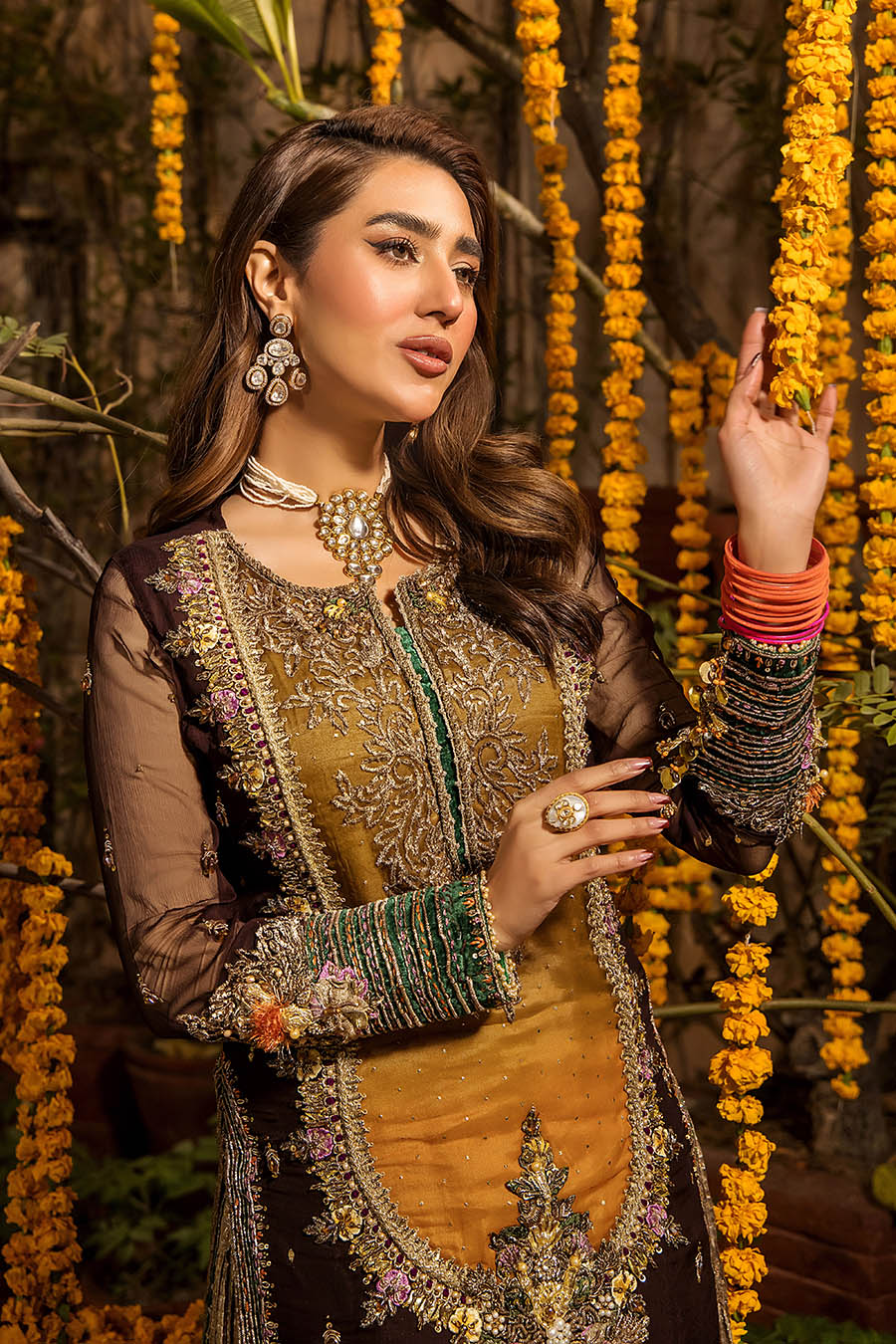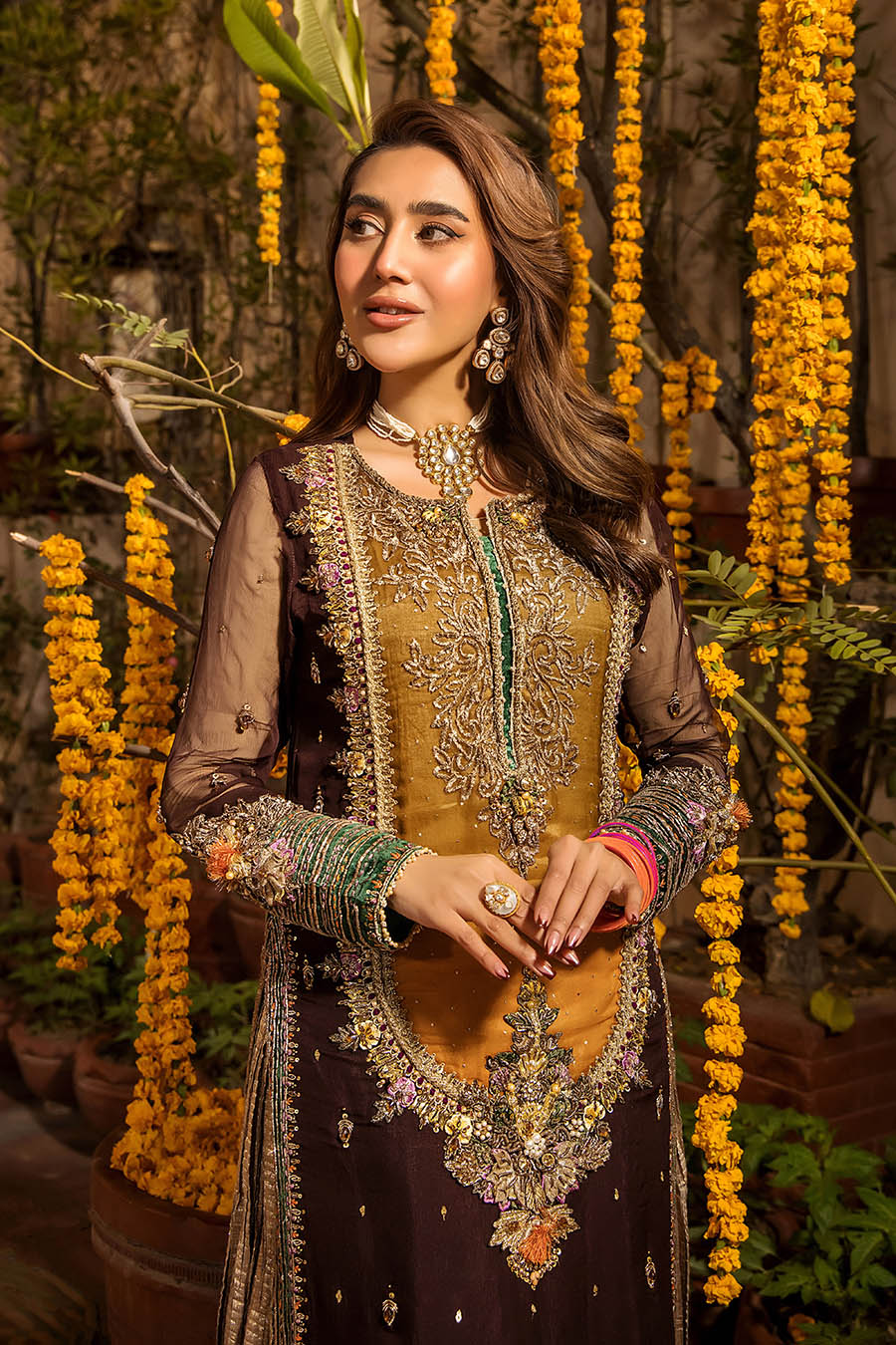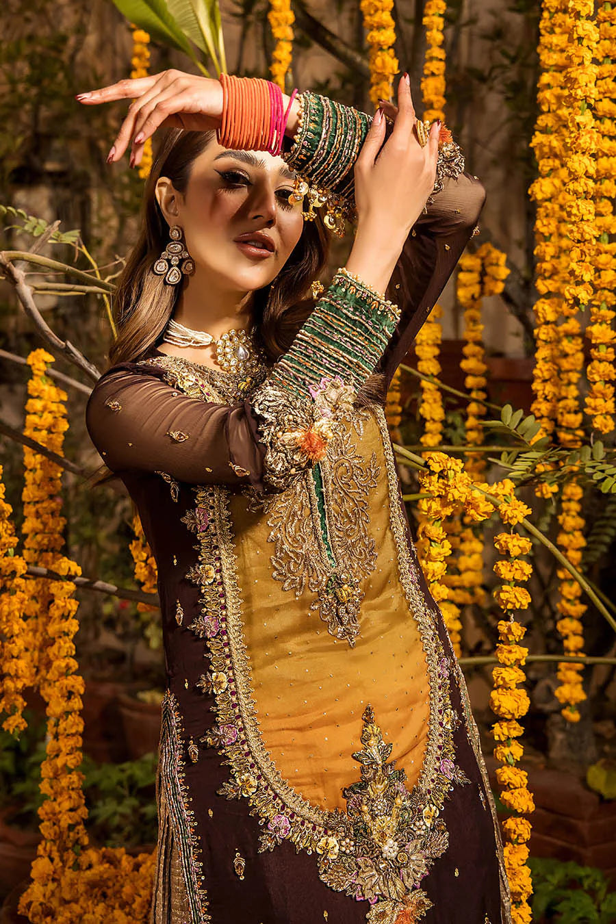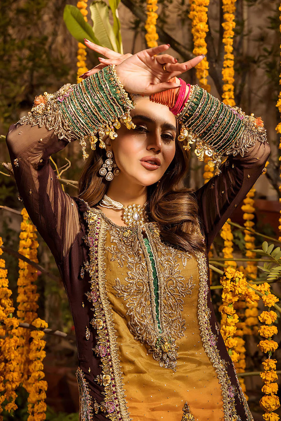 A blend of grace and tradition, this outfit brings timeless charm with a touch of shimmer. The shirt is crafted from Crinkle Chiffon with an elegant Organza patch, beautifully hand-embroidered using Kora, Dabka, Sequins, Zardozi, and delicate Patch Kaamdani work—each detail thoughtfully placed. Matching embroidered sleeves come attached. The Net Dupatta sparkles with Sequins, Mirror Work, and classic Gotta detailing, creating a festive, eye-catching finish. The Indian Crushed Silk Sharara adds rich movement and texture, completing the look with effortless flair.