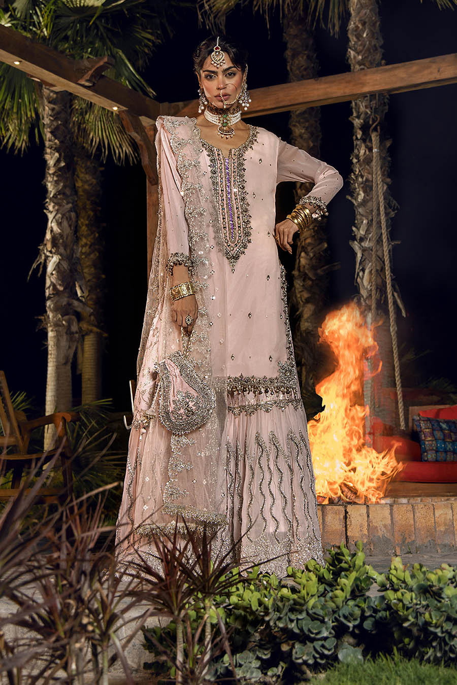 - Shirt: Crinkle Chiffon (Hand Embroidered with Kora, Dabka, Stones and Gotta)