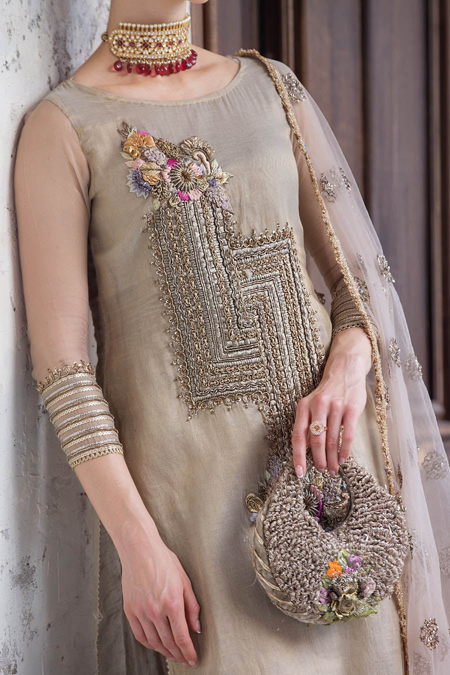 You'll fall in love with the intricate craftsmanship of this stunning outfit. The Mesuri cotton shirt, adorned with exquisite kora, dabka, and 3D work, exudes elegance. Delicate organza sleeves add a touch of grace, while the net dupatta, beautifully embellished with gotta embroidery, enhances the charm. Completing the look, the embroidered jamawar trousers with an elasticized waistband ensure both style and comfort—perfect for any special occasion.
