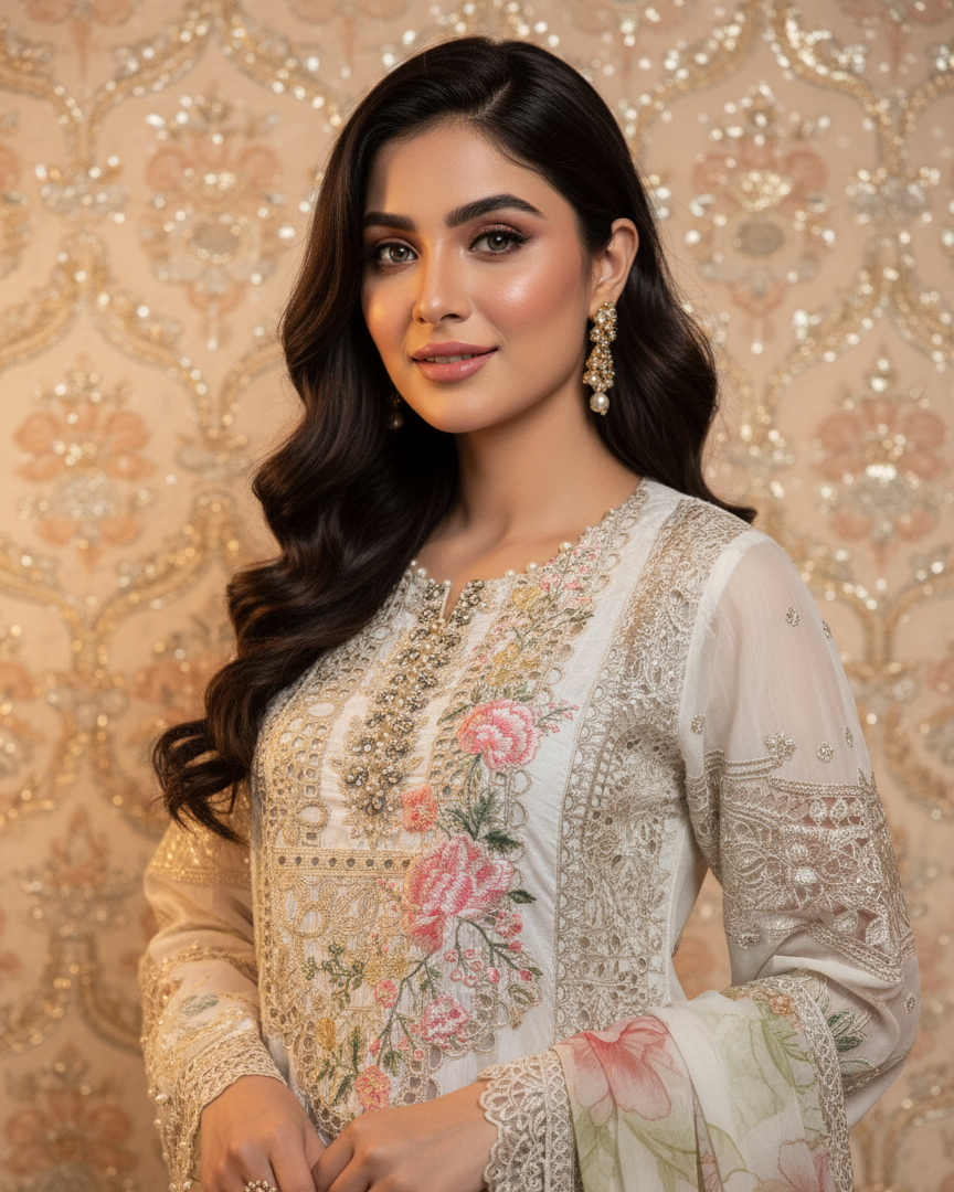 A katan silk straight shirt styled with matching katan trousers gives a sleek, polished look. Paired with a digital printed chiffon dupatta, this outfit blends timeless tradition with a modern touch—ideal for semi-formal gatherings and festive evenings.