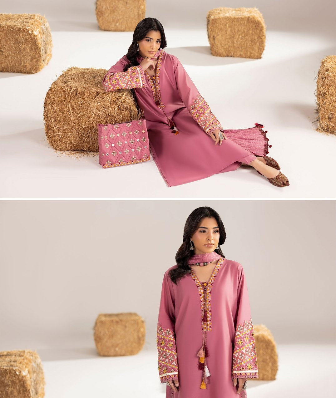 A vibrant celebration of summer elegance, where artisanal details meet breathable comfort. This ensemble blends traditional embroidery, hand-finished accents, and playful colors, creating a look that is both lively and effortlessly refined.