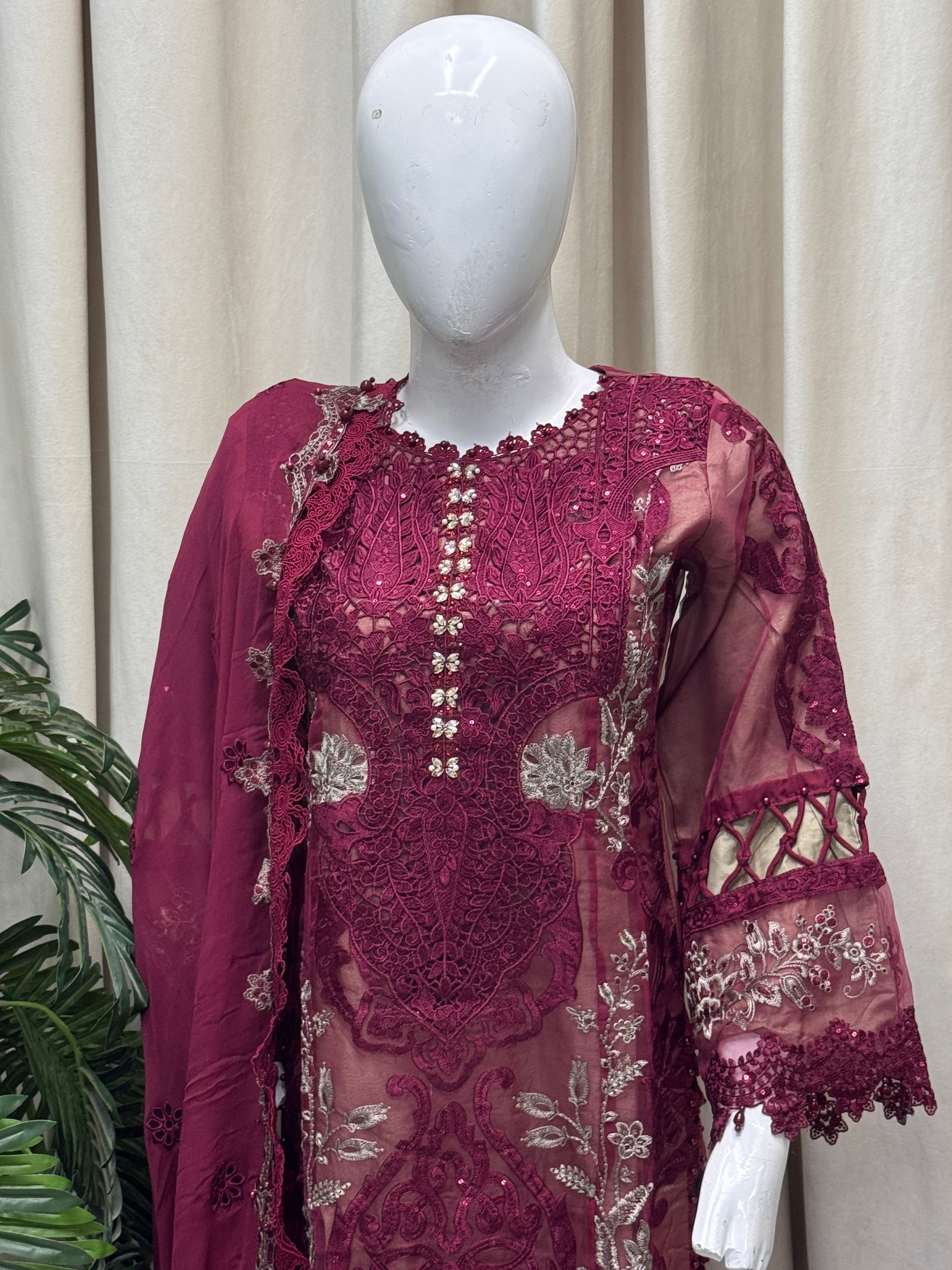 A timeless look crafted with elegance, this outfit pairs a straight organza shirt with sleek katan silk trousers for a polished appeal. The ensemble is completed with a soft chiffon dupatta, adding a graceful flow—perfect for festive gatherings and formal evenings.