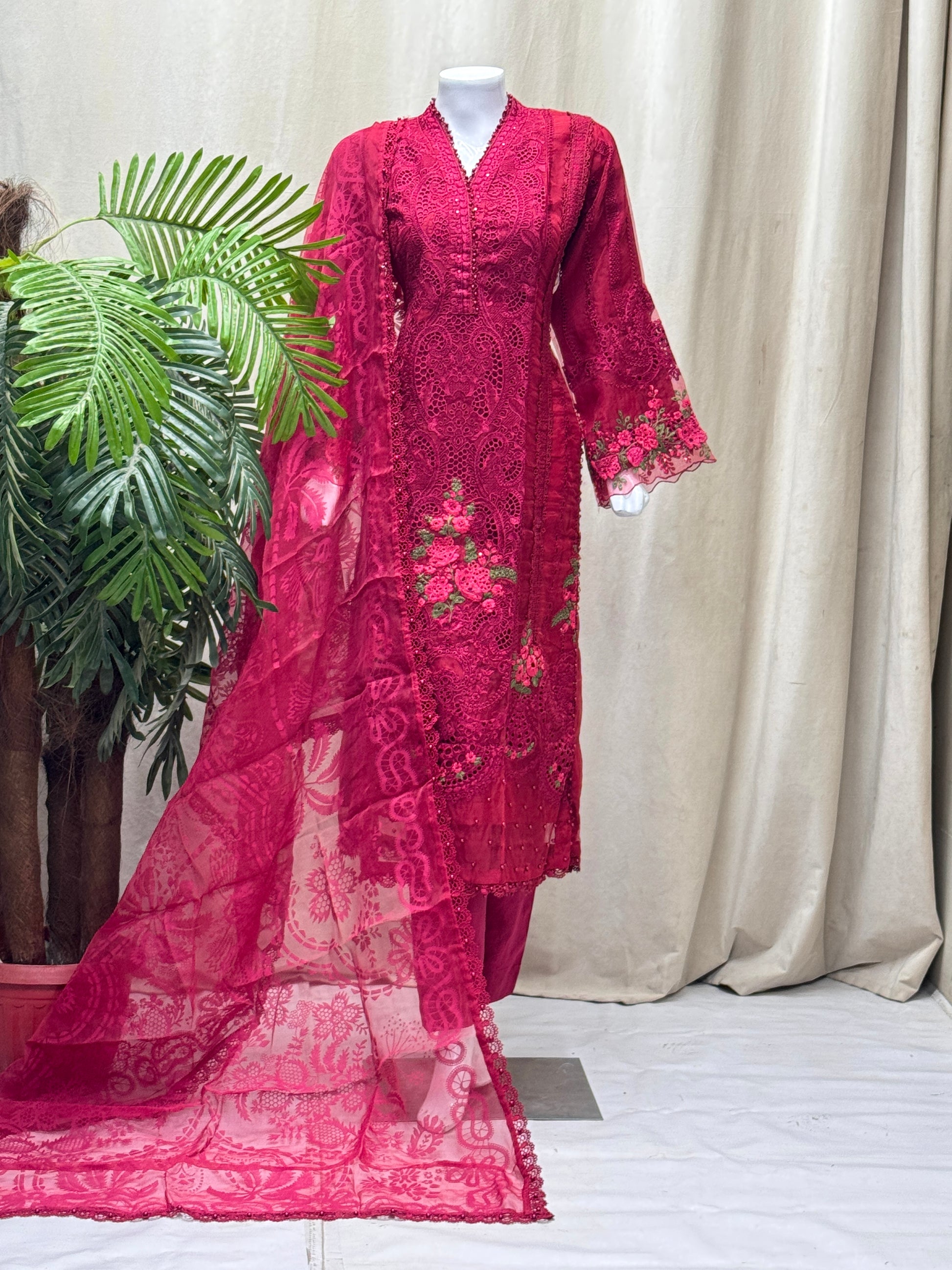 A graceful cotton shirt paired with matching cotton trousers creates a soft and breathable look, perfect for all-day comfort. The organza dupatta adds a sheer, elegant finish, completing the outfit with timeless charm.