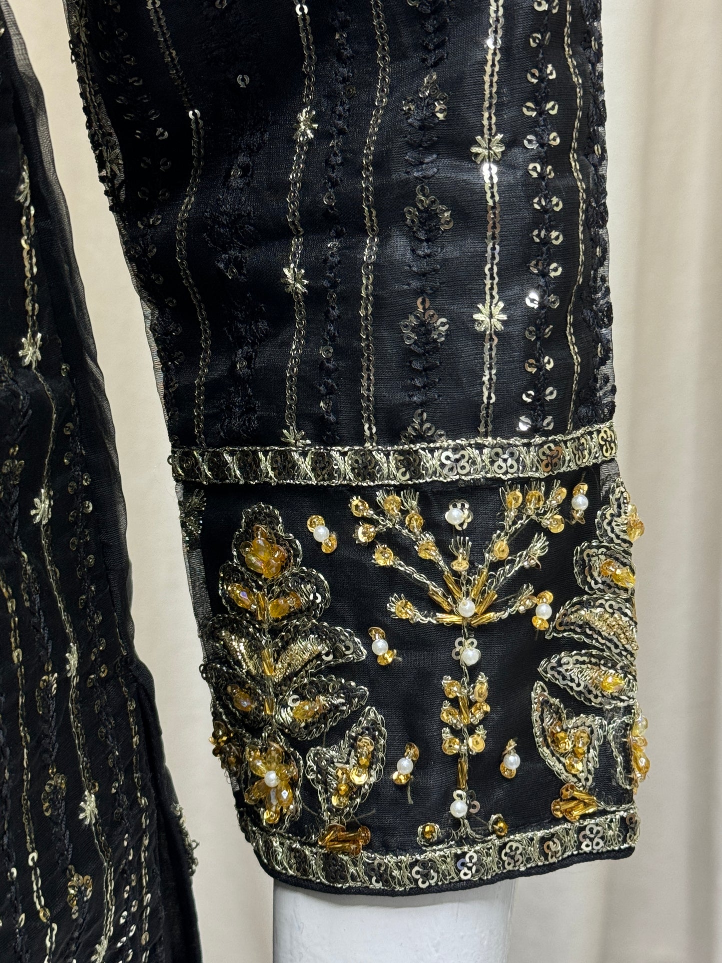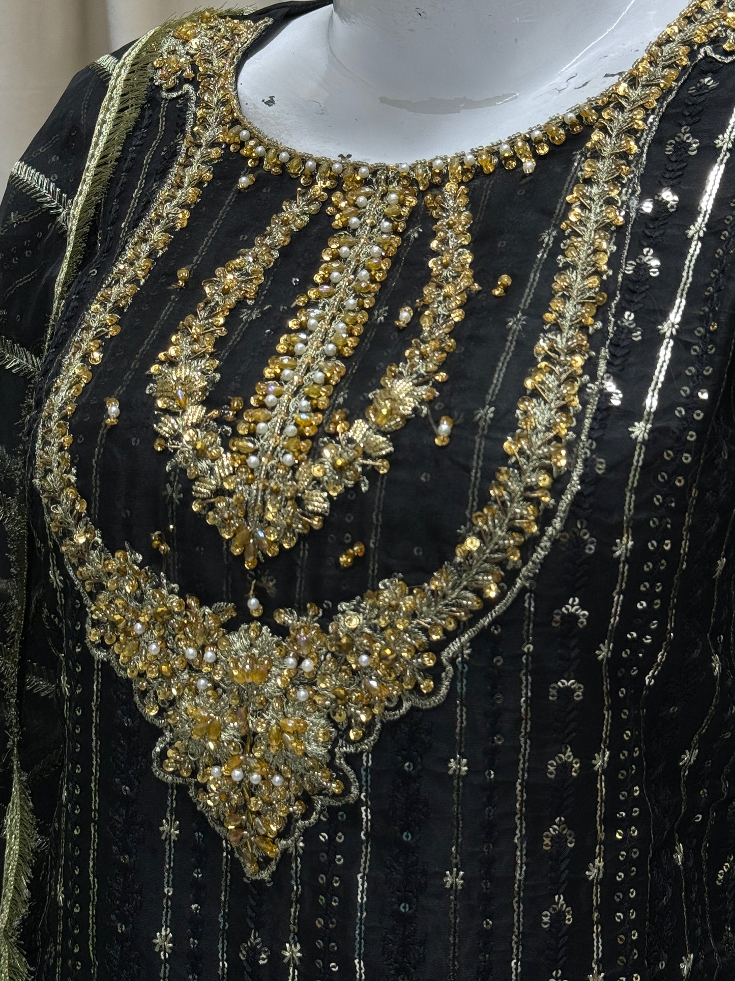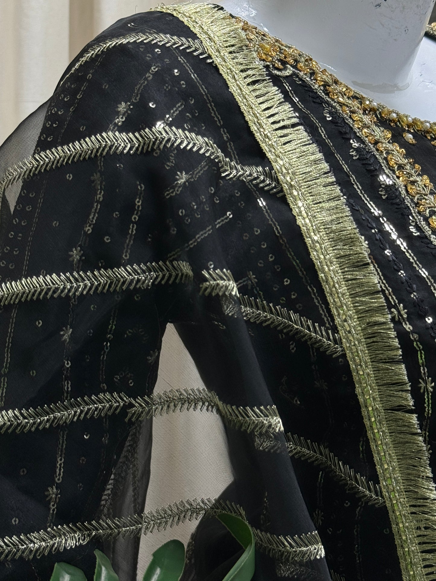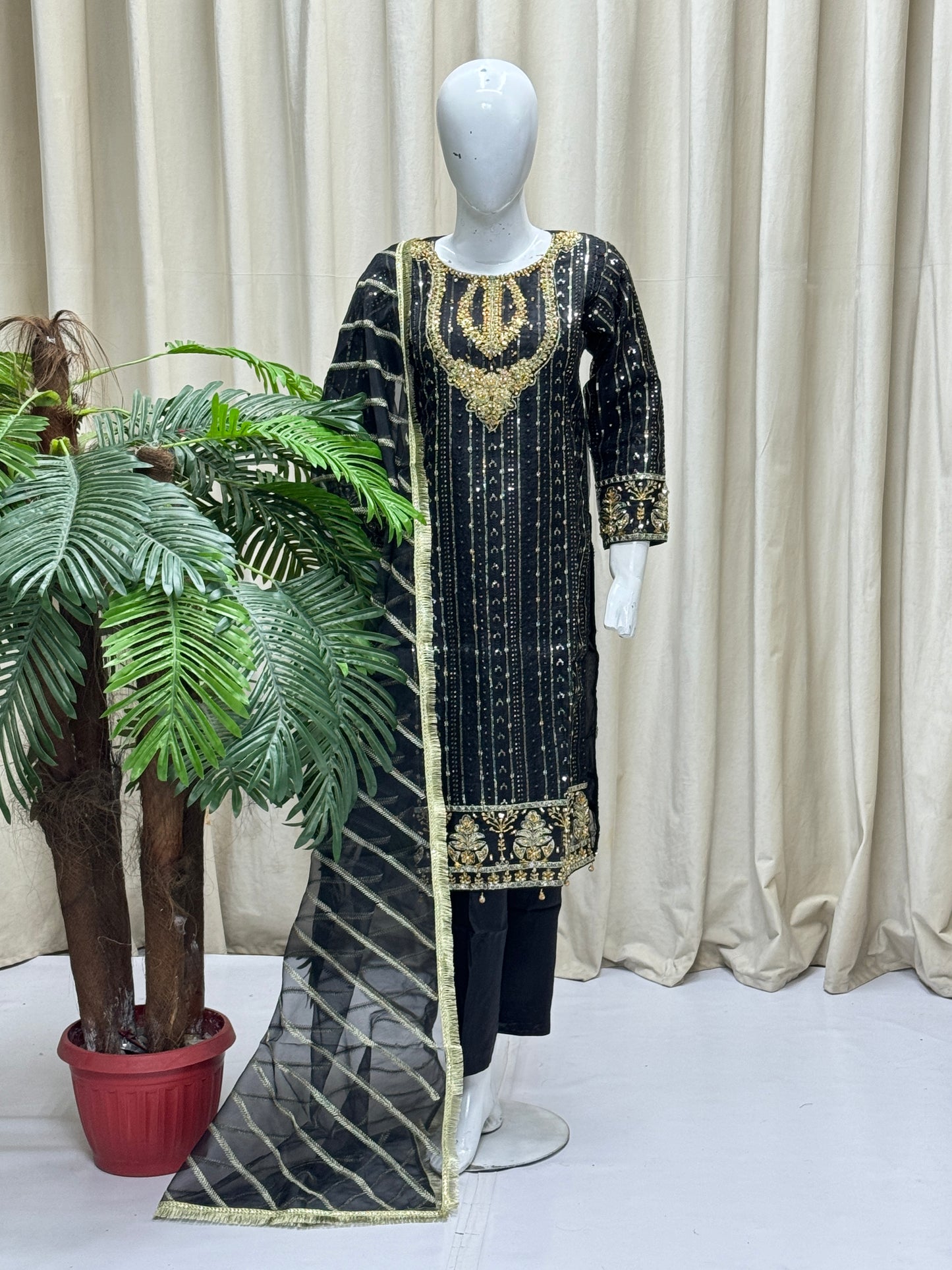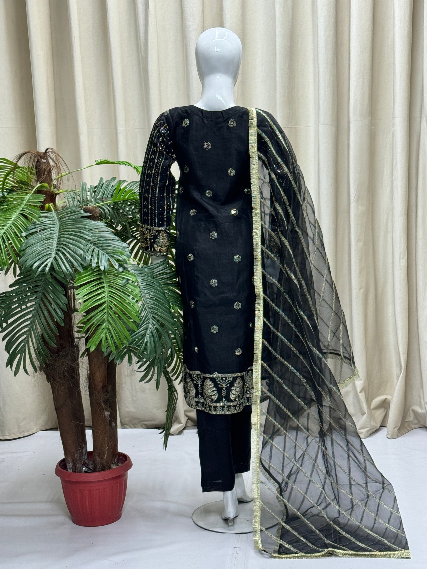 Complete your look with RW-1336 By SH! This 3-piece set includes a stylish cutline shirt and trouser made of durable organza fabric, adorned with elegant sequence embroidery and tila thread adda work. The matching dupatta adds the perfect finishing touch. Get ready to turn heads in this ready-to-wear outfit!