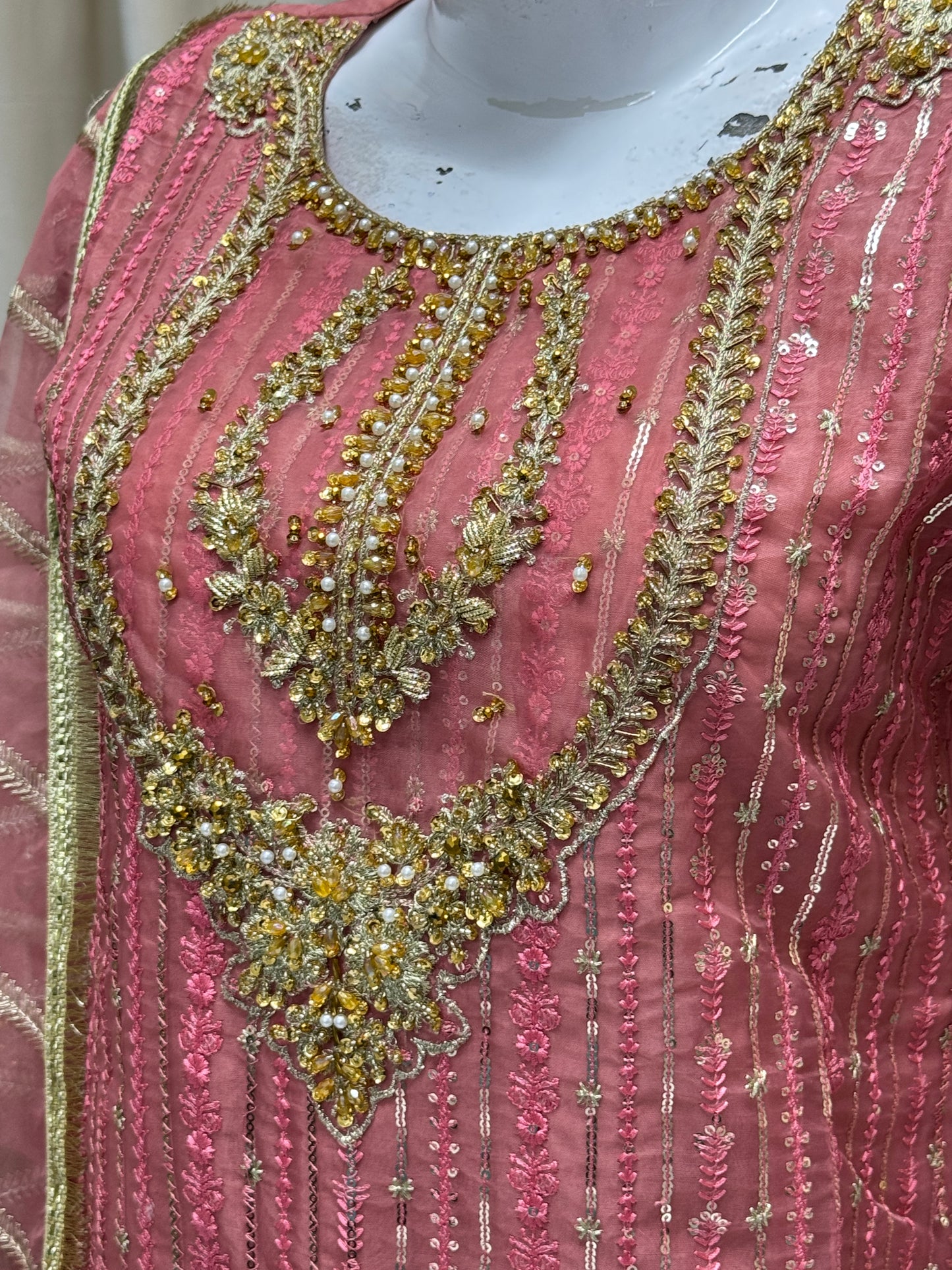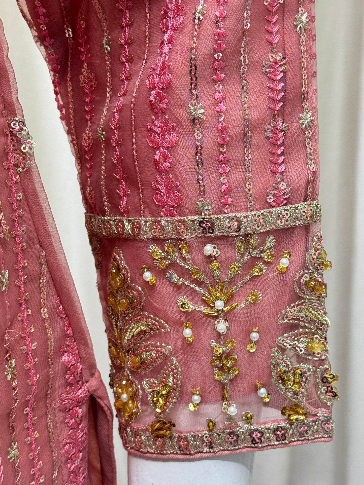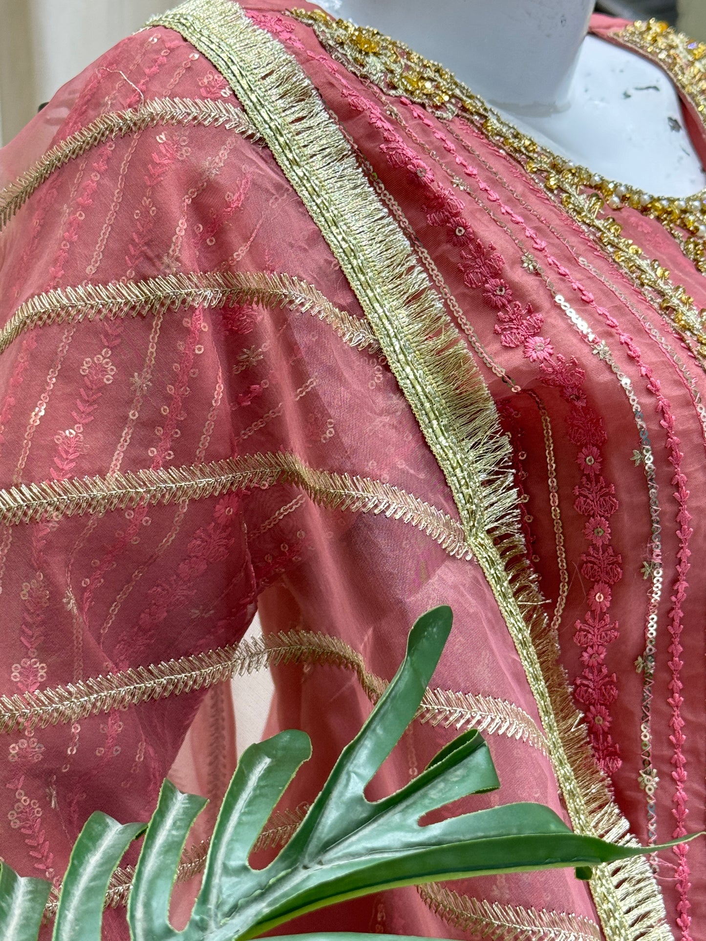 Complete your look with RW-1336 By SH! This 3-piece set includes a stylish cutline shirt and trouser made of durable organza fabric, adorned with elegant sequence embroidery and tila thread adda work. The matching dupatta adds the perfect finishing touch. Get ready to turn heads in this ready-to-wear outfit!