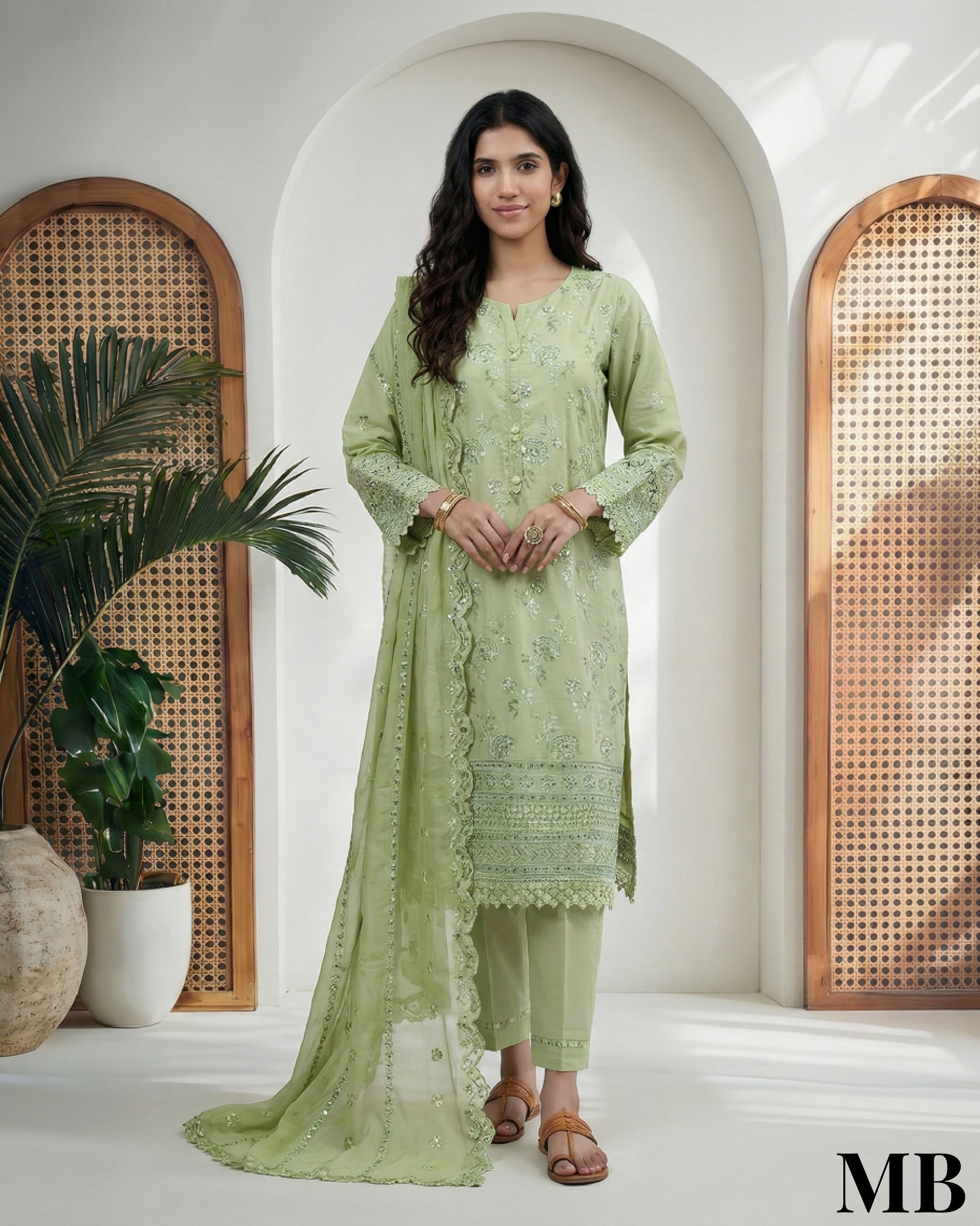 Introducing the SADABAHAR our exclusive collection. Made with high-quality cotton and chiffon, it features intricate embroidery on the shirt and dupatta for a touch of elegance. The cotton trouser adds comfort and versatility to this stylish ensemble.
