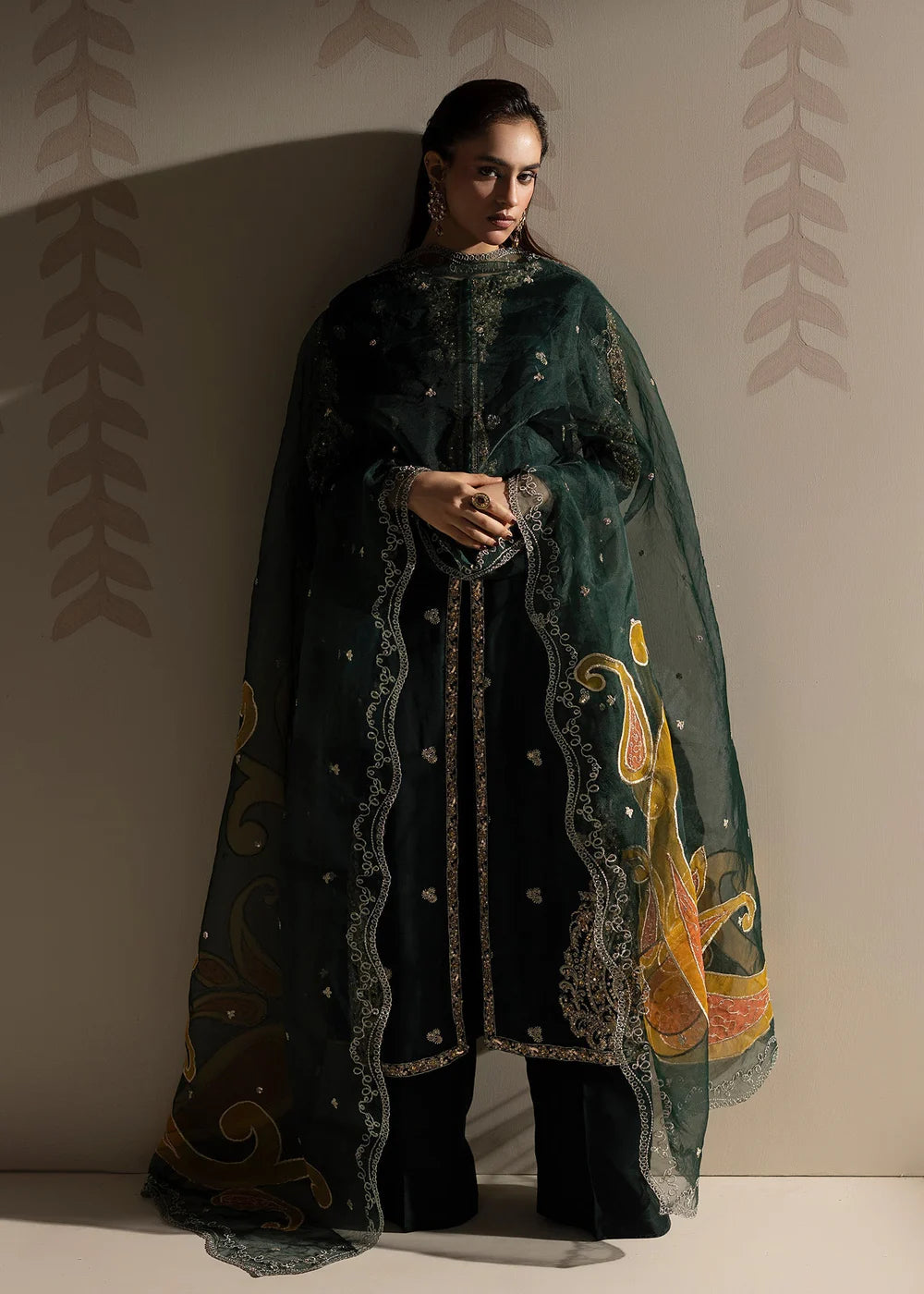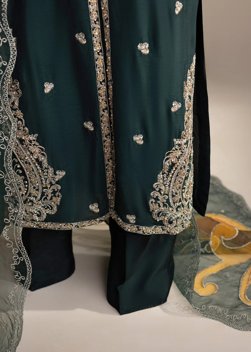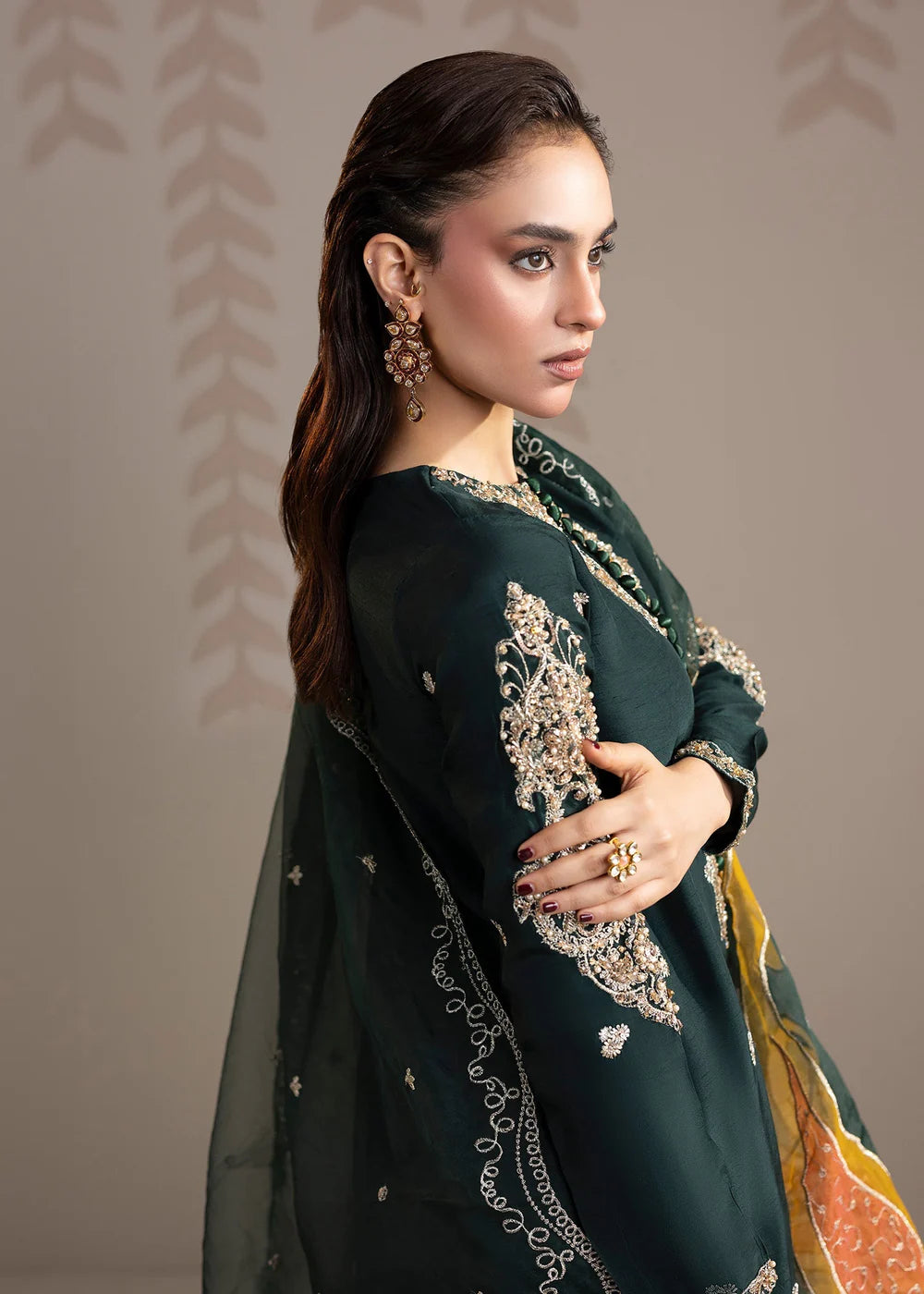 Step into effortless elegance with this striking green ensemble. Crafted in rich raw silk and paired with an organza dupatta, the outfit exudes sophistication, while heavy embroidery and embellishments make it perfect for festive occasions, evening events, or dawat gatherings.