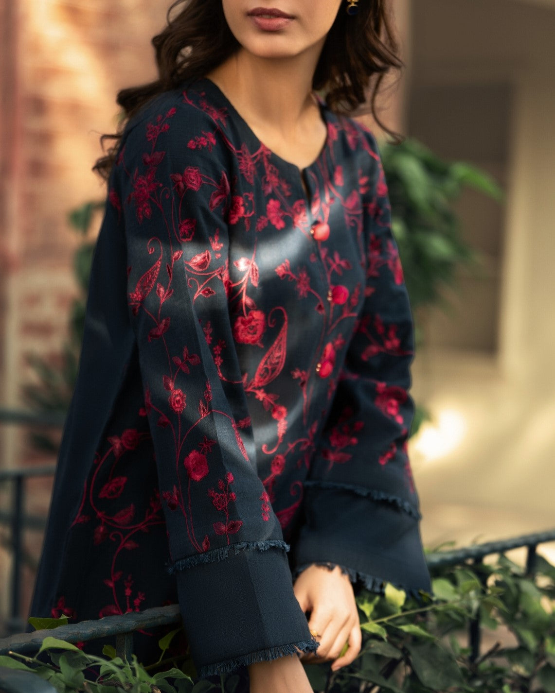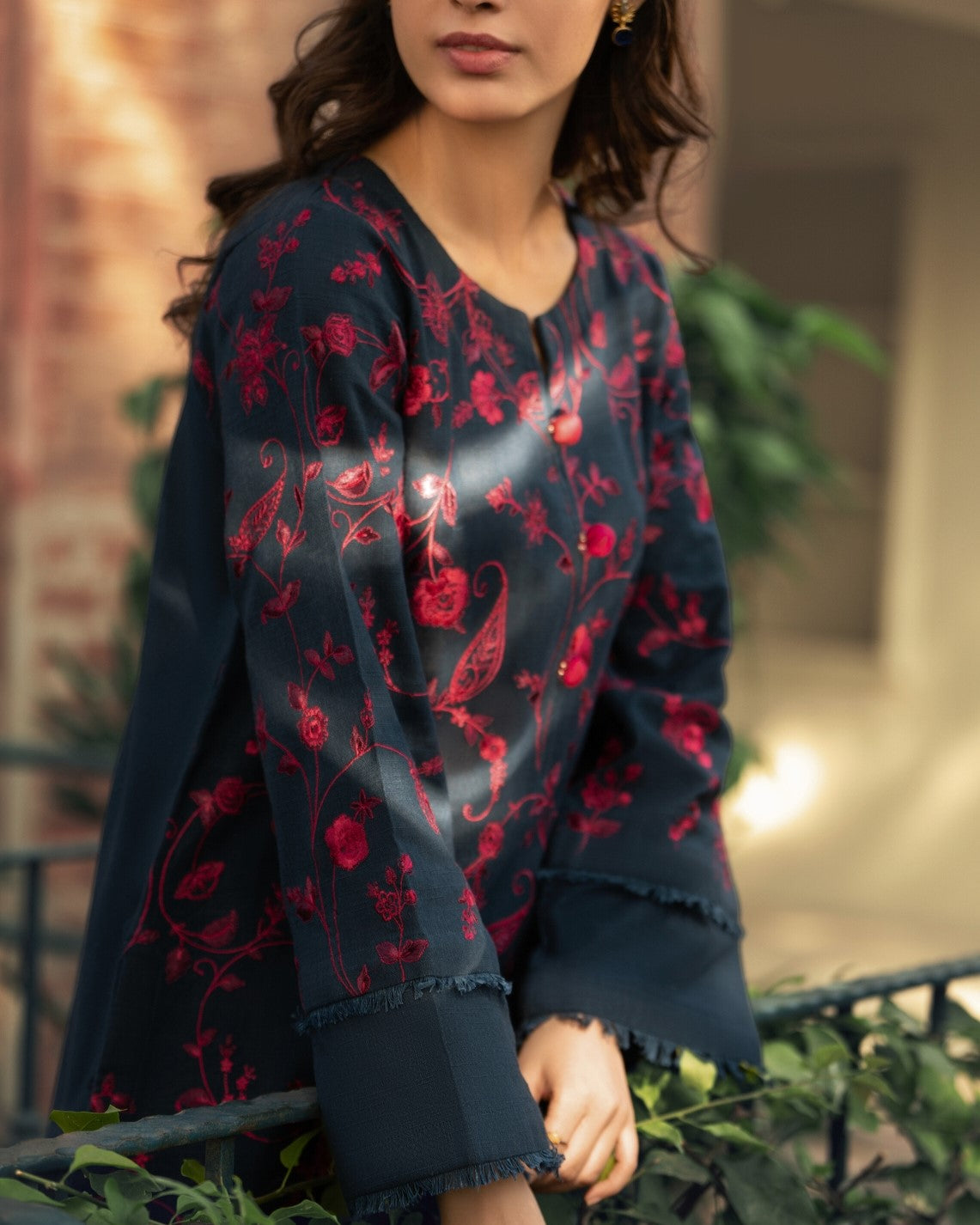 Shirt: Khadder shirt featuring thread embroidery that reflects soft sunlight and brick-walled charm, giving a textured and elegant finish.