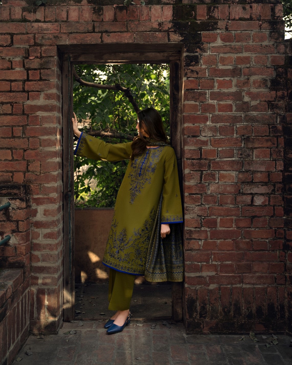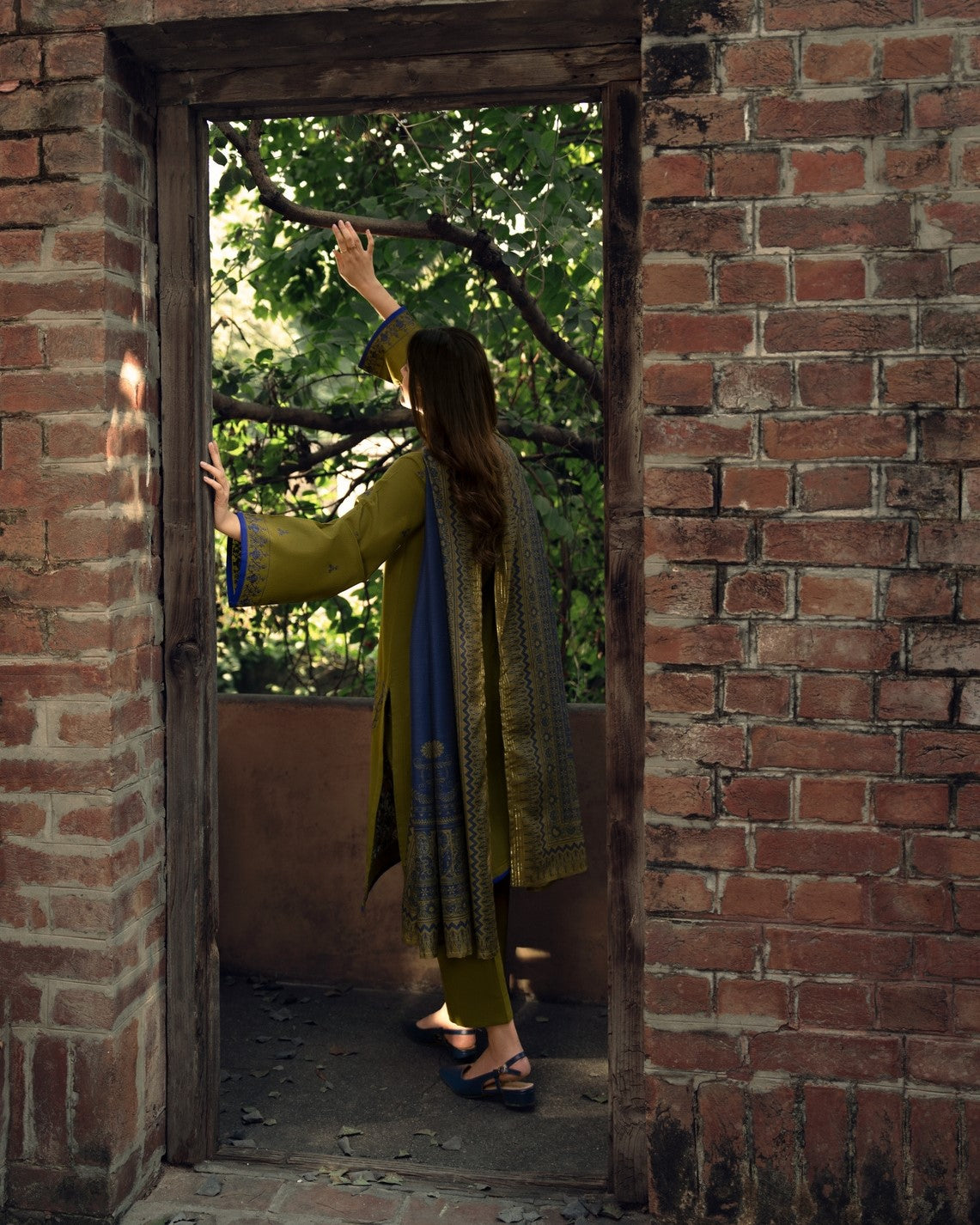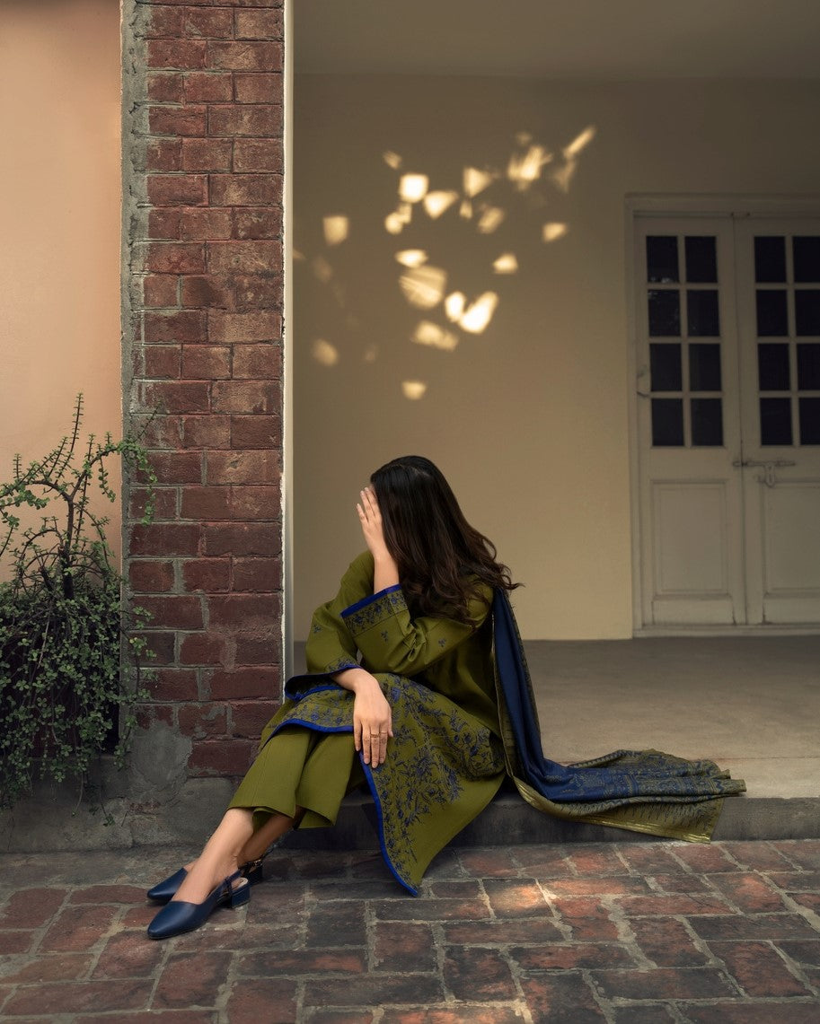 Discover the perfect look. Its olive-green khadder fabric offers warmth and structure, while intricate embroidery adds a delicate contrast, creating a refined and graceful silhouette. The softly contrasted dupatta, with hints of rose and gold, brings warmth and femininity, balancing tradition with modern elegance. This piece channels the quiet luxury of winter dressing—subtle, poised, and effortlessly sophisticated.
