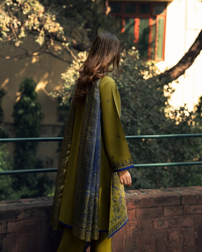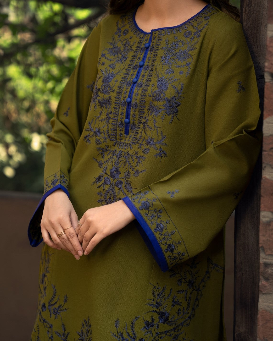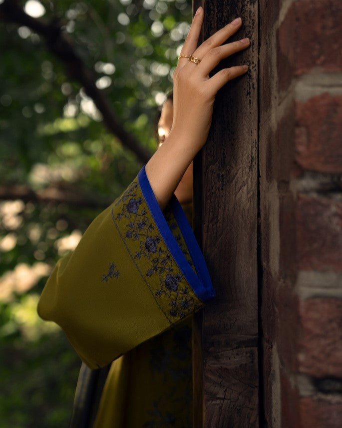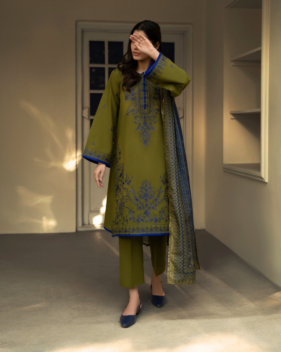 Discover the perfect look. Its olive-green khadder fabric offers warmth and structure, while intricate embroidery adds a delicate contrast, creating a refined and graceful silhouette. The softly contrasted dupatta, with hints of rose and gold, brings warmth and femininity, balancing tradition with modern elegance. This piece channels the quiet luxury of winter dressing—subtle, poised, and effortlessly sophisticated.