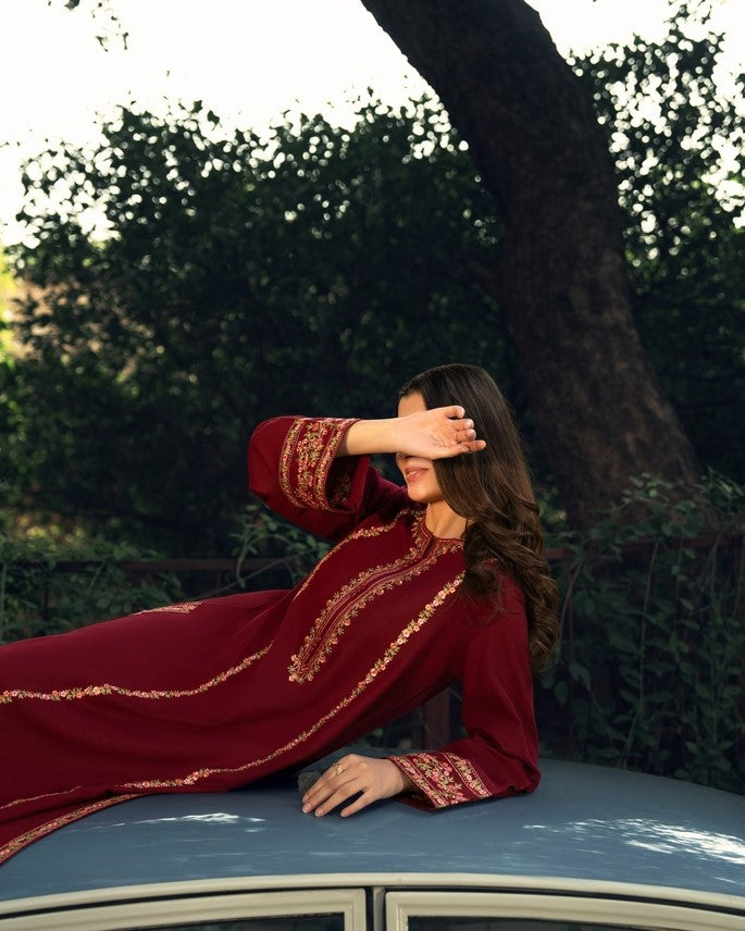 Discover the perfect look. Its deep, velvety khadder tones are adorned with delicate floral embroidery that flows like gilded vines, creating a rich and elegant visual appeal. The softly contrasted dupatta, with hints of rose and gold, adds warmth and femininity, balancing tradition with a modern silhouette. This piece embodies the quiet luxury of winter dressing—rich, poised, and beautifully understated.