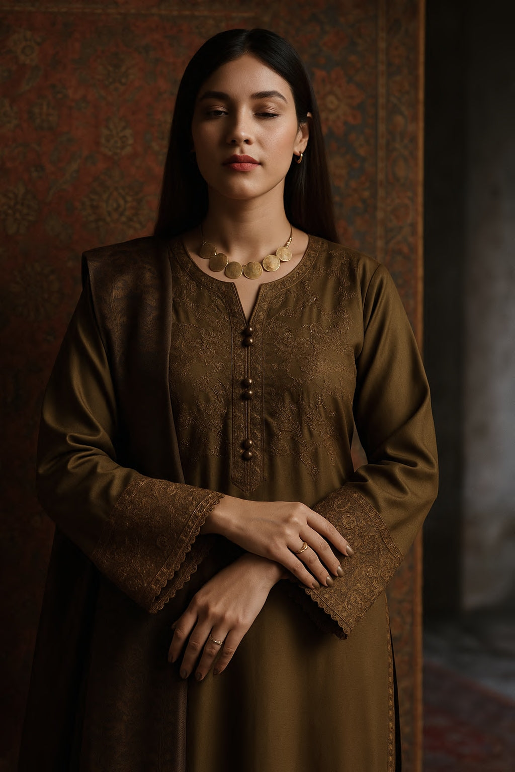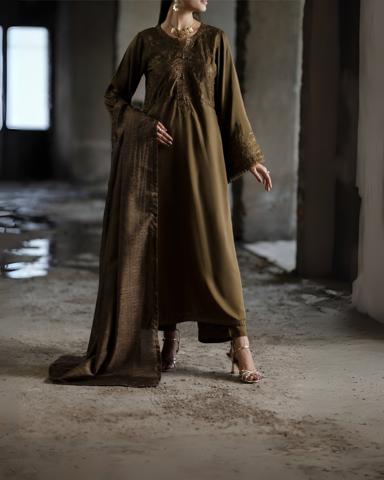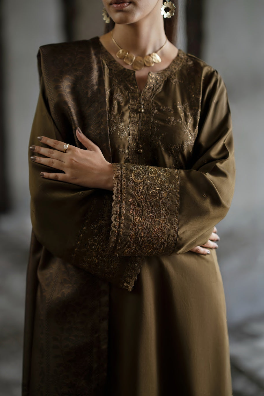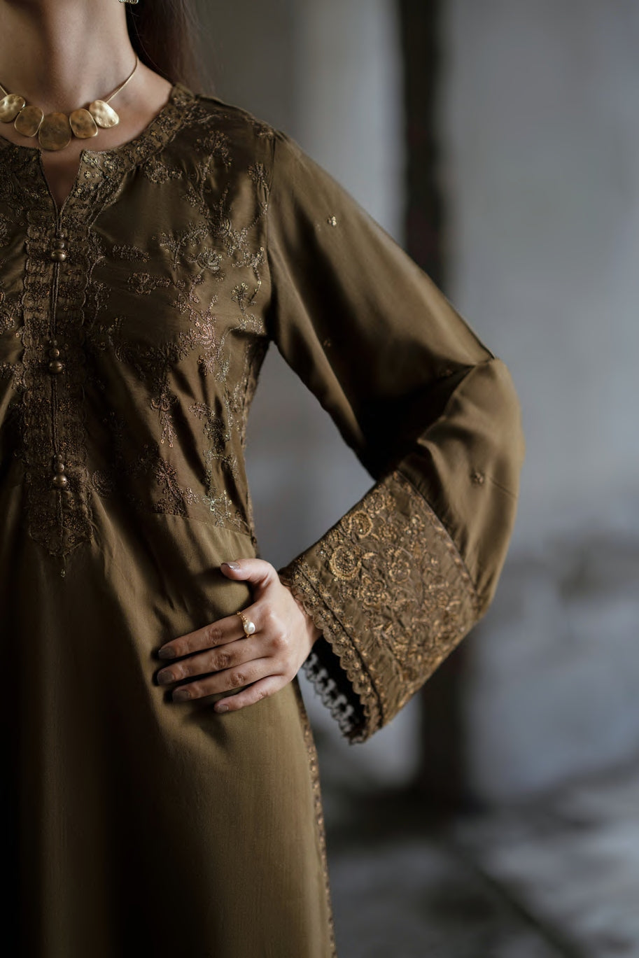 This ensemble features a silk-viscose suit paired with a matching dupatta, enhancing the design’s depth and elegance. The smooth fabric drapes effortlessly, creating a flowy silhouette with a touch of refined sophistication. Perfect for both day functions and evening gatherings, it’s a versatile outfit that embodies grace and style, making it an ideal choice where understated luxury is key.