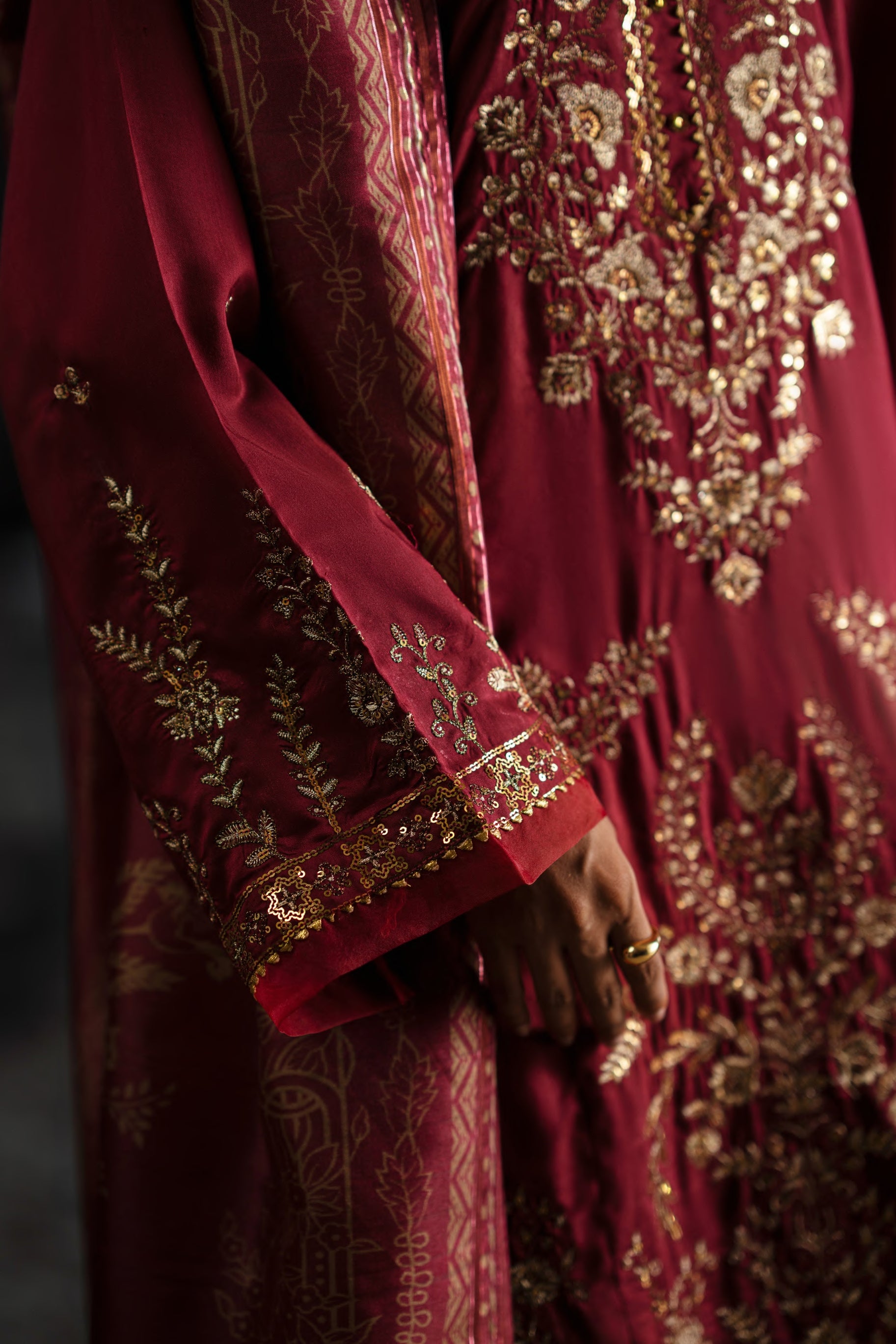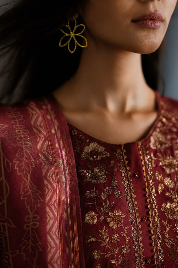 This outfit is a silk-viscose ensemble crafted to embody refinement and grace. The premium silk-viscose blend offers a rich texture with a natural sheen and a graceful drape, making it an ideal choice for festive gatherings and formal occasions.