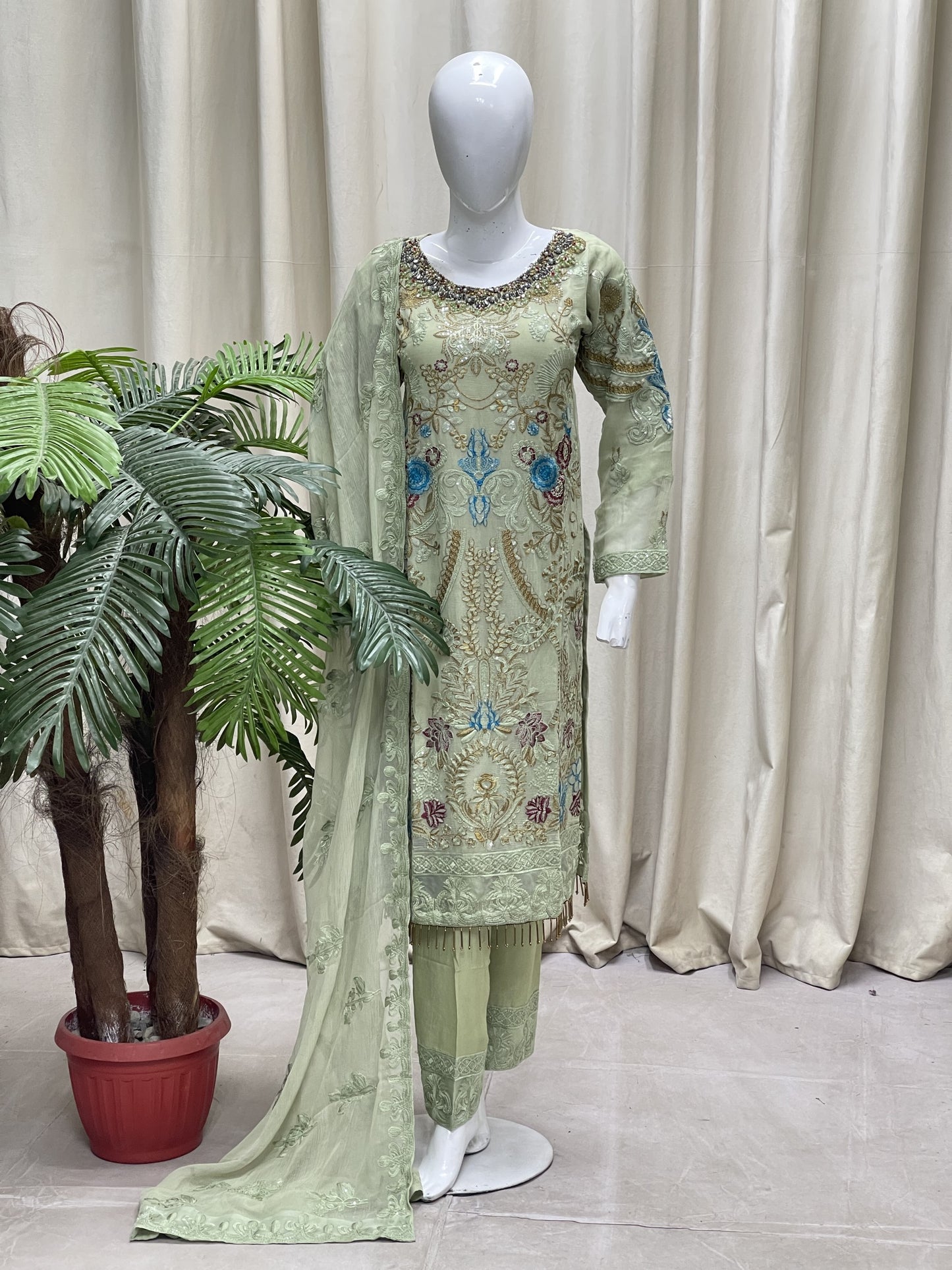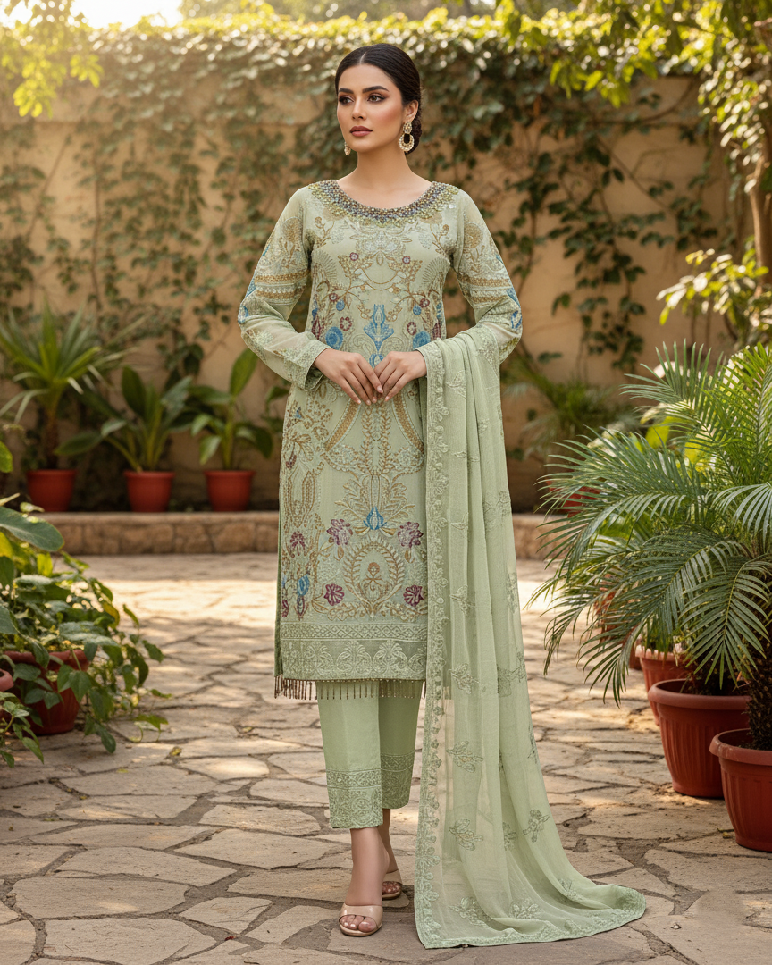 Get ready to look stunning with SJ3008 1 Pista By SH! This 3PC Ready To Wear set includes a delicate chiffon shirt, a matching dupatta, and comfortable grip trousers. Perfect for any occasion, this set will make you stand out and feel confident.