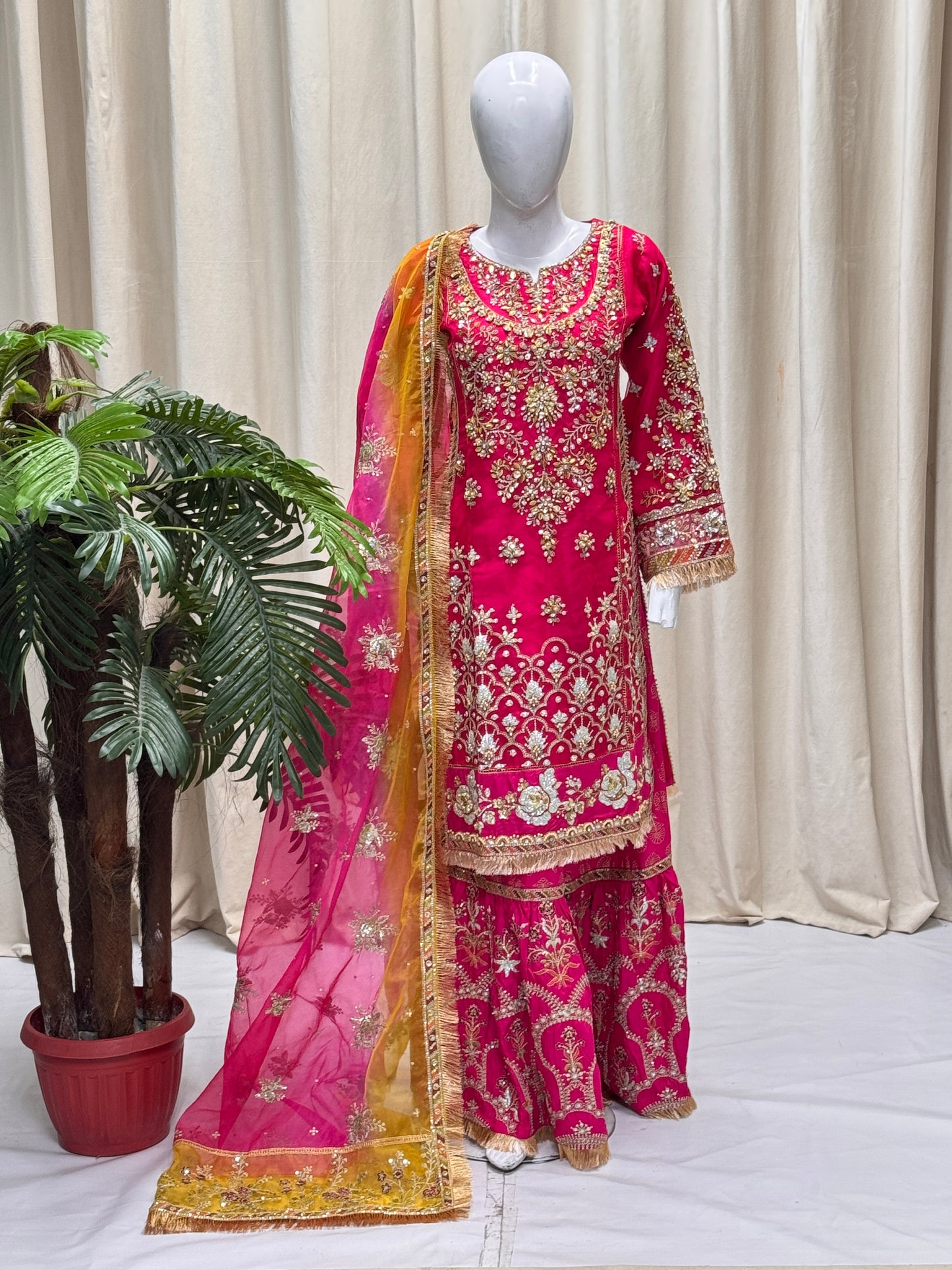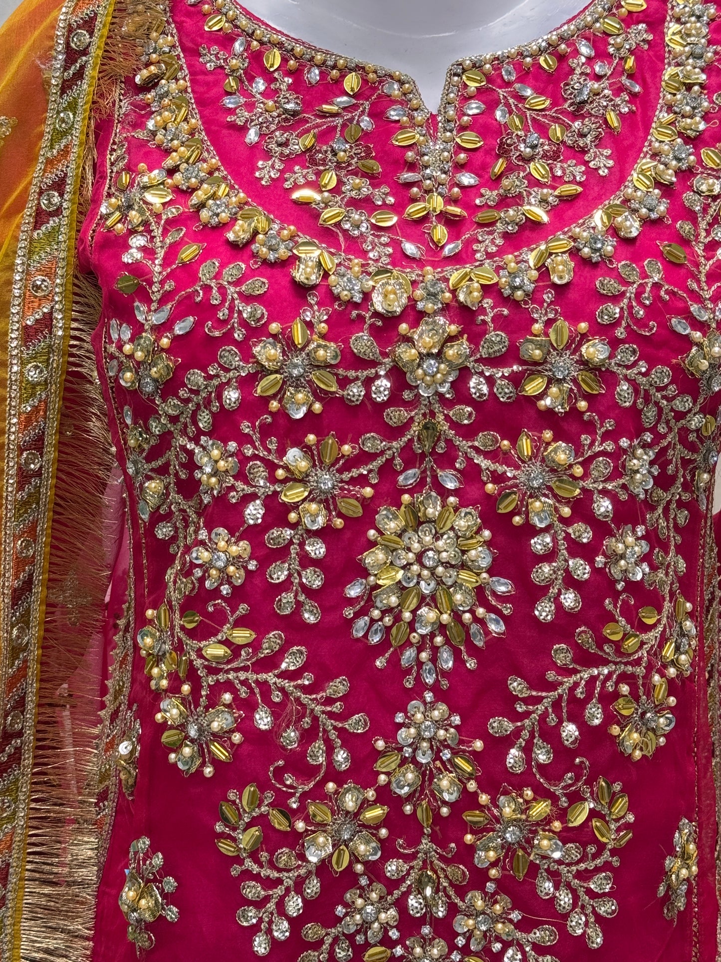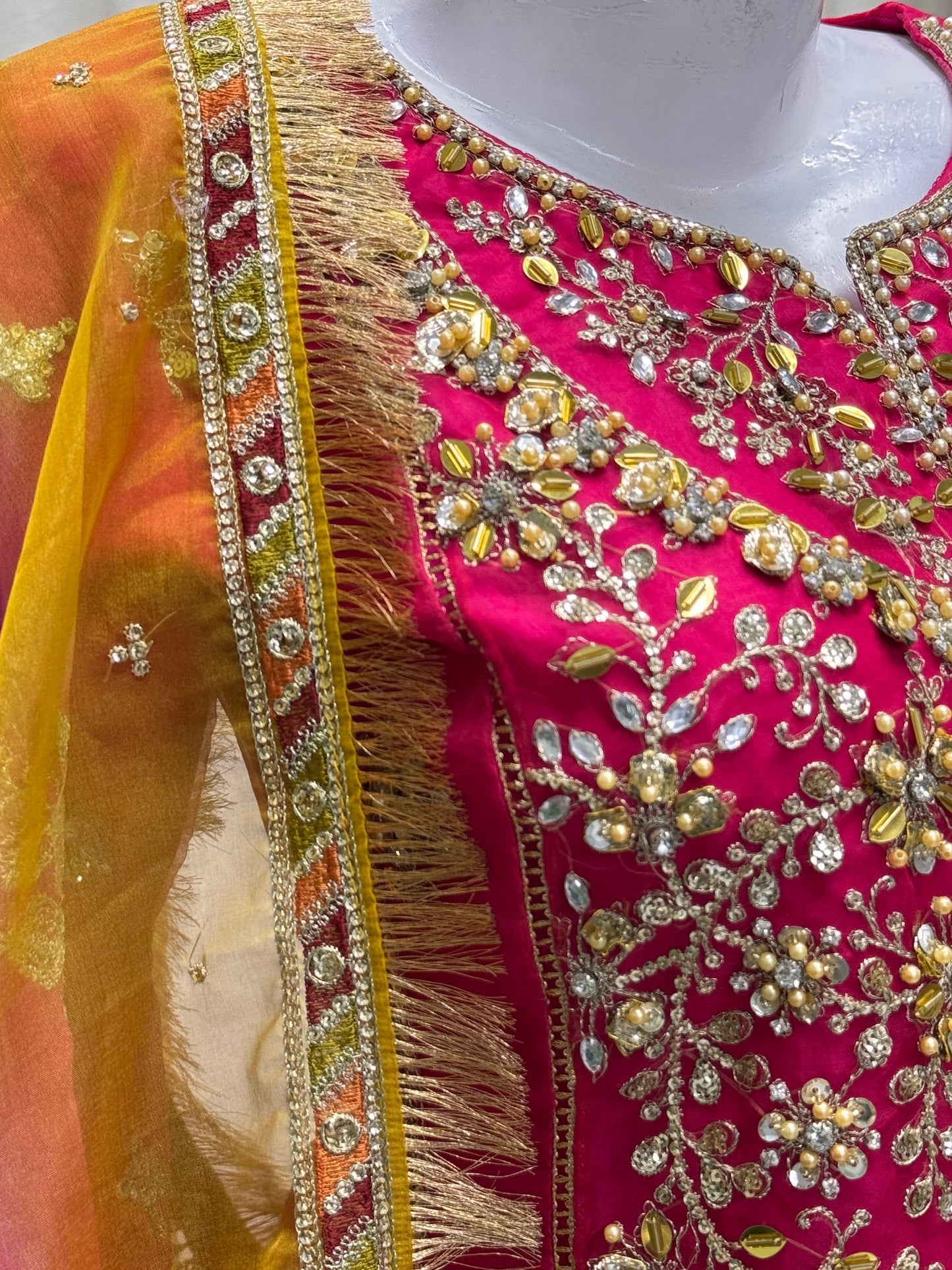 Introducing SJ3156 by Mohsin, the perfect 3PC ready-to-wear outfit for your next occasion. Made with high-quality Organza fabric, this set includes a beautiful shirt, dupatta, and gharara for a complete and stylish look. Feel confident and elegant in this exclusive design by Mohsin.