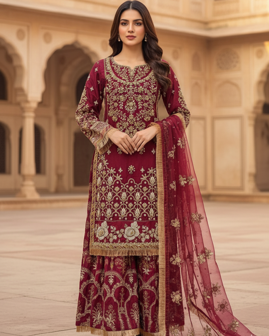 This stunning 3-piece formal dress is a perfect pick for a mehndi event, featuring a rich contrast combination that exudes festive elegance. The shirt is beautifully adorned with tilla, sequins, pearls, and subtle contrast embroidery, elevated with delicate foil work that adds a soft shimmer. It’s paired with a graceful grip plazo that offers both style and comfort. Completing the ensemble is a flowy organza dupatta, adding a light, ethereal touch to this celebration-ready outfit.