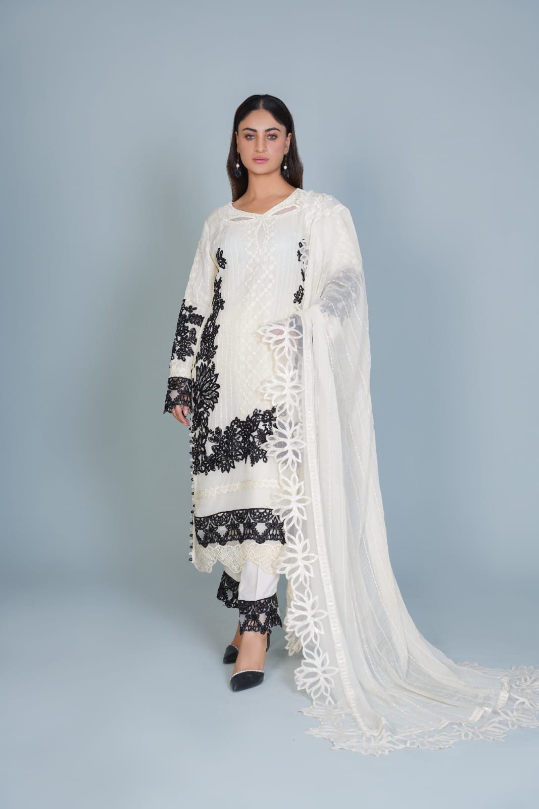 Introducing SJ3276 Off White, the perfect 3PC ready-to-wear outfit for any occasion. This set includes a long shirt, chiffon dupatta, and grip trouser, all in elegant off-white. Made with high-quality chiffon fabric, this outfit is both comfortable and stylish. Elevate your look with SJ3276 Off White.