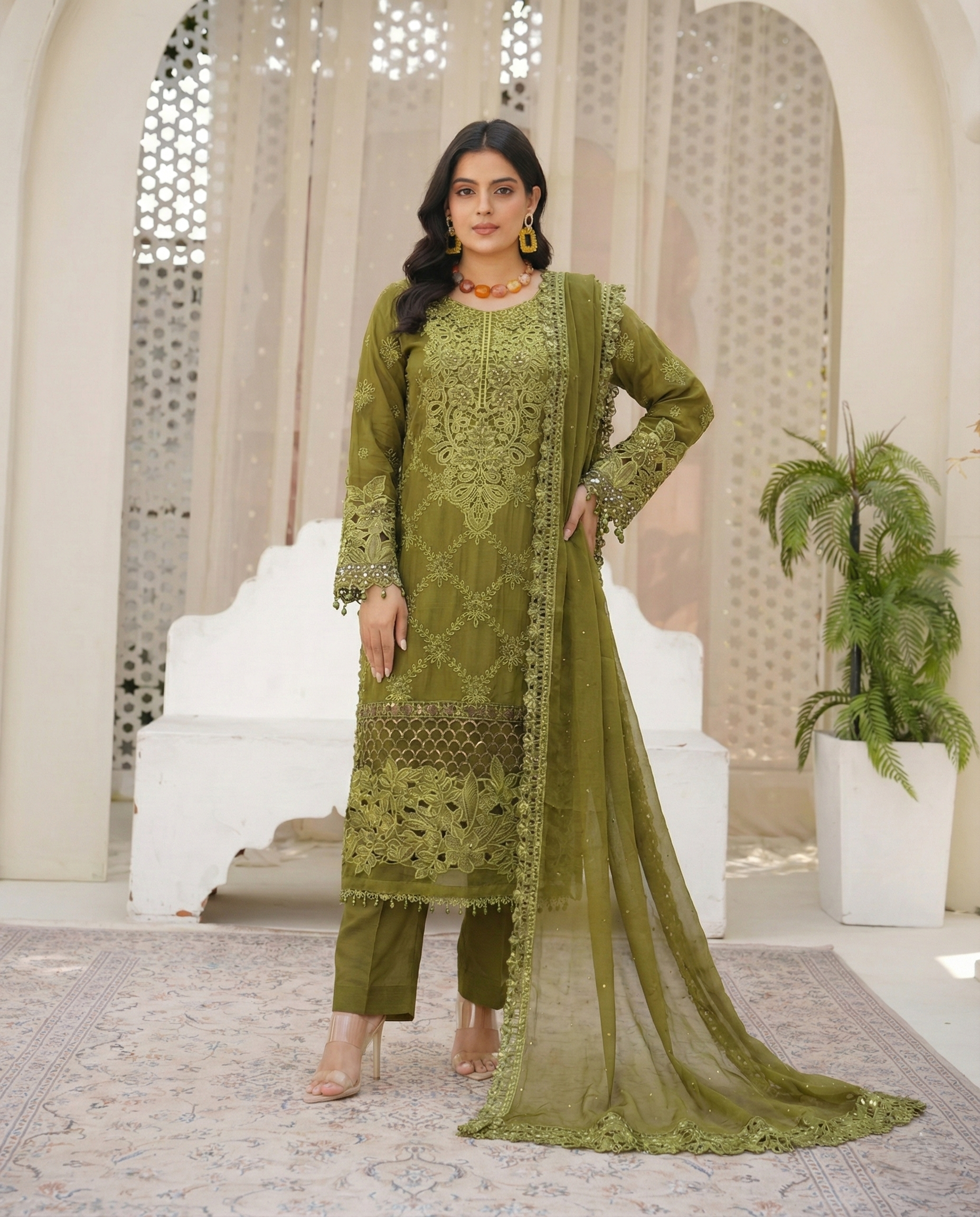 Discover the perfect look. Its refined threadwork and hand-embellished cut dana and sequins bring a soft shimmer to your every move. A graceful blend of tradition and modern elegance, perfect for festive evenings and special occasions.