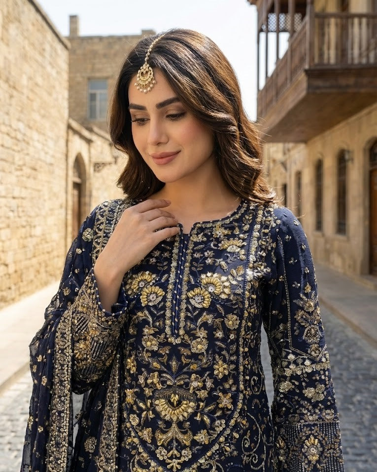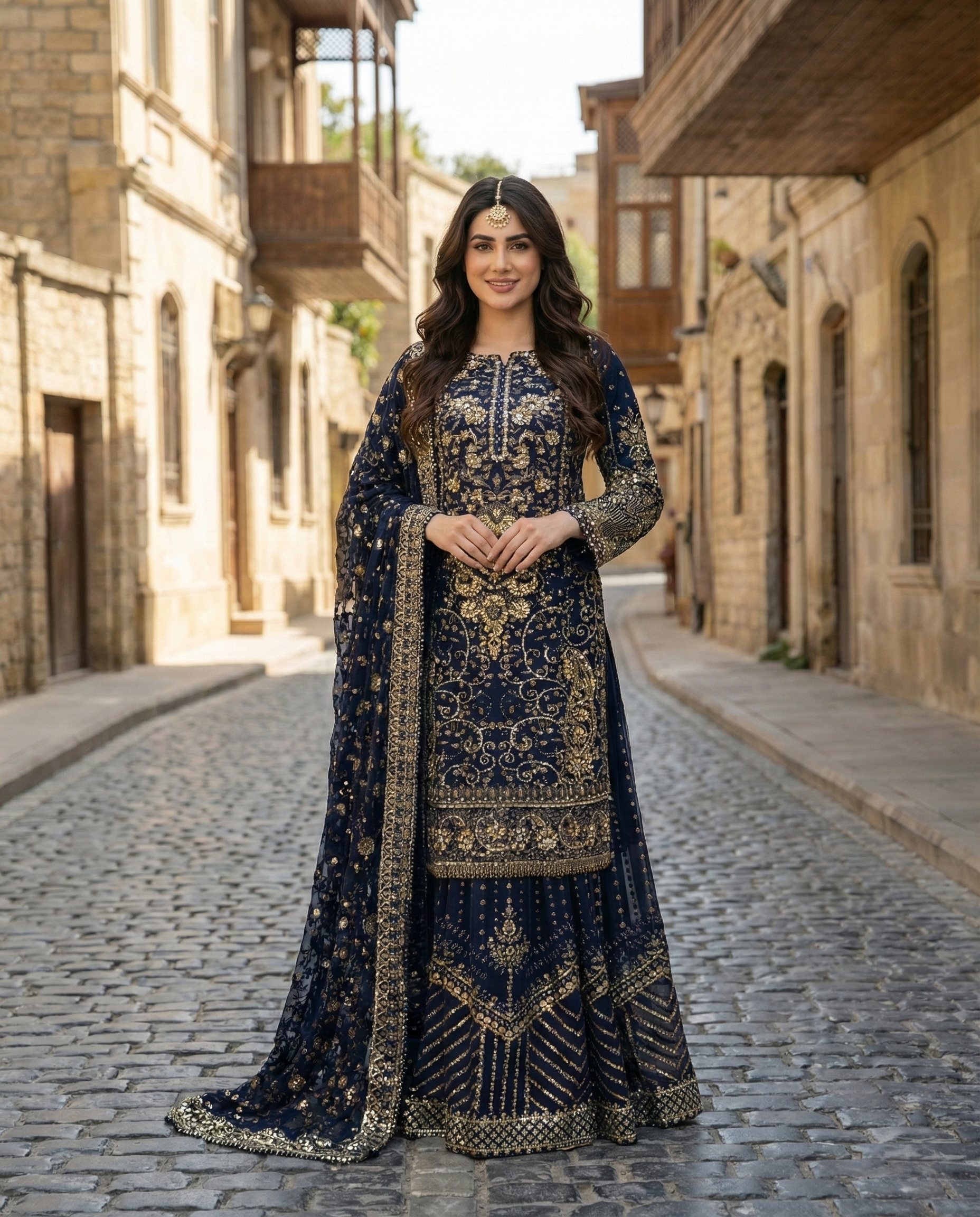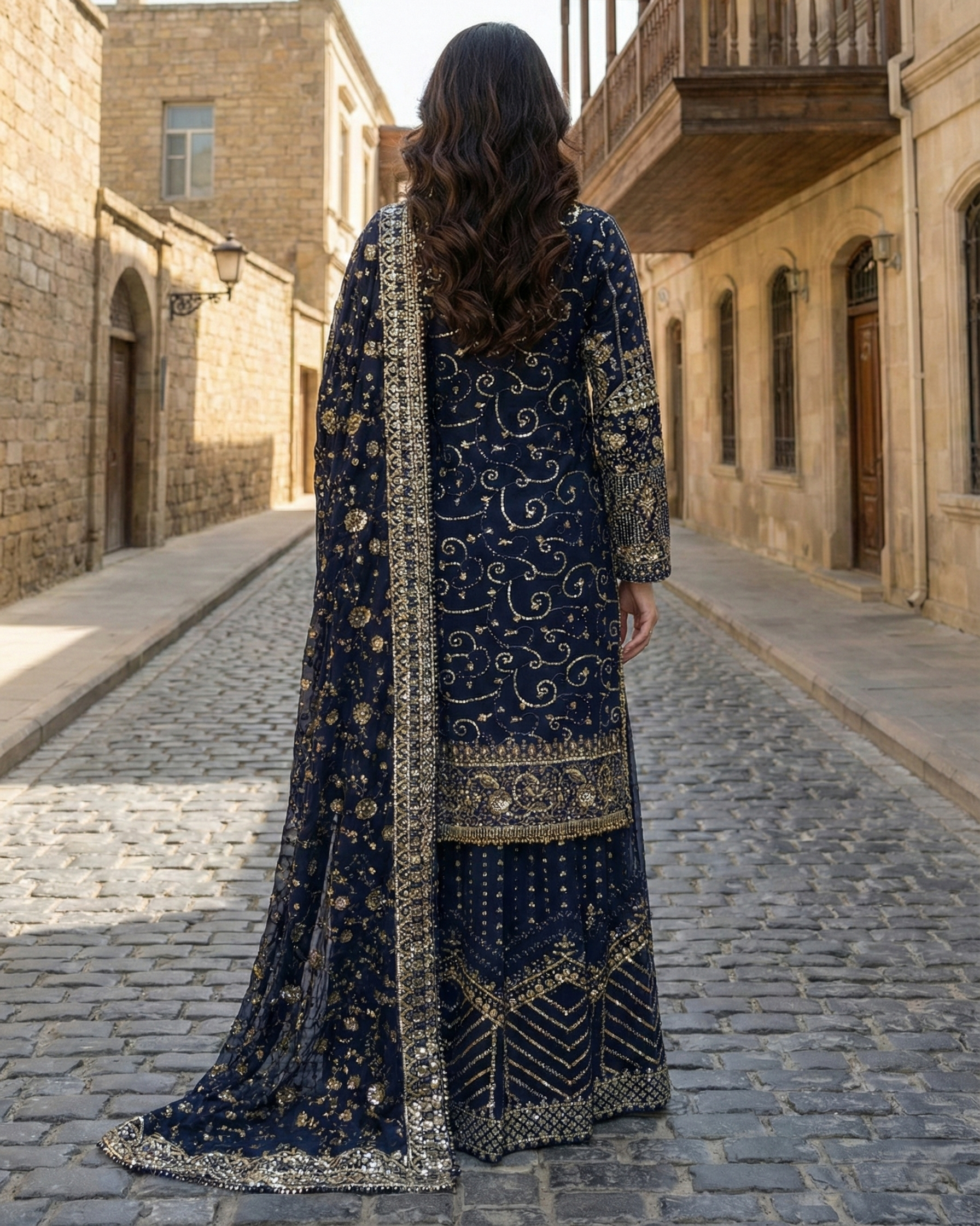 Expertly crafted and ready to wear, the SJ3403 Black set includes a stylish shirt, dupatta, and sharara, all made from high-quality chiffon fabric. With its modern cutline and luxurious texture, this set is perfect for any occasion. Elevate your wardrobe with this sophisticated and versatile ensemble.