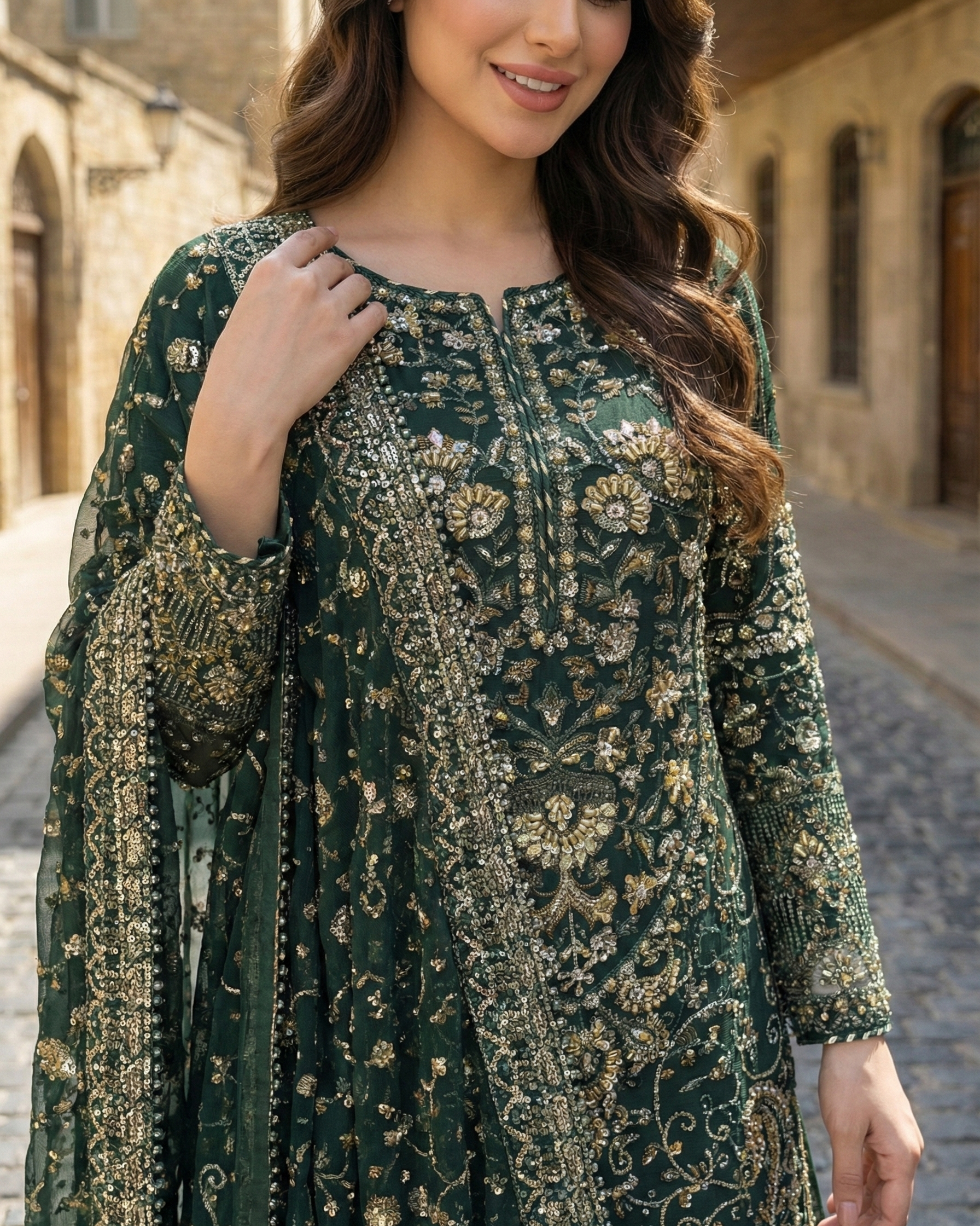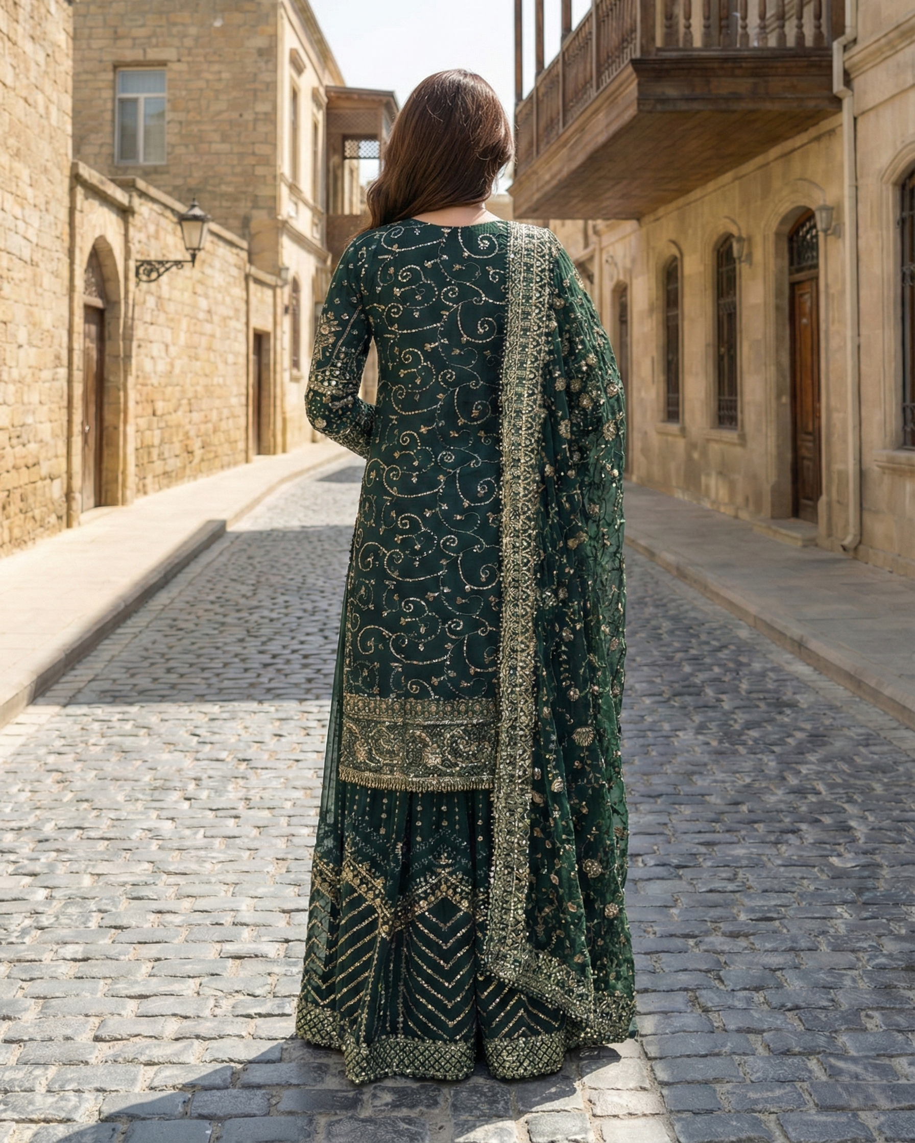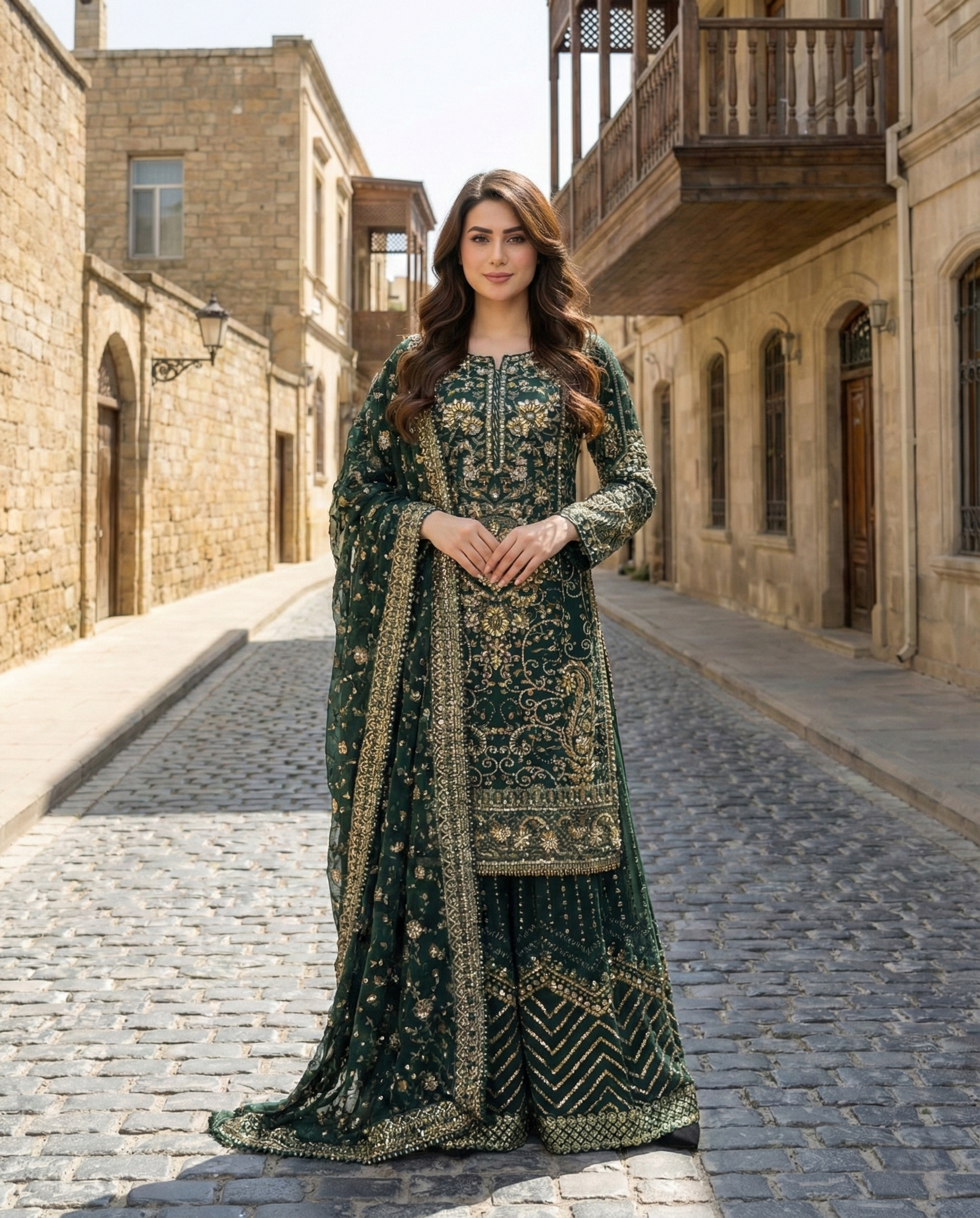 Expertly crafted and ready to wear, the SJ3403 Black set includes a stylish shirt, dupatta, and sharara, all made from high-quality chiffon fabric. With its modern cutline and luxurious texture, this set is perfect for any occasion. Elevate your wardrobe with this sophisticated and versatile ensemble.