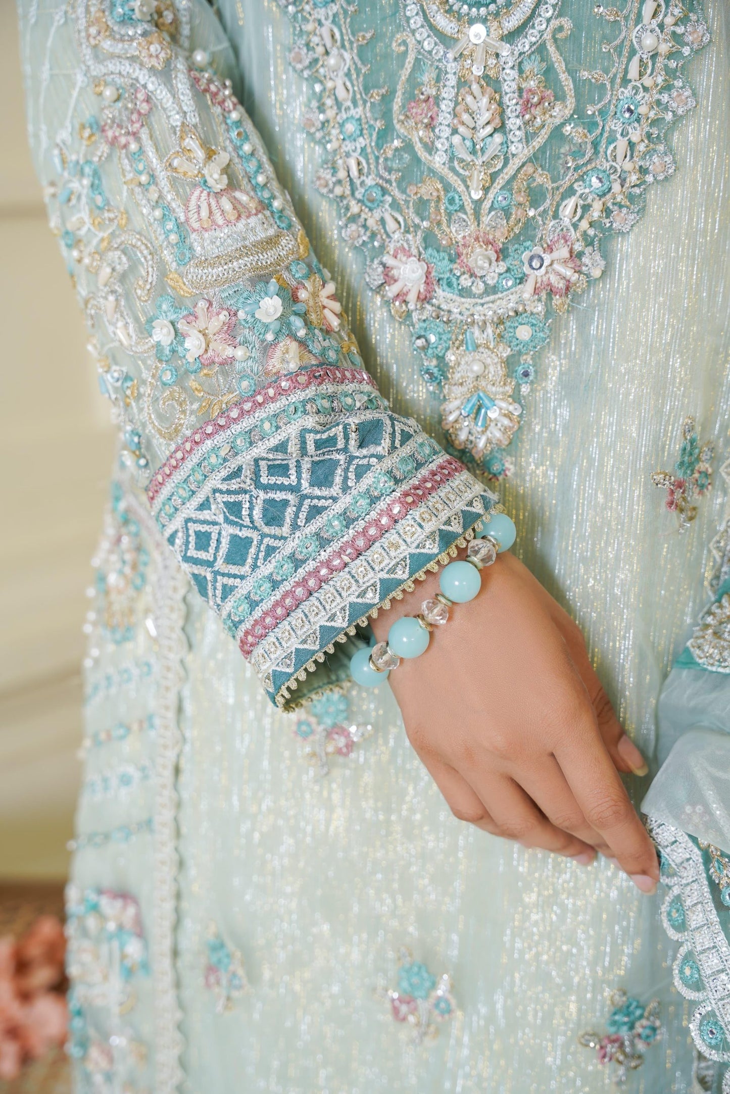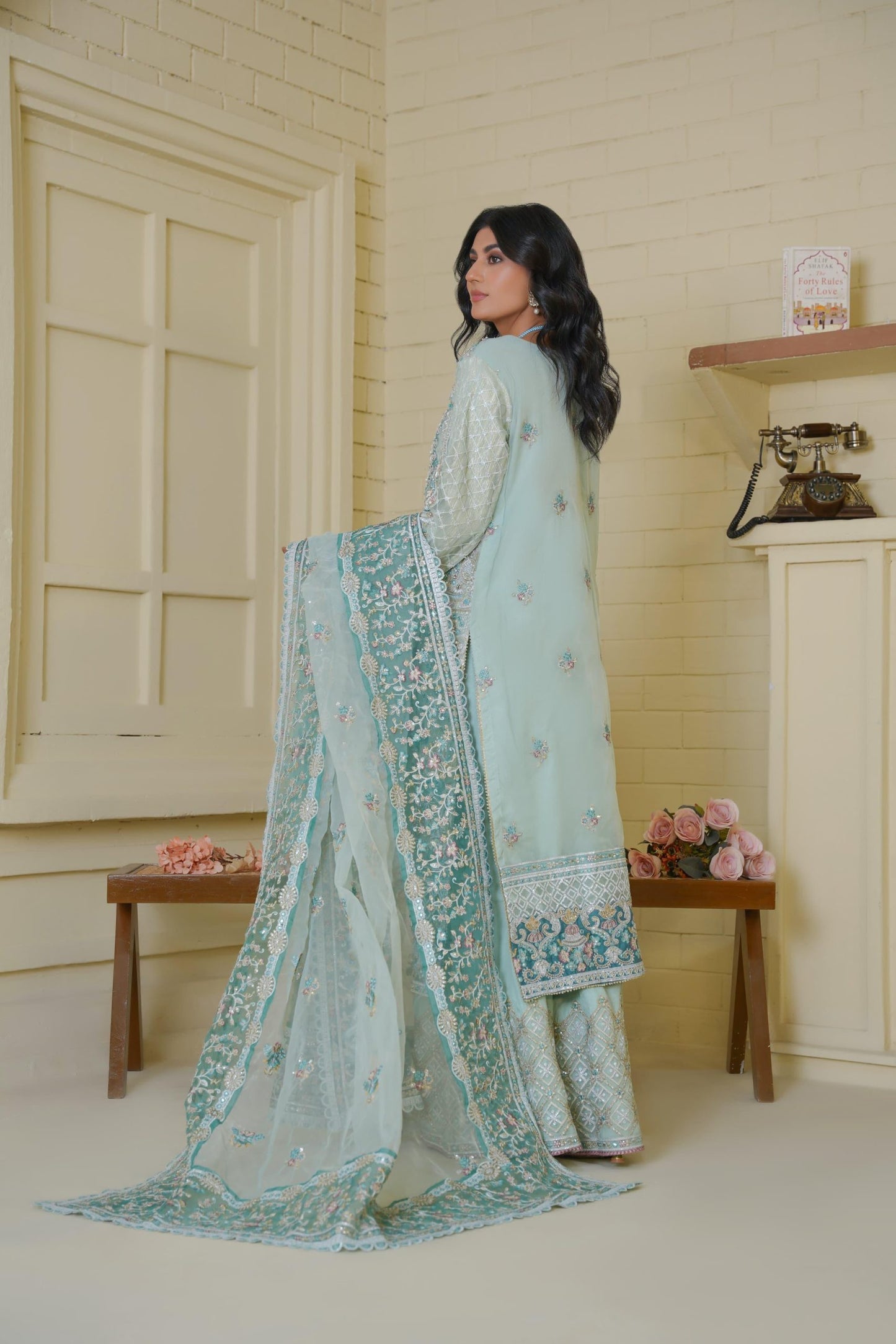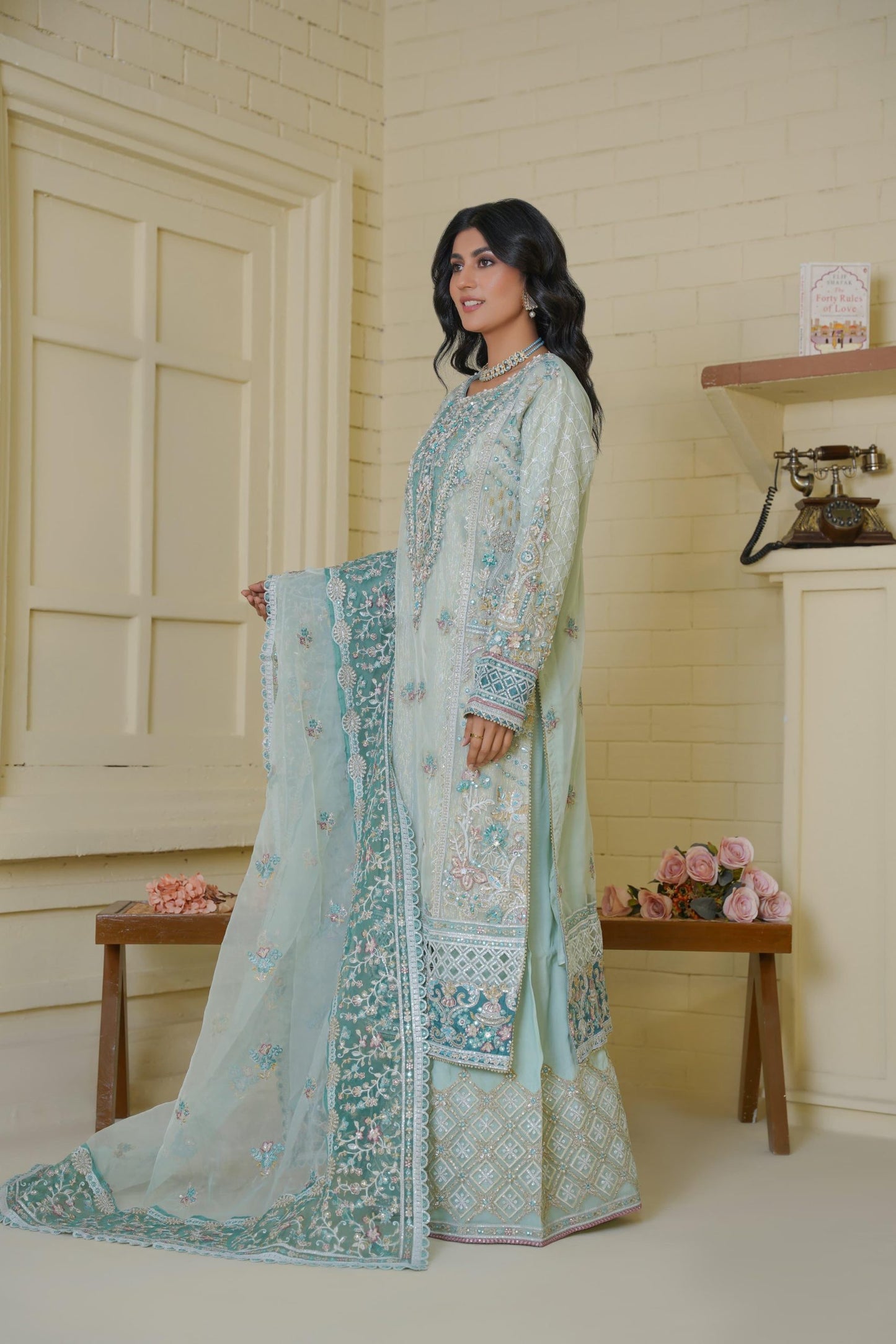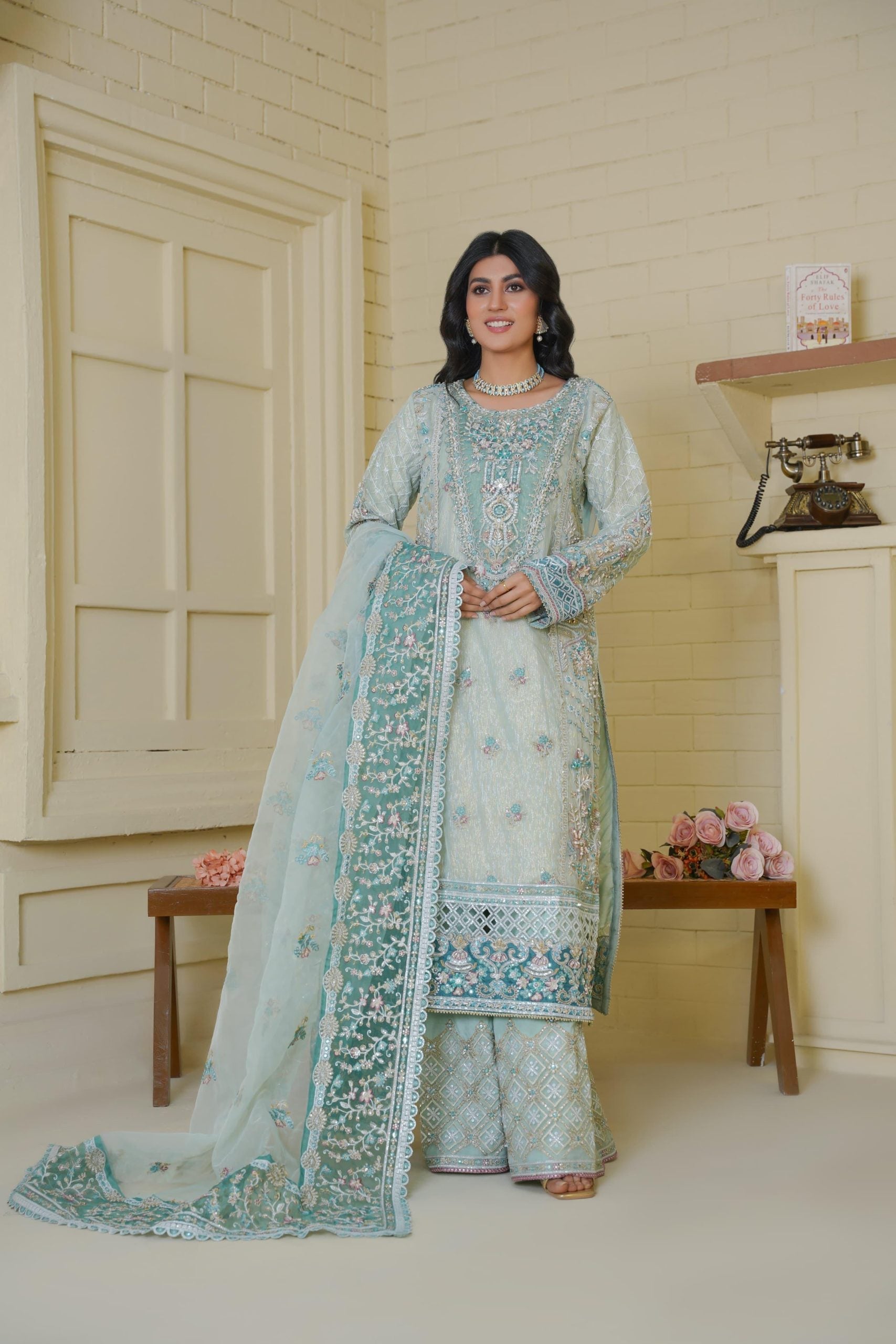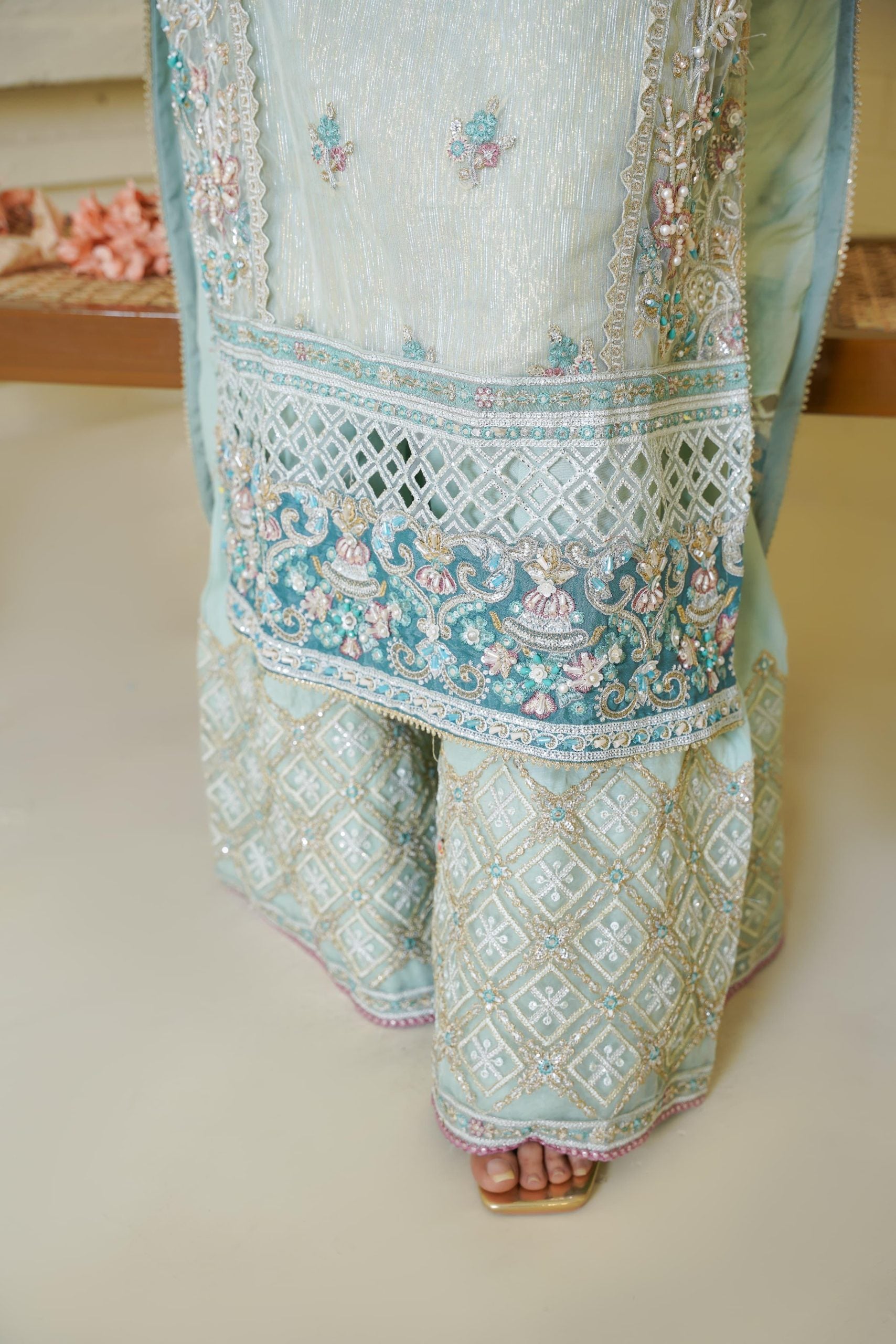 Discover the perfect look. Its intriguing details make it a must-have for any wardrobe. Designed for comfort and style, you'll feel confident and fashionable every time you wear it. Upgrade your look today with this outfit. This luxurious 3PC ensemble features a handmade organza shirt with tilla detailing, heavy embroidery, and refined patchwork. Paired with a matching organza dupatta and sleek grip trousers, this look offers timeless grace perfect for festive occasions.