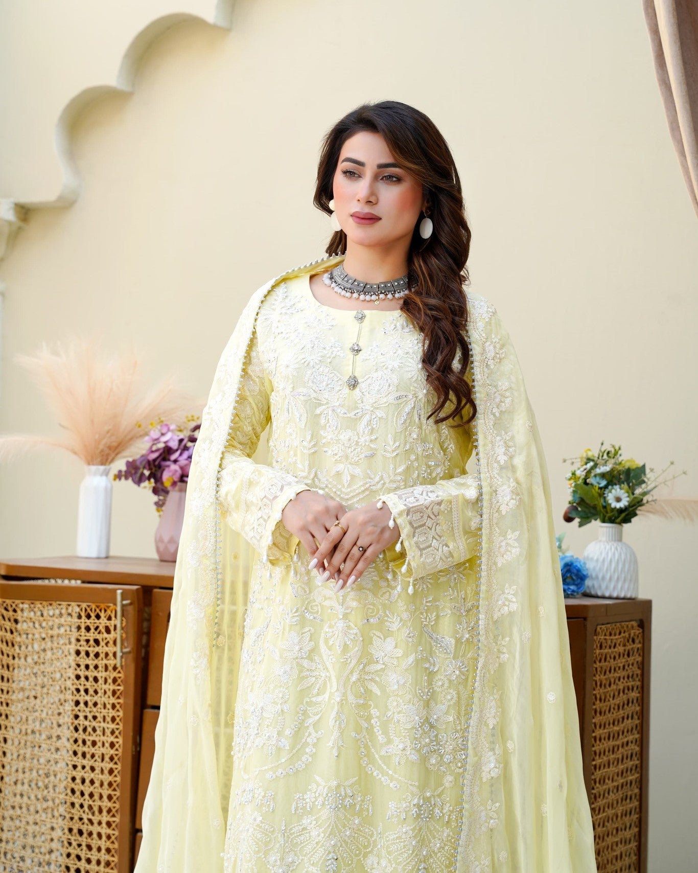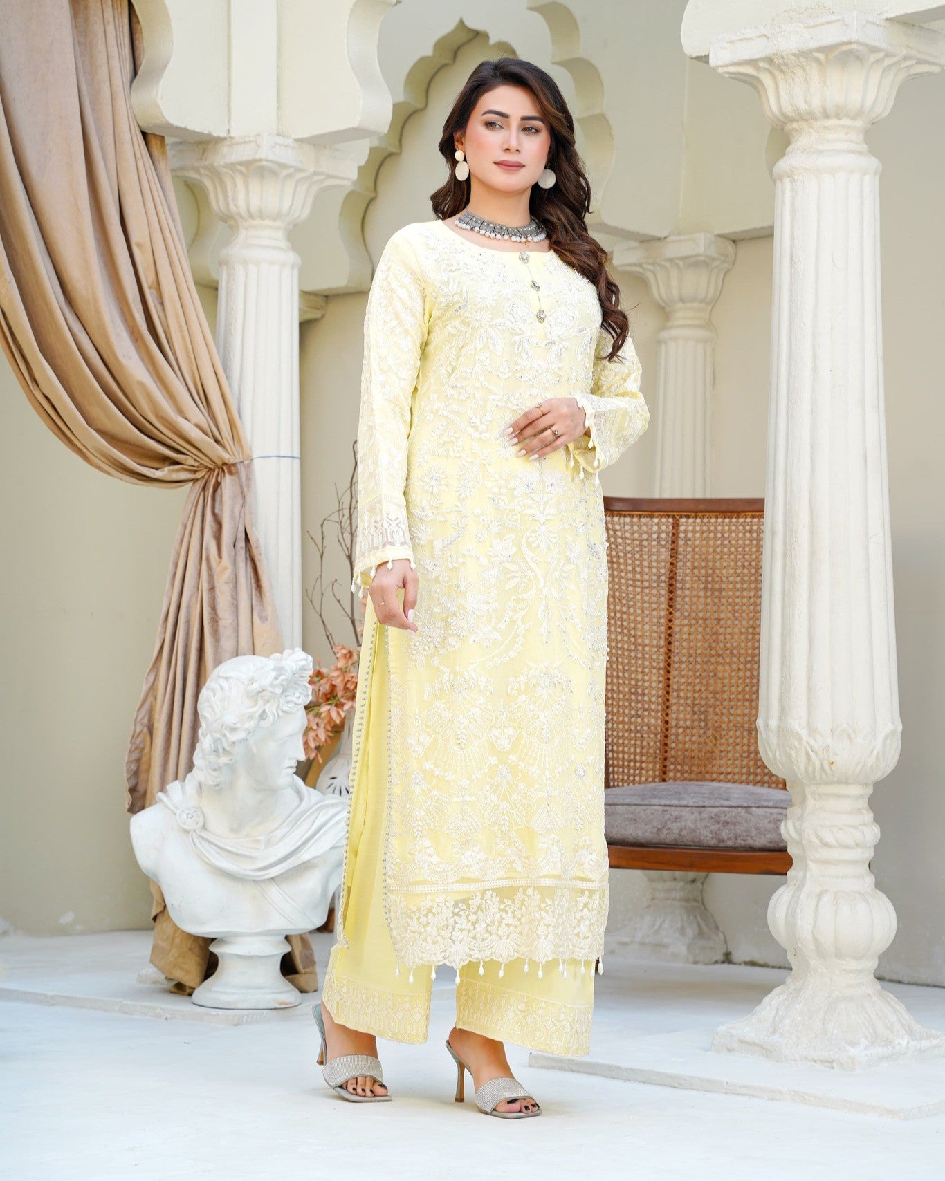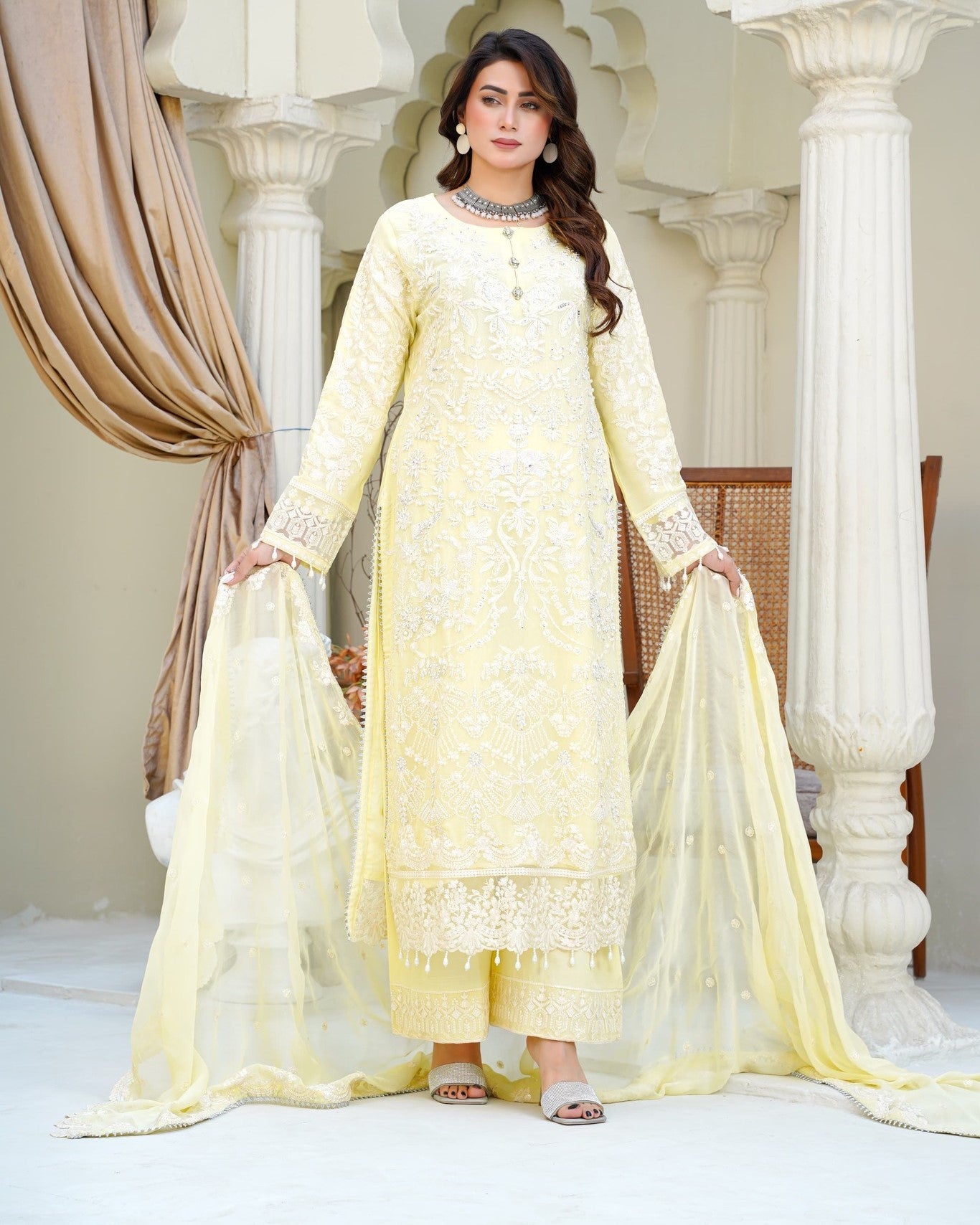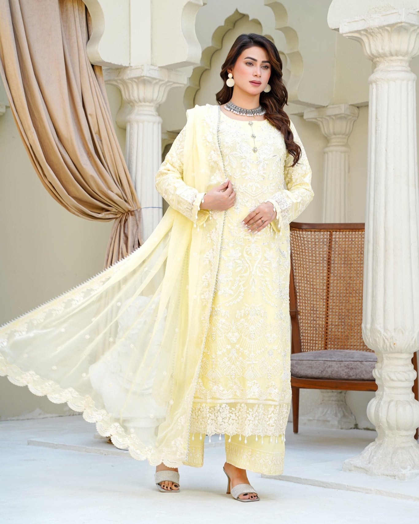 A straight chiffon shirt exudes timeless elegance, perfectly balanced with the flowing charm of crush palazzo trousers. Paired with a matching chiffon dupatta for a light, airy finish—crafted for comfort, style, and a touch of luxury.
