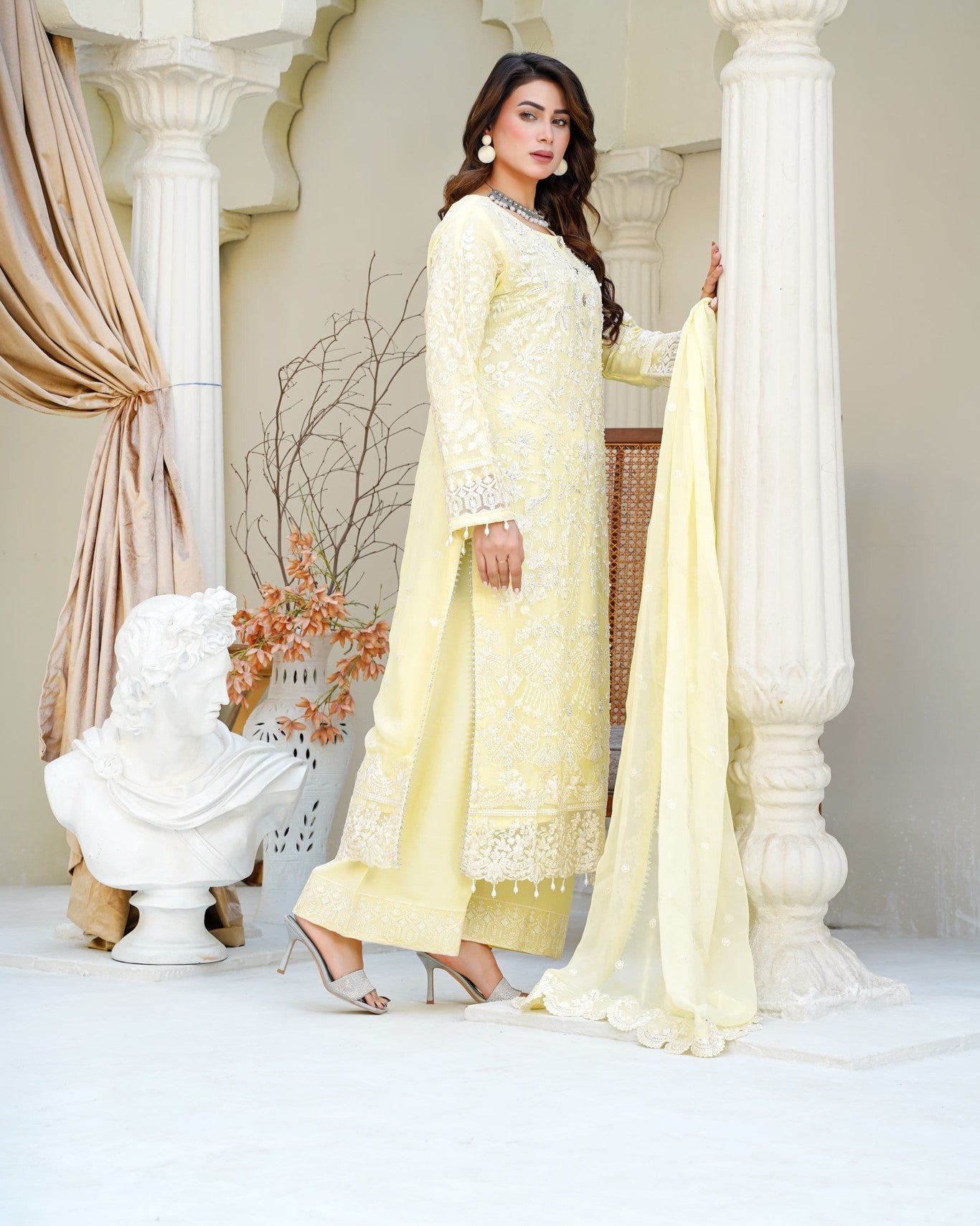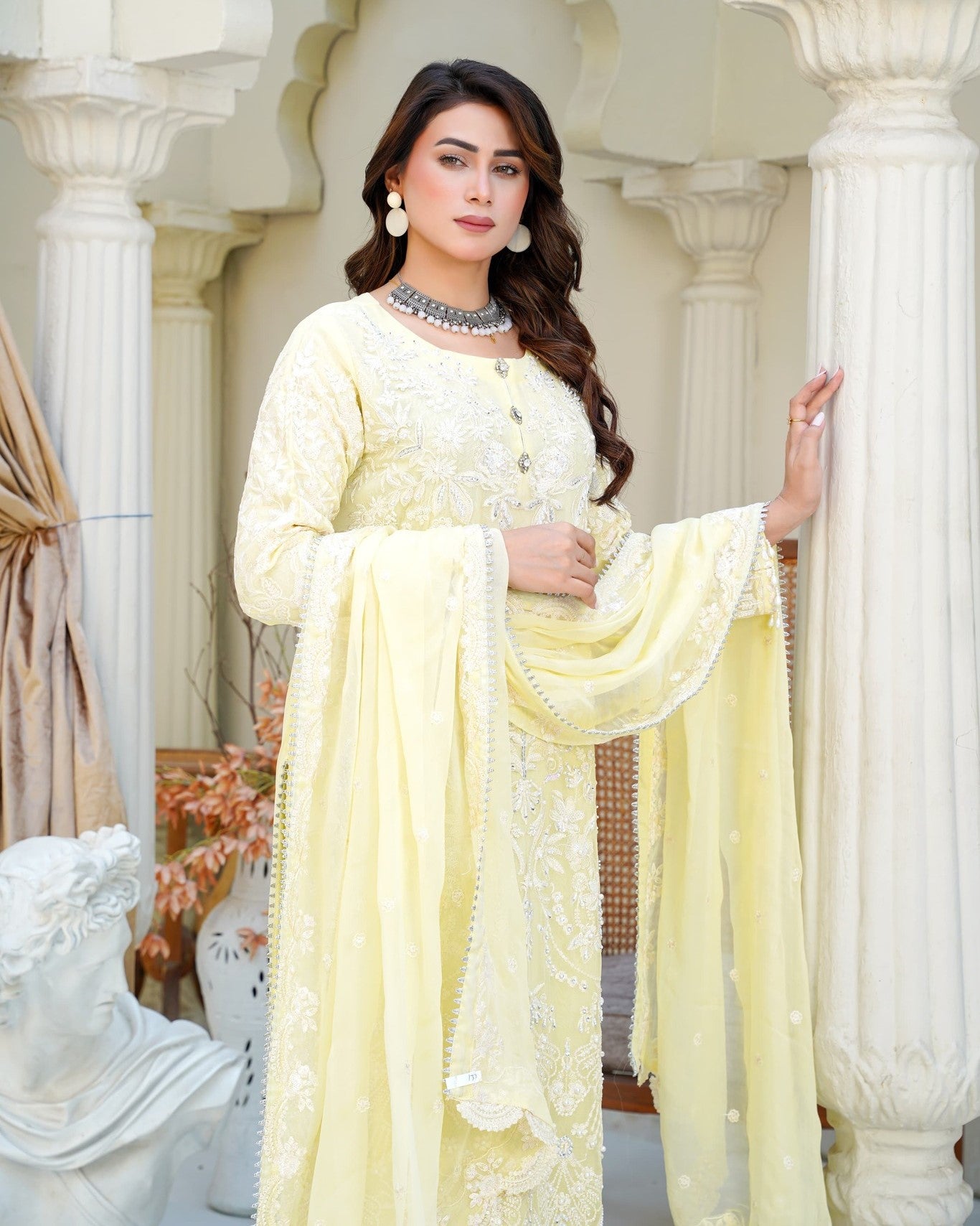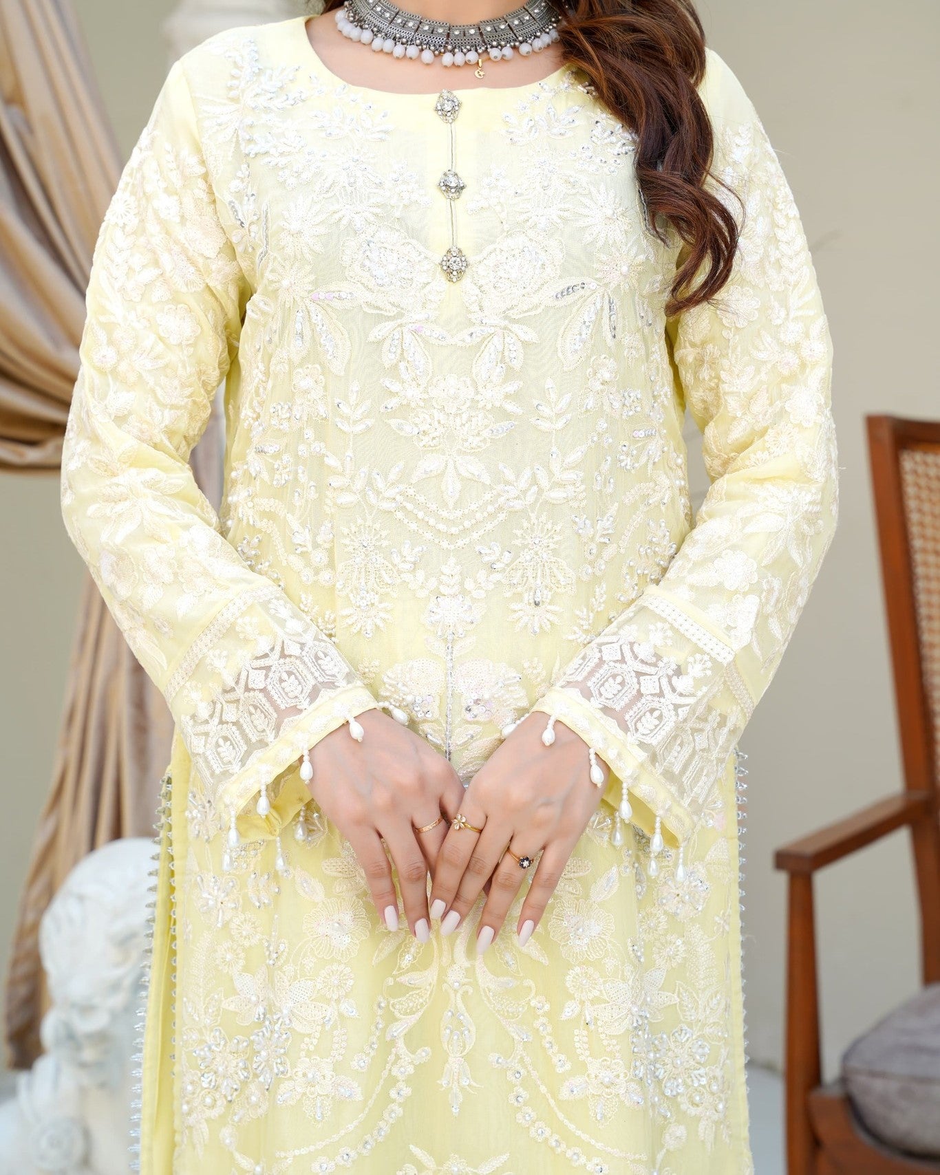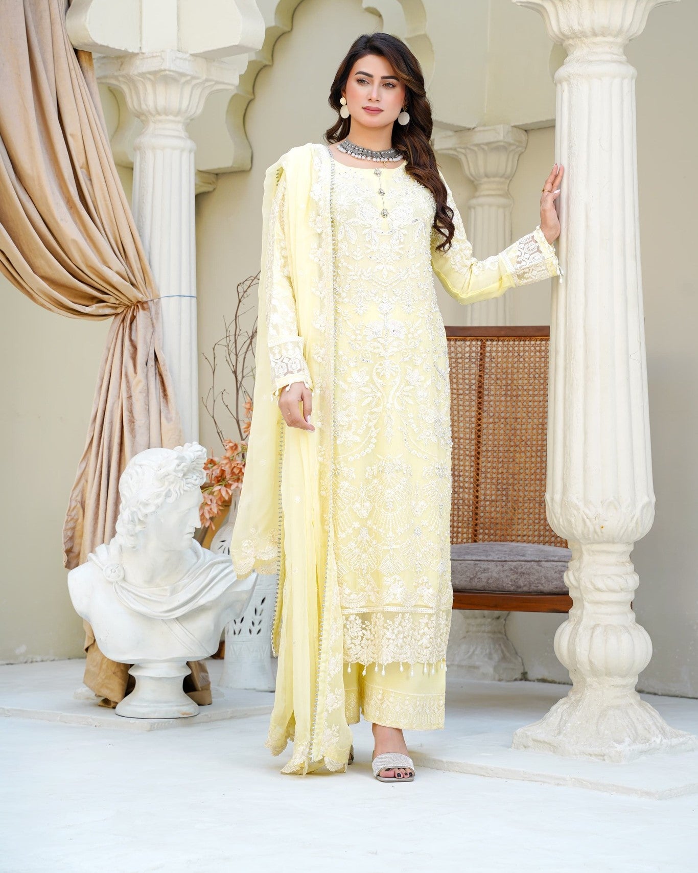 A straight chiffon shirt exudes timeless elegance, perfectly balanced with the flowing charm of crush palazzo trousers. Paired with a matching chiffon dupatta for a light, airy finish—crafted for comfort, style, and a touch of luxury.