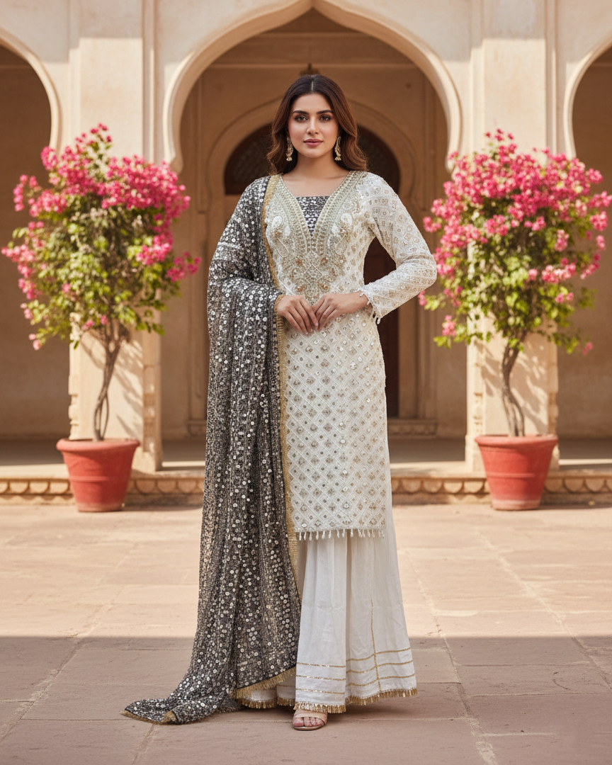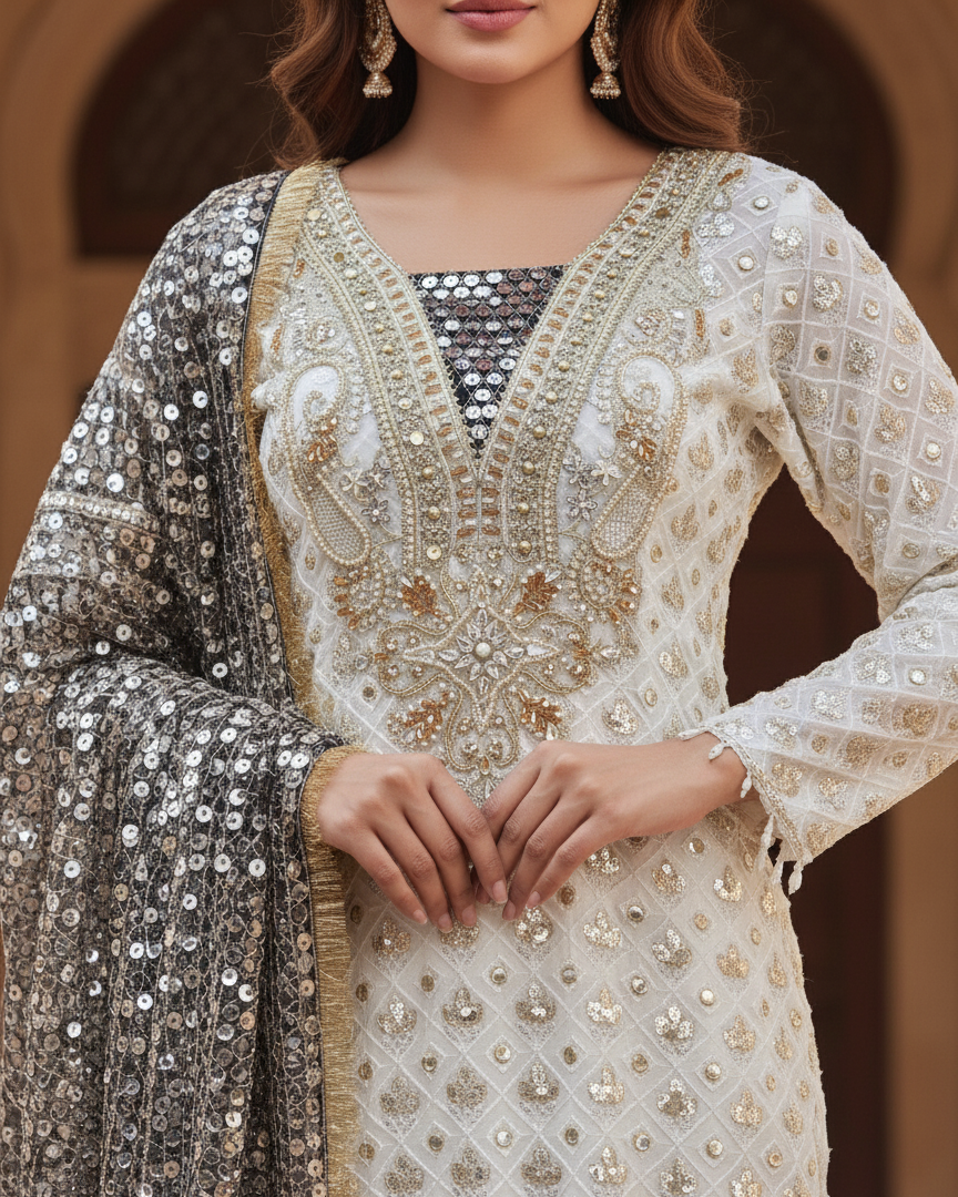 Discover the perfect look. With its delicate handmade thread, tilla, and sequins work, this outfit brings festive elegance to life. The flowy silhouette paired with graceful embellishments makes it a go-to for any formal event. Feel effortlessly beautiful in every step.
