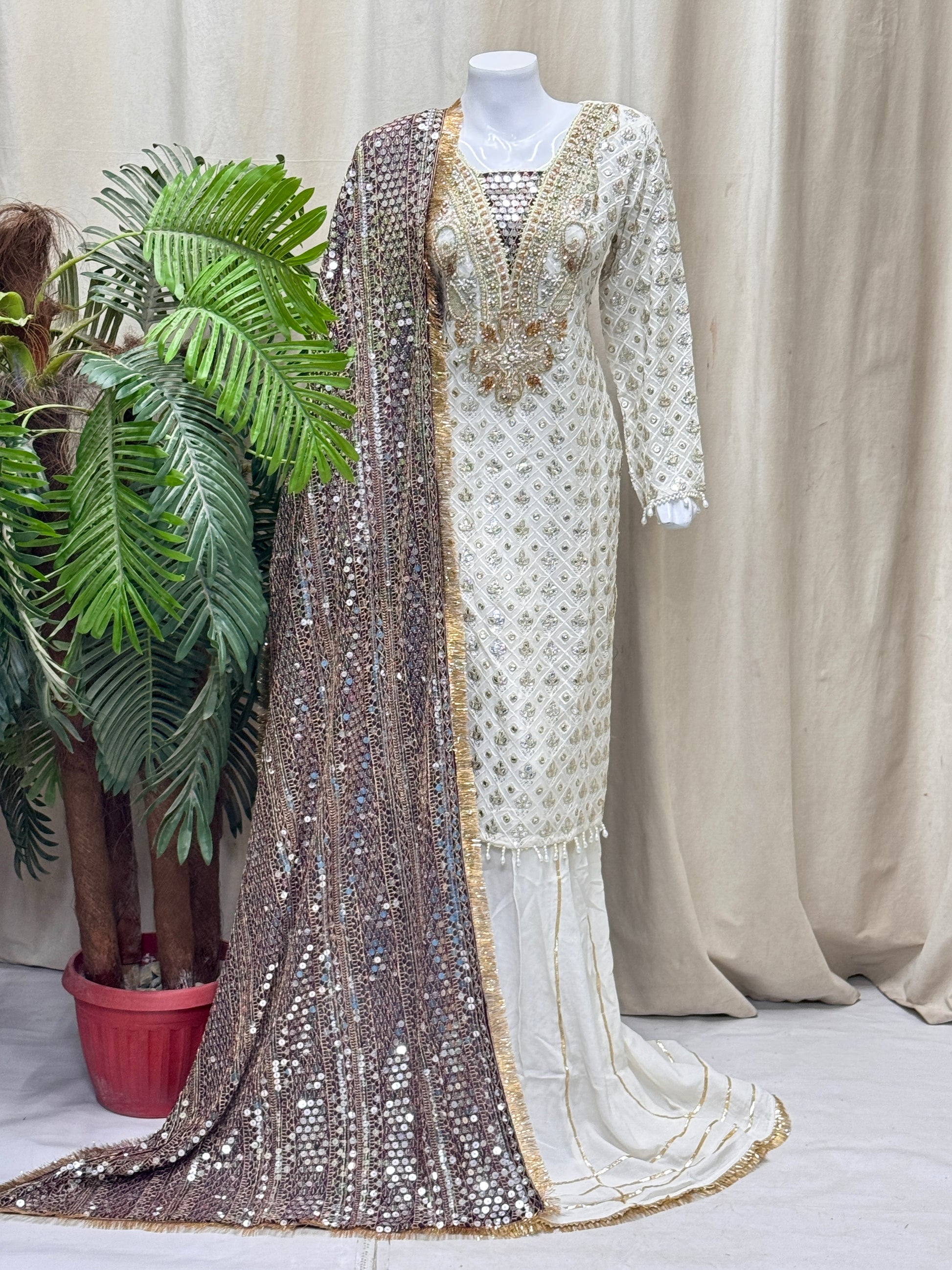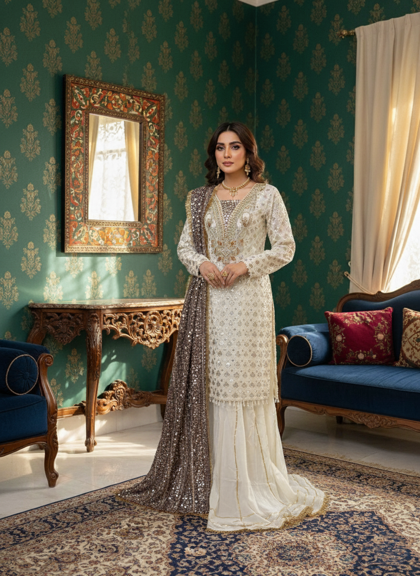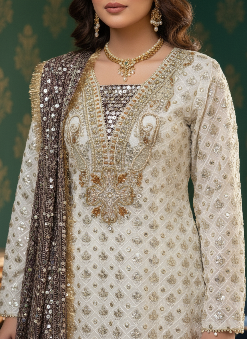 Discover the perfect look. With its delicate handmade thread, tilla, and sequins work, this outfit brings festive elegance to life. The flowy silhouette paired with graceful embellishments makes it a go-to for any formal event. Feel effortlessly beautiful in every step.