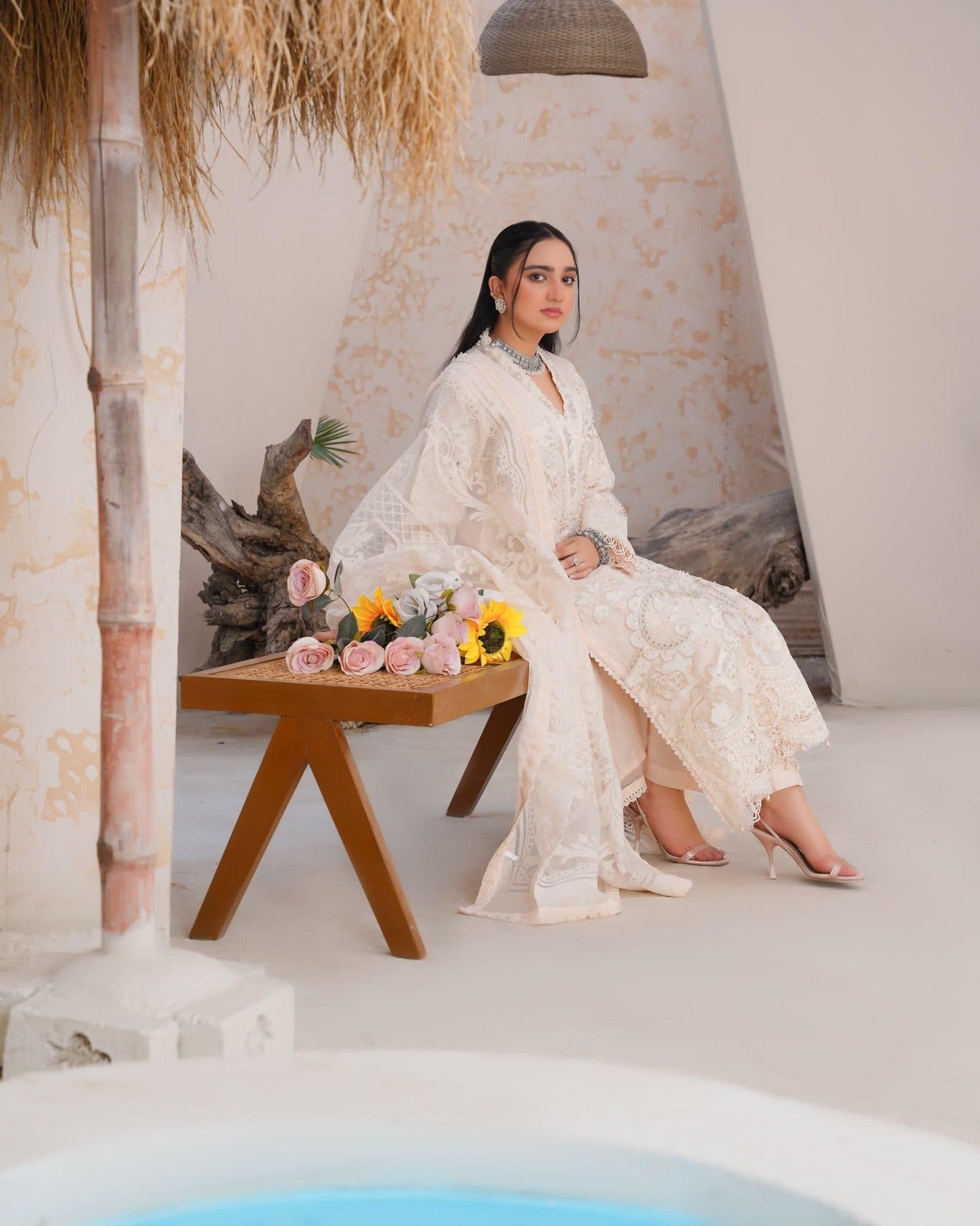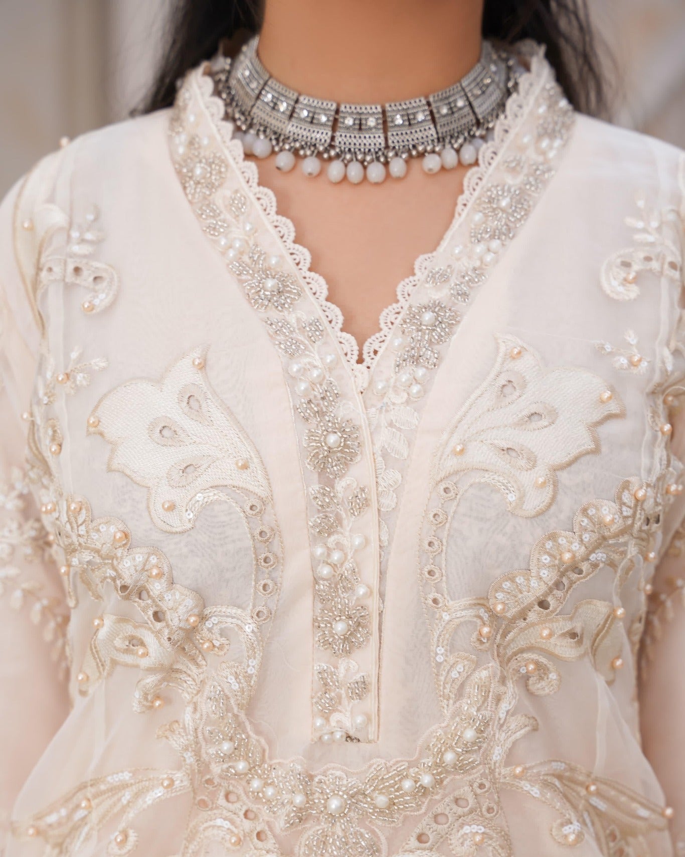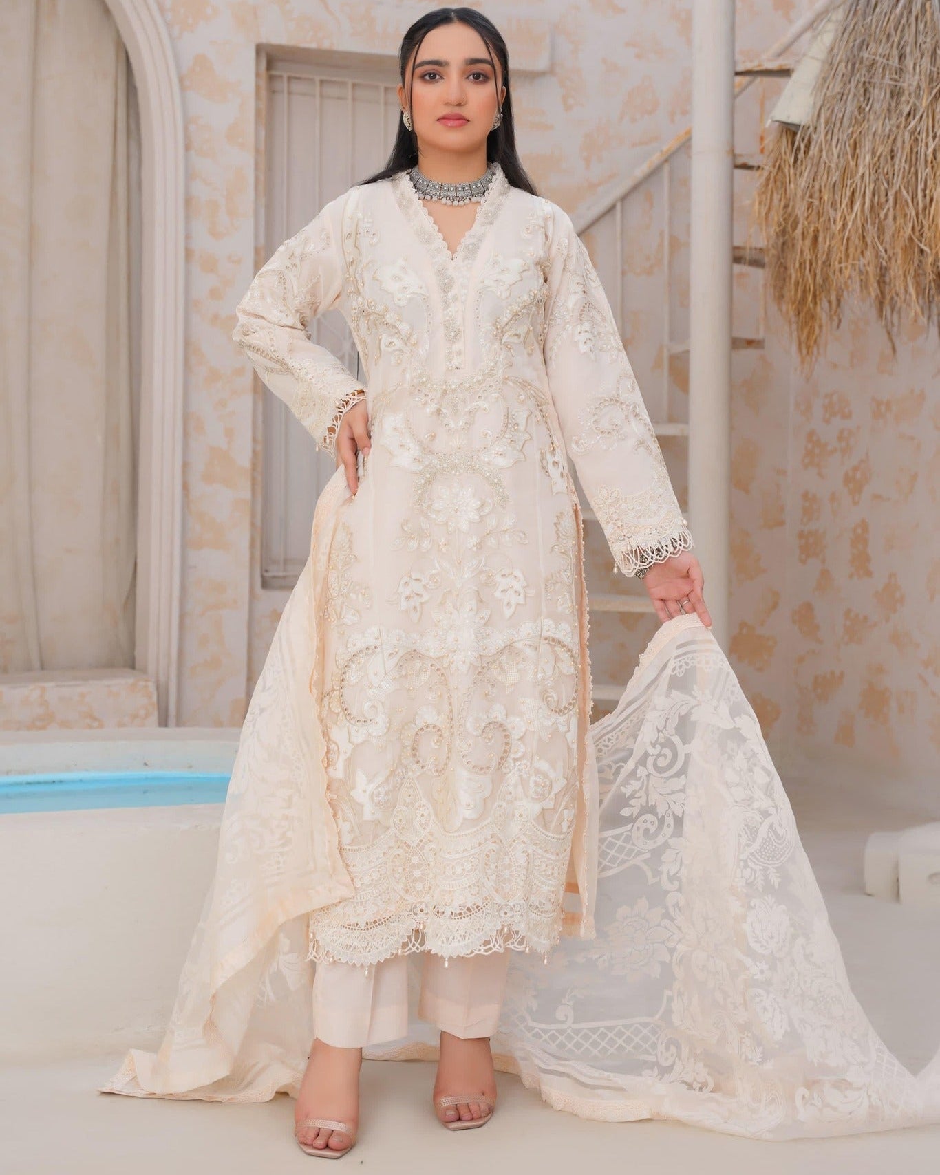 A straight organza shirt crafted for a graceful silhouette, paired with viscose trousers that balance comfort and structure. The matching organza dupatta adds a light, airy charm, making this ensemble perfect for formal evenings and festive gatherings.