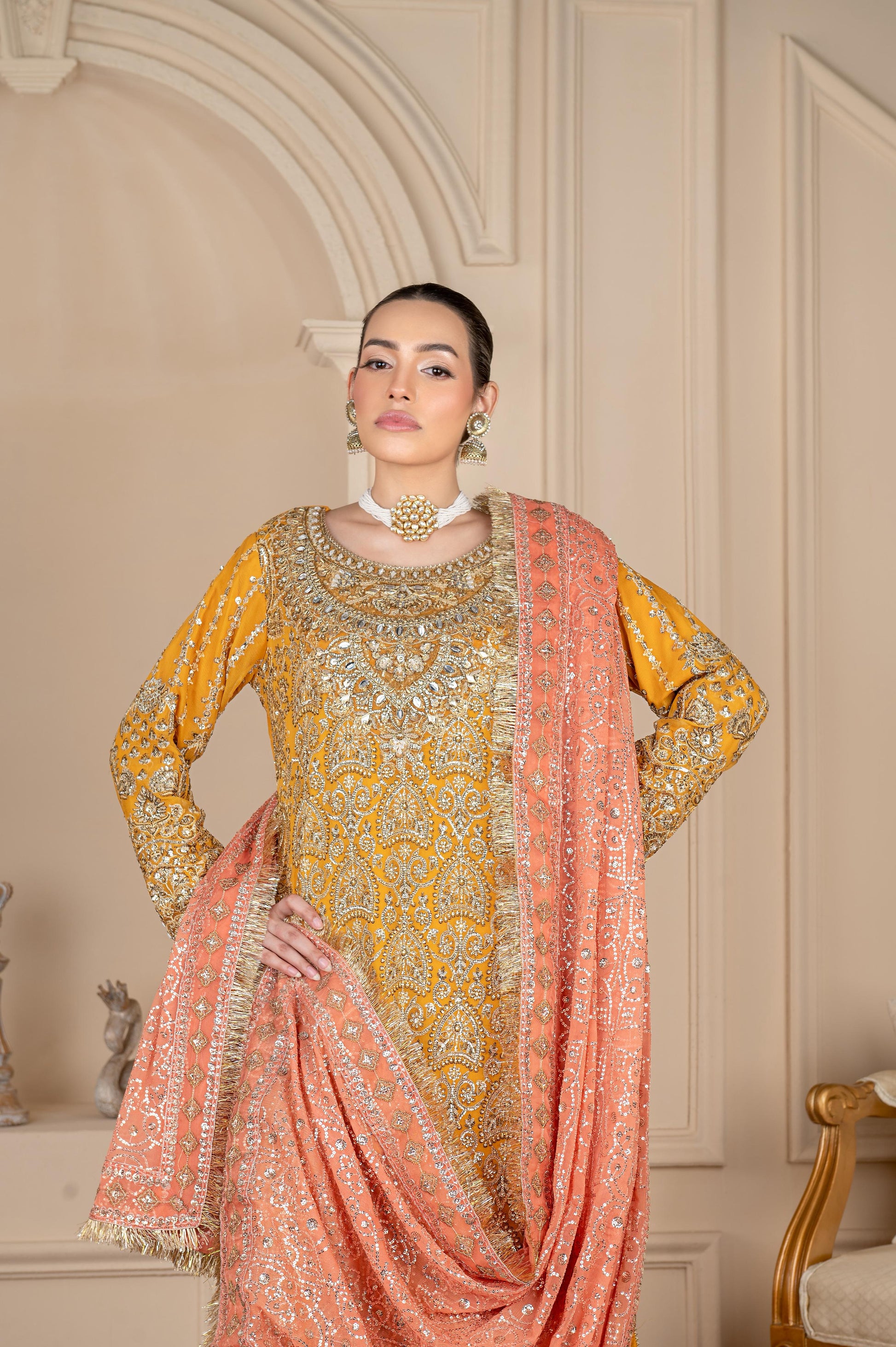 A graceful chiffon shirt adorned with heavy tilla, sequins, and patchwork embroidery, radiating refined charm. Paired with a heavily embroidered chiffon dupatta and a grip sharara enhanced with intricate embellishments—perfect for making a statement at festive and formal gatherings.