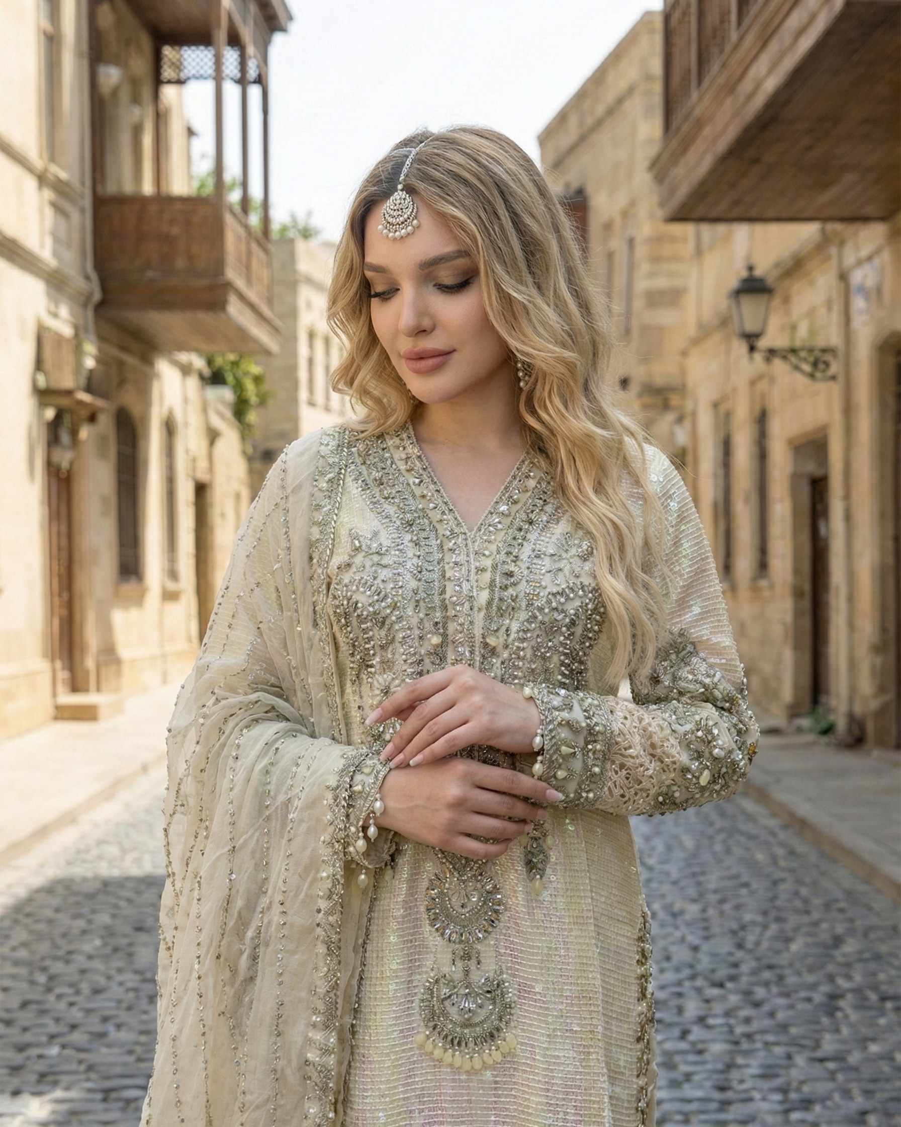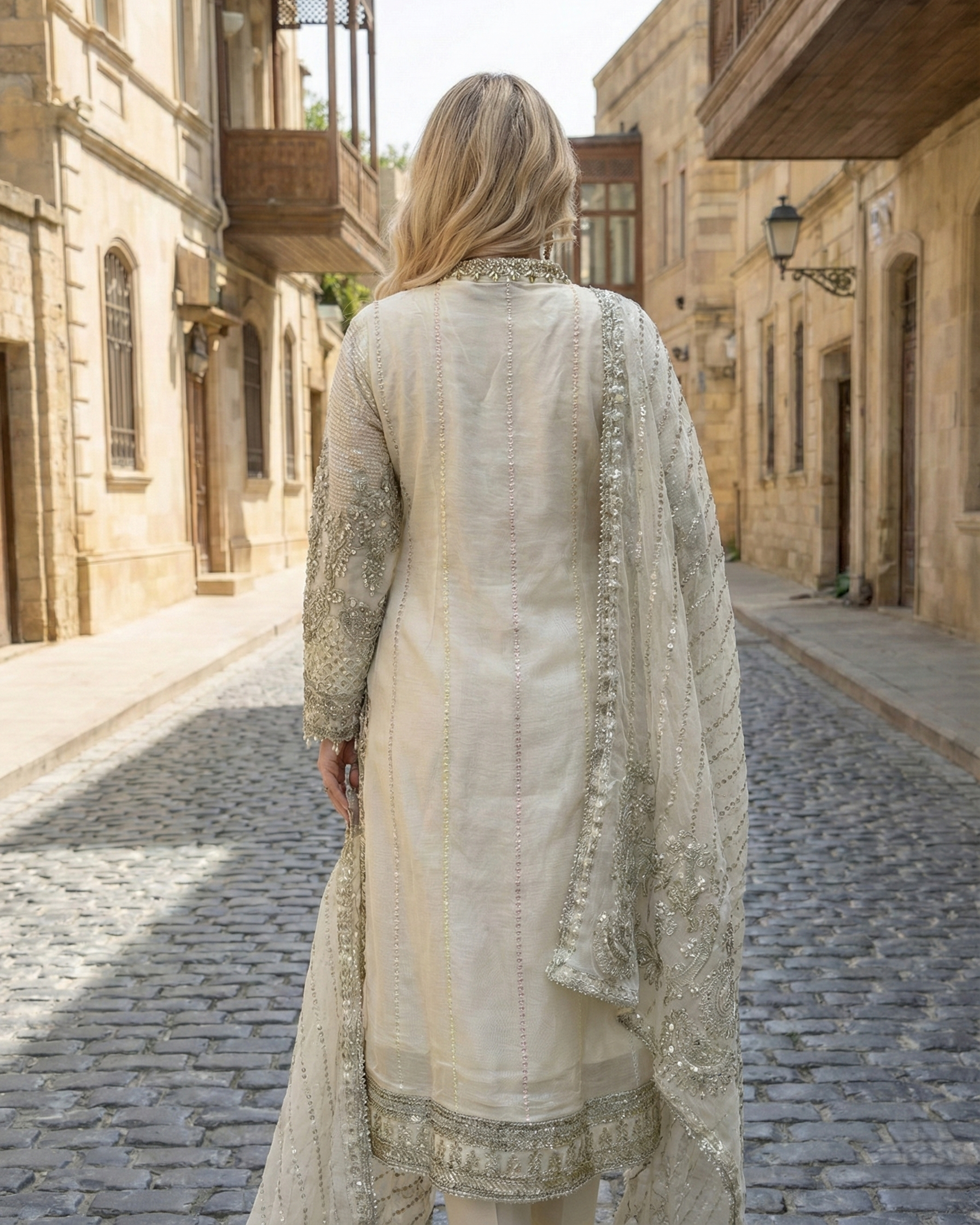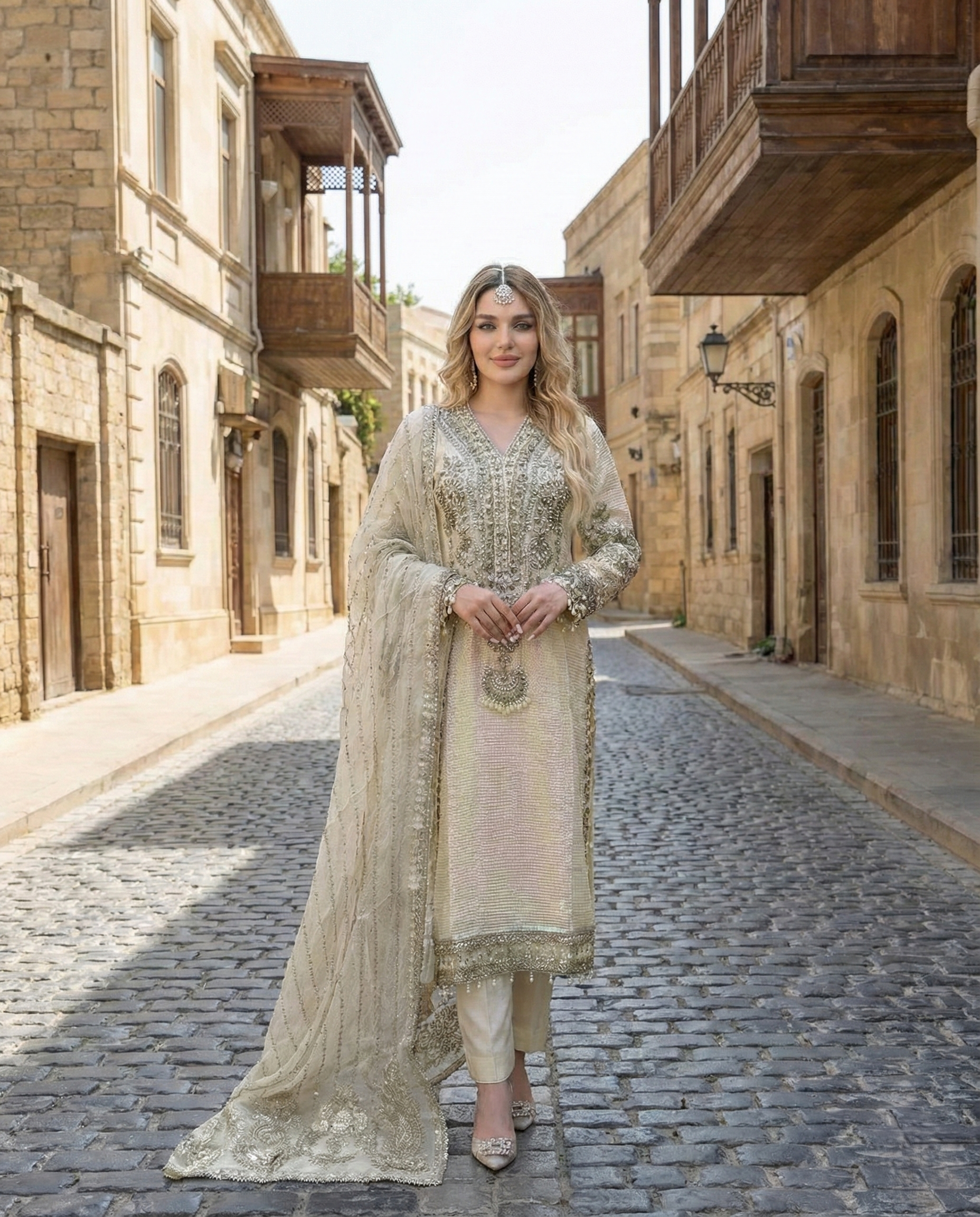 A fully embroidered chiffon shirt, delicately adorned with tilla, sequins, and patchwork, exuding timeless charm. Paired with smooth viscose trousers for effortless comfort and a matching embroidered chiffon dupatta that adds an elegant finish—perfect for any special gathering.
