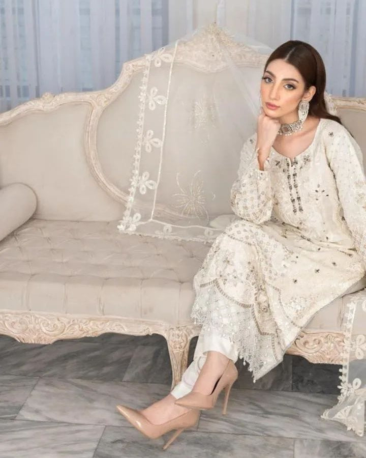 A statement piece that radiates charm — this chiffon shirt comes fully embroidered with delicate tilla, shimmering sequins, and intricate stone work, making it perfect for special occasions. The fully embroidered net dupatta adds a graceful touch, while the embellished grip shalwar completes the look with a refined finish.