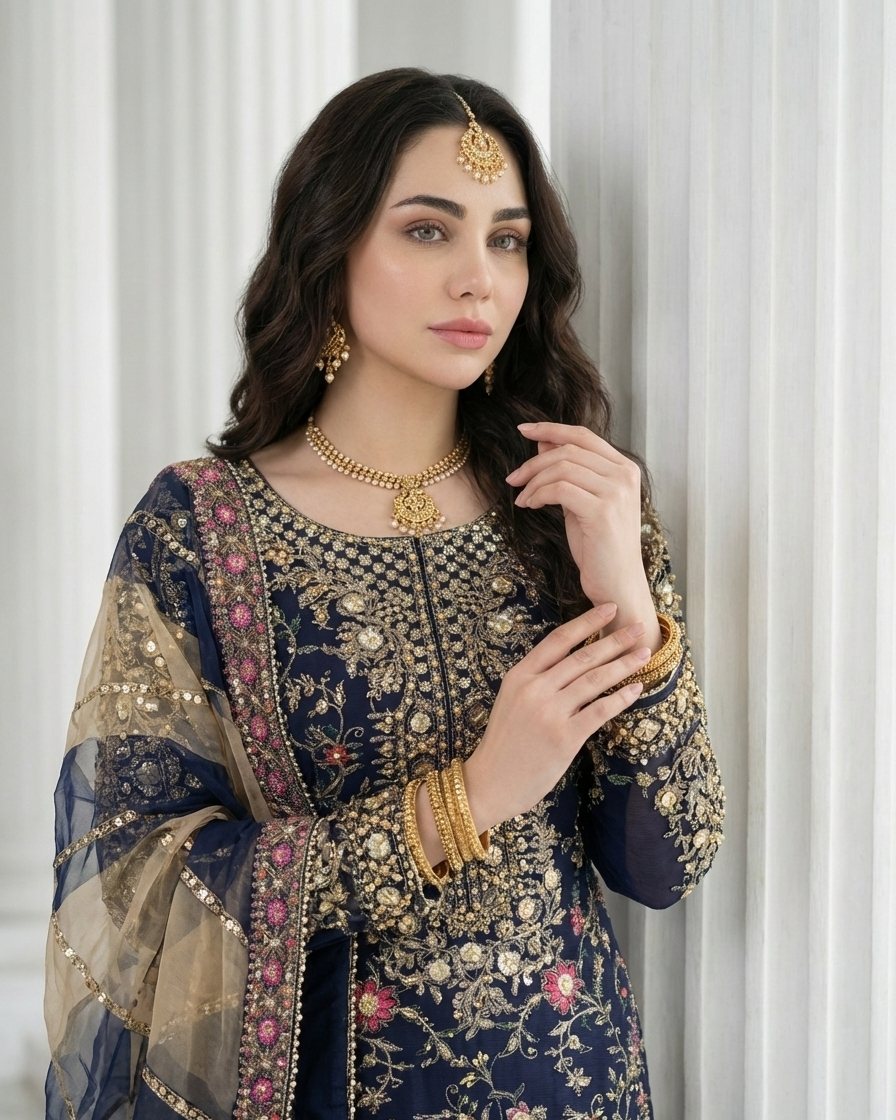 An elegant blend of fabrics crafted for modern grace. The chiffon shirt brings a soft, flowy charm, paired with viscose trousers for comfort and structure. The organza dupatta adds a refined, airy touch—perfect for both formal and semi-formal gatherings.